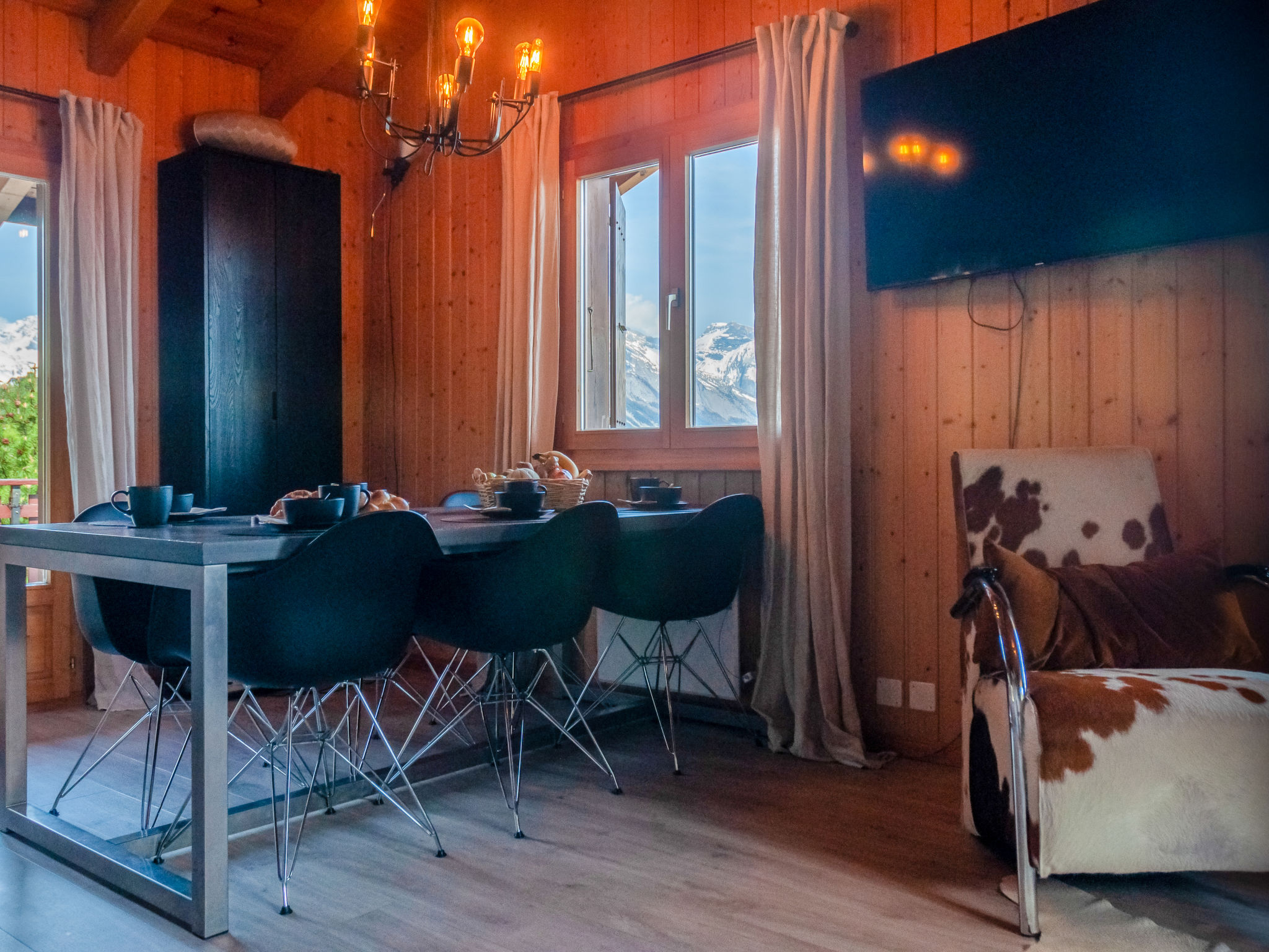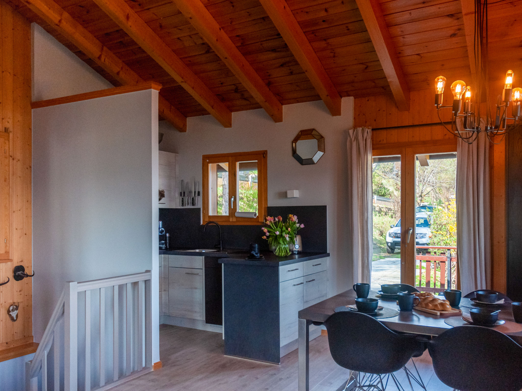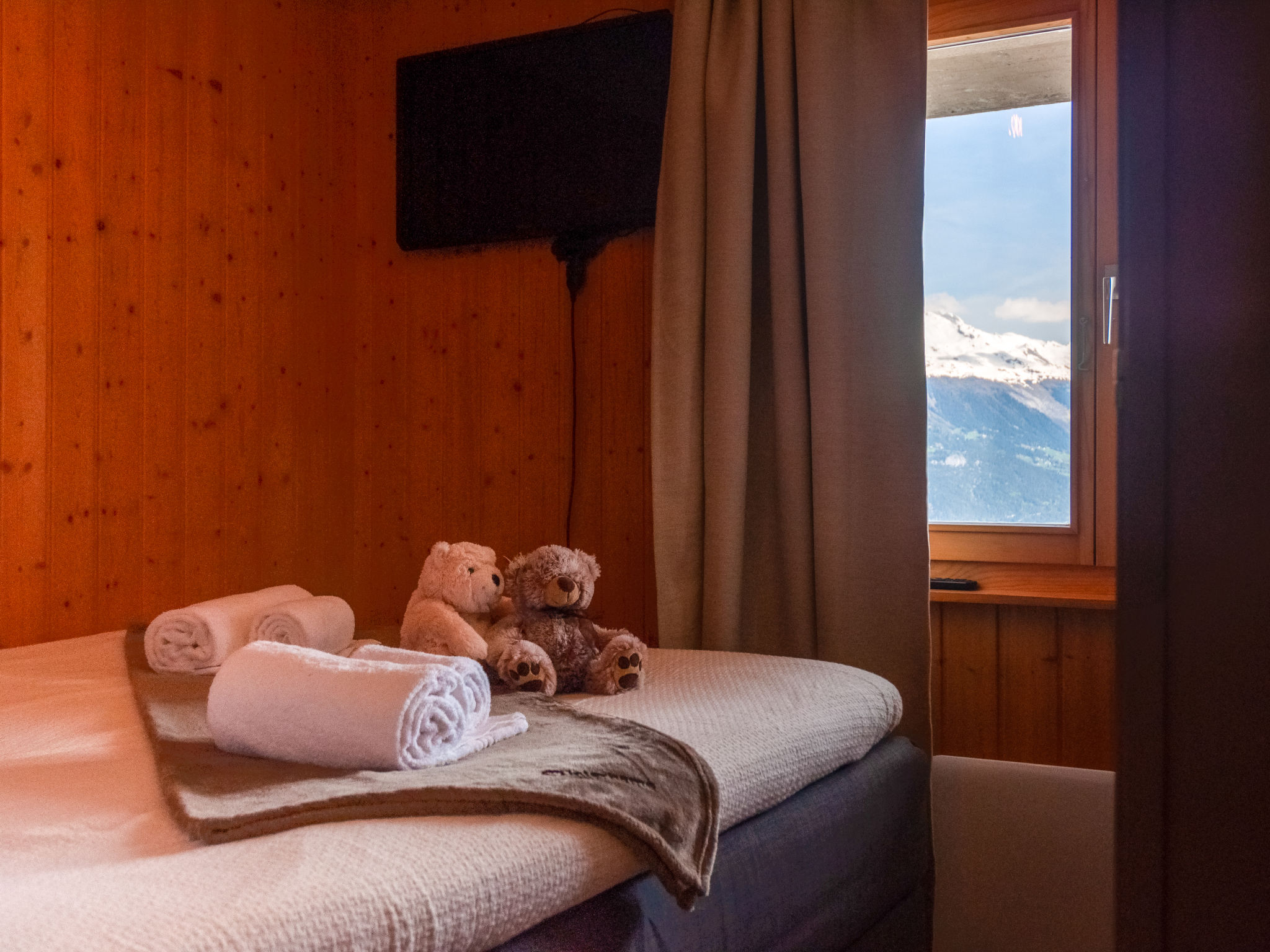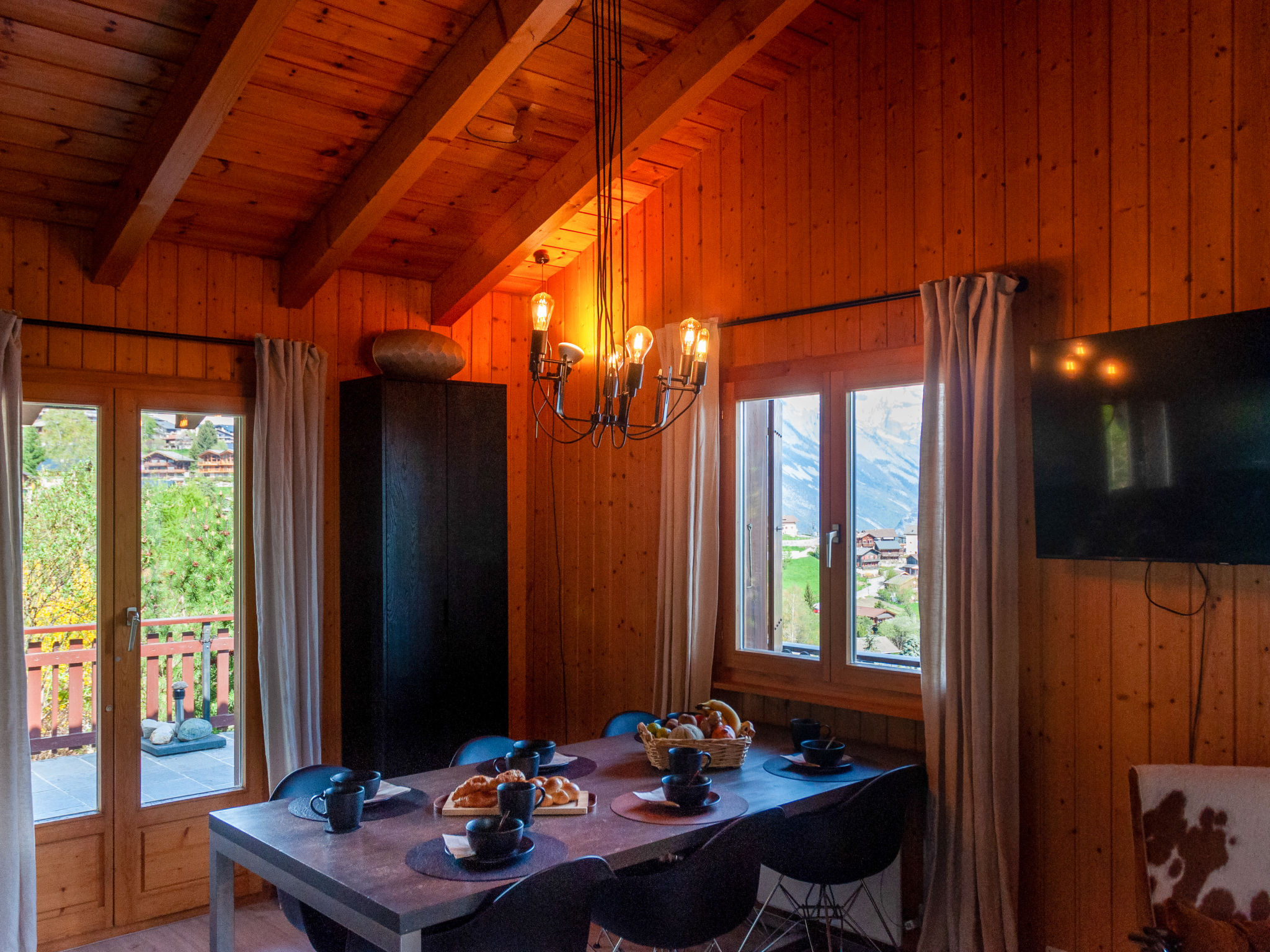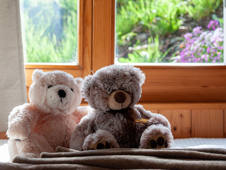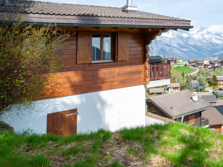 "Dolce Cabane", 4-Zimmer-Chalet 80 m2, Nordwestlage. Sehr komfortabel und romantisch eingerichtet: kleiner Eingang. Wohn-/Esszimmer mit Schwedenofen und Kabel-TV. Ausgang zur Terrasse, Richtung Osten. Offene Küche (Backofen, Geschirrspüler, 4 Glaskeramikplatten, Toaster, Wasserkocher, elektrische Kaffeemaschine, Kapseln für die Kaffeemaschine (nespresso) extra, Fondue Set (Käse)). Dusche/WC. E-Heizung. Unteres Geschoss: 1 Zimmer mit 1 franz. Bett (160 cm, Länge 200 cm). 1 Zimmer mit 1 franz. Bett (140 cm, Länge 200 cm). 1 Zimmer mit 1 franz. Bett (160 cm, Länge 200 cm). Dusche/WC, Sauna. Balkon, Westlage, Terrasse, Nordlage. Terrassenmöbel, Gartengrill, Liegestühle (2). Sehr schöne Sicht auf die Berge und das Tal. Zur Verfügung: Waschmaschine, Wäschetrockner, Haartrockner. Internet (Wireless LAN, gratis). Parkplatz (3 Autos). E-Ladestation. Bitte beachten: Nichtraucher-Unterkunft. 1 kleines Haustier/Hund erlaubt.