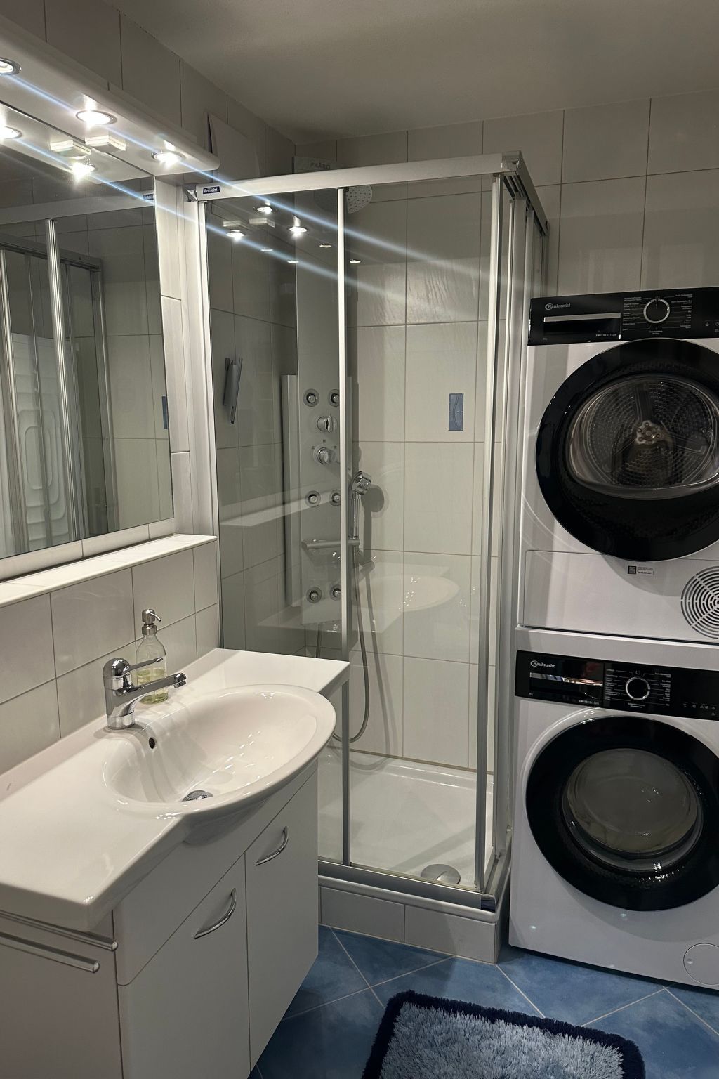 Im inneren Bereich besticht die Wohnung durch praktische Annehmlichkeiten, die Ihren Aufenthalt komfortabel gestalten. Neben einem gemütlichen Schlafzimmer und einem Badezimmer mit Dusche, steht Ihnen eine voll ausgestattete Küche mit Induktionsherd, Kapsel-Kaffeemaschine, Spülmaschine und Wasserkocher zur Verfügung. Für zusätzlichen Komfort sorgen eine Waschmaschine und ein Wäschetrockner zur alleinigen Nutzung.