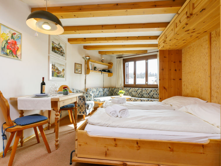 "Residenza Chesa Margun 57-2", 1-Zimmer-Wohnung 31 m2, Südlage. Sehr komfortabel eingerichtet: Wohn-/Esszimmer mit 2 Wandschrankbetten (90 cm, Länge 180 cm), Kabel-TV (Flachbildschirm), Radio. Kochnische (Backofen, Geschirrspüler). Bad/WC. Bitte beachten: Nichtraucher-Unterkunft.