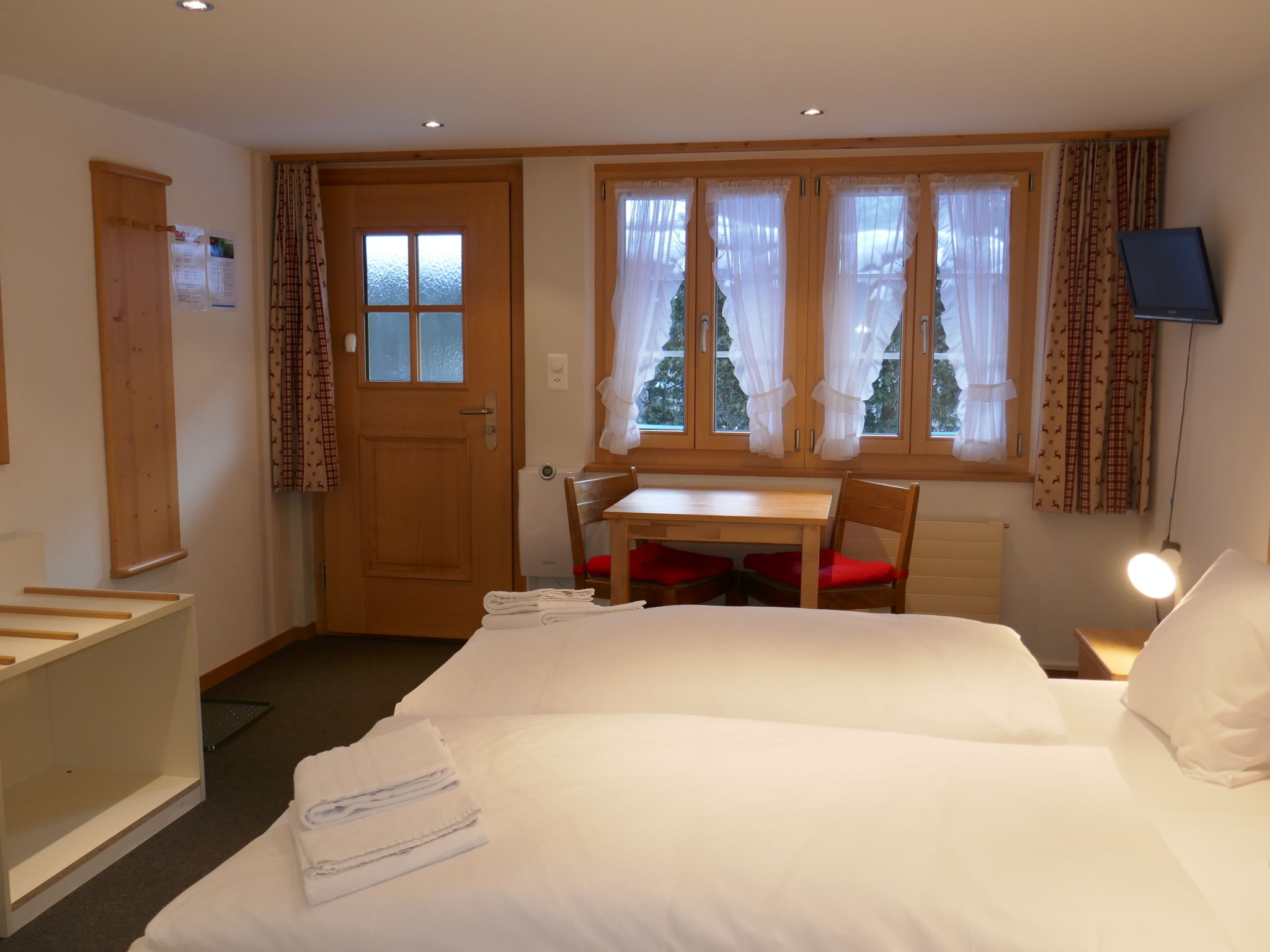 "Schwendihus", 1-Zimmer-Wohnung 25 m2, im Erdgeschoss, Südlage. Zweckmässig und gemütlich eingerichtet: Wohn-/Schlafzimmer mit 1 Doppelbett (2 x 90 cm, Länge 200 cm), Kabel-TV (Flachbildschirm). Ausgang zum Gartensitzplatz, Richtung Süden. Kochnische (2 Kochplatten, Toaster, Wasserkocher, elektrische Kaffeemaschine). Dusche/WC. Schöne Sicht auf die Berge und Eiger. Zur Verfügung: Haartrockner. Internet (WLAN, gratis). Parkplatz beim Haus. Bitte beachten: Wohnung auf Strassenseite. Maximal 1 Haustier/Hund erlaubt. Eigener Eingang, Feuerlöscher.