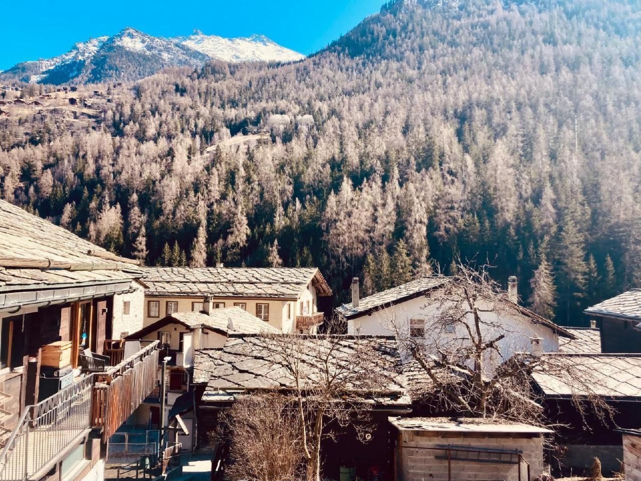 Freuen Sie sich auf den sonnigen Hof der Ferienwohnung, der mit gemütlichen Sitzmöglichkeiten zum Entspannen in der frischen Bergluft einlädt. Die Wohnung befindet sich in einem Mehrfamilienhaus an erhöhter Lage, abseits von Autoverkehr und doch nur ein paar Schritte vom Dorfkern entfernt. Der idyllische Außenbereich ist über das charakteristische Gässchen des Walliserdorfs leicht zu erreichen und verleiht Ihrem Aufenthalt eine ruhige und authentische Atmosphäre.