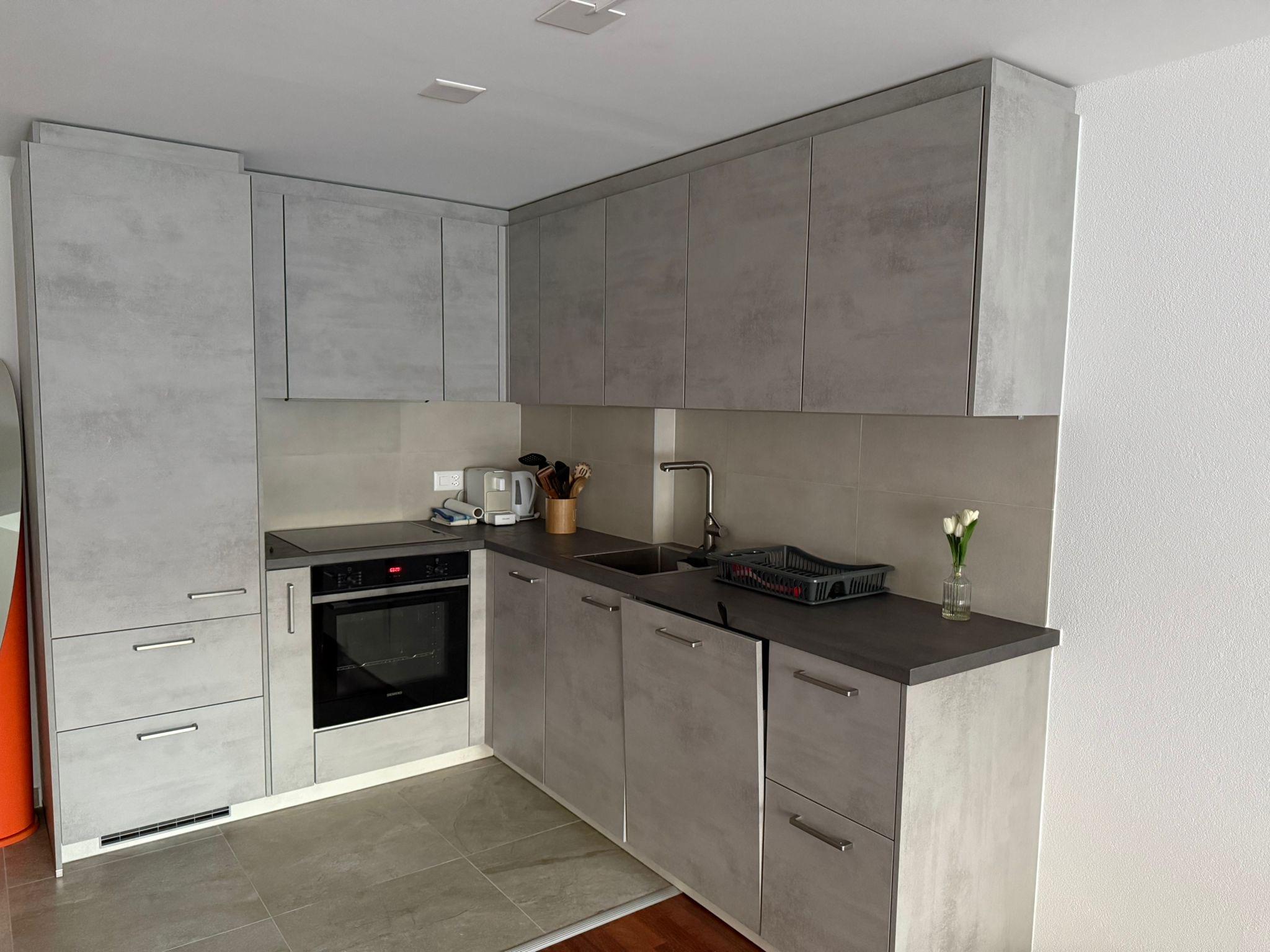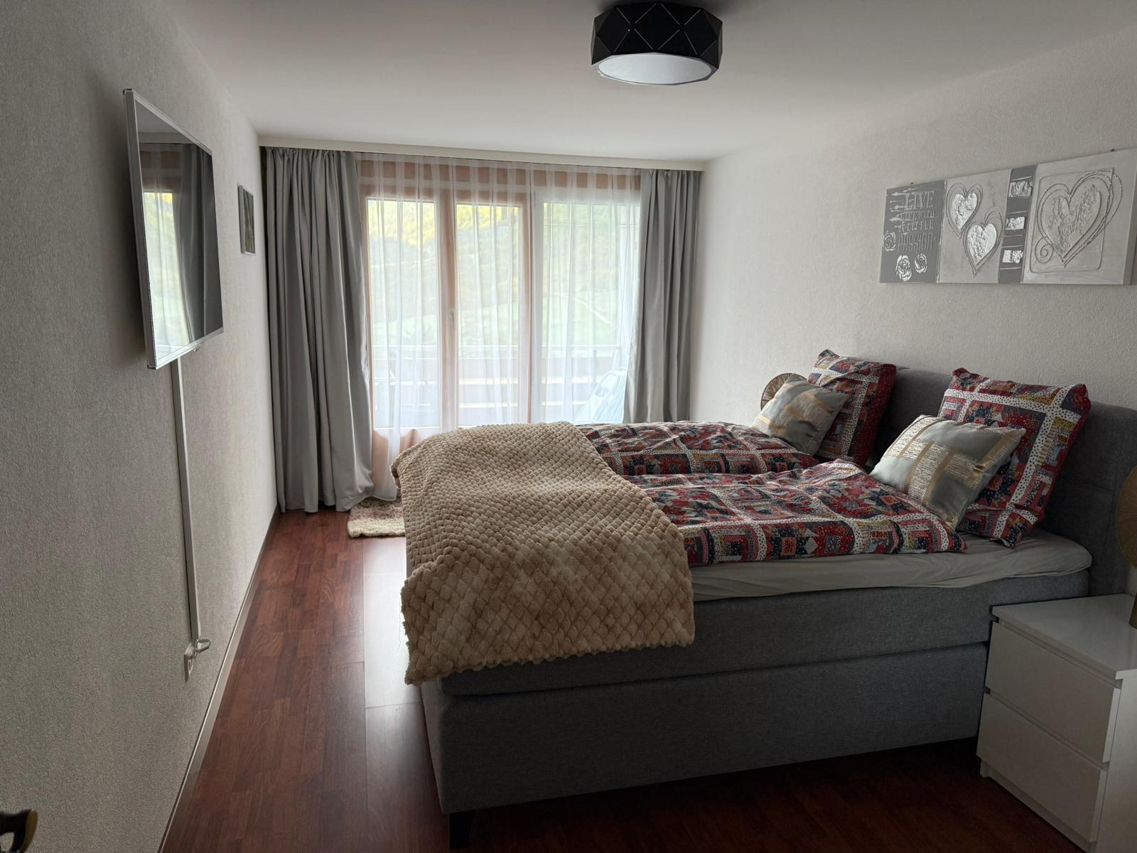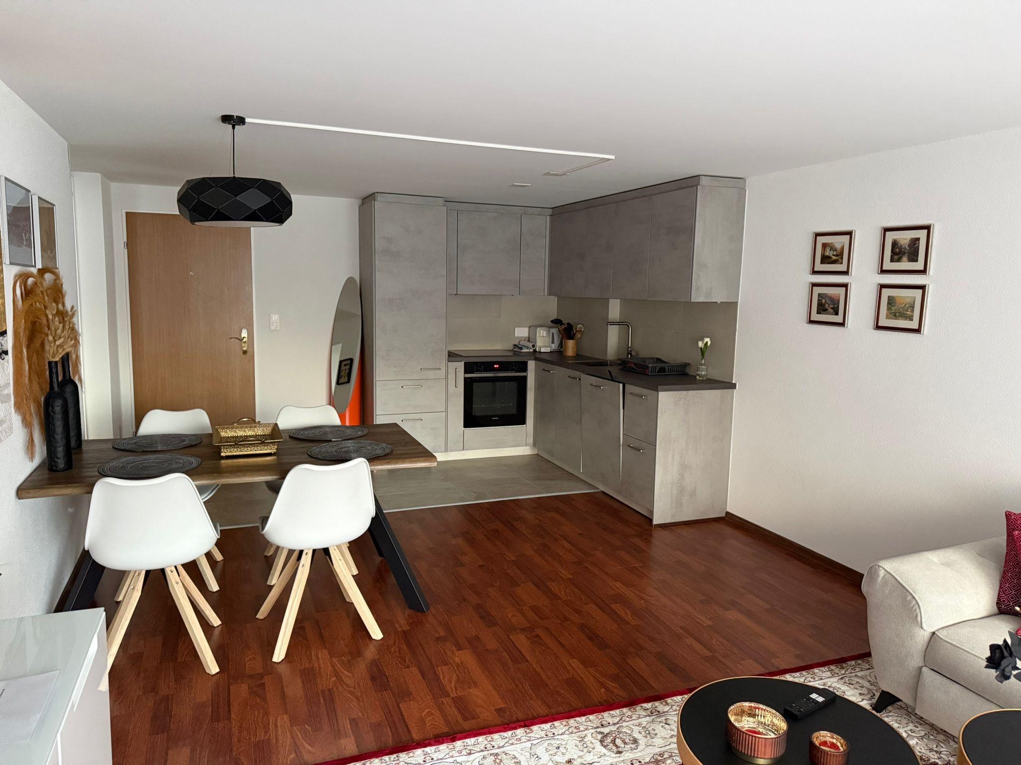 2-Zimmerwohnung (50m2), komplett renoviert: Wohnzimmer mit Doppelsofabett, grosser Flat-TV, Radio, gratis WiFi, komplett ausgestattete, offene Küche mit Geschirrspüler u.v.m., Schlafzimmer mit Boxspringbett, grosszügige Dusche/WC, grosser Süd-Balkon. Garage vorhanden. Ruhige Lage. In nächster Nähe: Haltestelle Ortsbus.