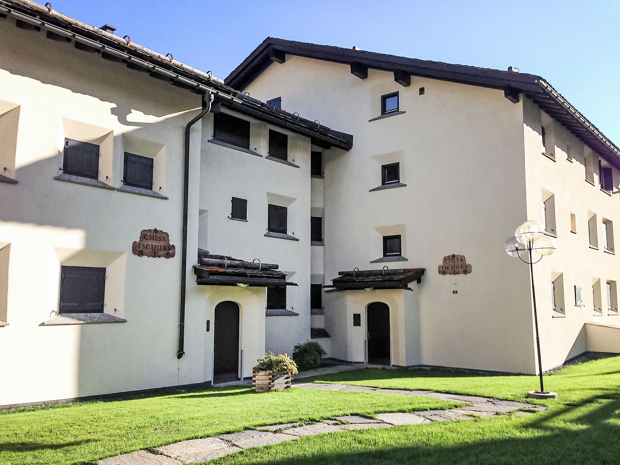 Gemütliches, einfaches Mehrfamilienhaus "Chesa Tschierv II", einseitig angebaut, Baujahr 1980. In einem Wohnquartier, verkehrsberuhigte Zone, 2.4 km vom See, 750 m vom Skigebiet, in einer Sackgasse. Zur Mitbenutzung: Garten 400 m2 (eingezäunt). Im Hause: Zentralheizung, Waschmaschine, Wäschetrockner (zur Mitbenutzung). Gemeinschaftsgarage, extra. Einkaufsgeschäft 350 m, Supermarkt, Restaurant 300 m, Bäckerei, Café 350 m, Fahrradverleih 300 m, Bushaltestelle "Celerina, Cresta Palace" 260 m, Bahnstation "Celerina" 600 m, Hallenbad 4.4 km, See St. Moritzer See 2.4 km. Golfplatz (18 Loch) 3.7 km, Surfschule 9 km, Tennis 300 m, Tennishalle 4.6 km, Minigolf 4.4 km, Reitstall 4.9 km, Wanderwege ab Haus, Radweg 500 m, Luftseilbahn 750 m, Skilift 750 m, Skipisten, Skiverleih 400 m, Skibushaltestelle 190 m, Skischule, Kinderskischule, Schlittelbahn 2.1 km, Langlaufloipe 1.2 km, Eisfeld 300 m, Kinderspielplatz 500 m. Nahe gelegene Sehenswürdigkeiten: Olympia Bob Run mit Bobmuseum 2.4 km, Kirche San Gian 1.2 km, Segantini Museum in St. Moritz 3.8 km, Museum Alpin in Pontresina 5.4 km, Bernina Express UNESCO Welterbe. Bekannte Skigebiete sind gut erreichbar: Corviglia Piz Nair 750 m, Corvatsch - Furtschellas 10.3 km, Diavolezza - Lagalb 16.2 km. Bekannte Seen in der Umgebung sind gut erreichbar: St. Moritzer See 2.4 km, Silvaplaner See 9 km, Silser See 12.9 km. Wandergebiete: Stazerwald & Stazersee, Corviglia Piz Nair, Muottas Muragl. Bitte beachten: kein Fahrstuhl vorhanden. Gratis Skibus. Der gratis Skibus fährt zum Skigebiet Parkplatz Talstation Marguns (Corviglia).