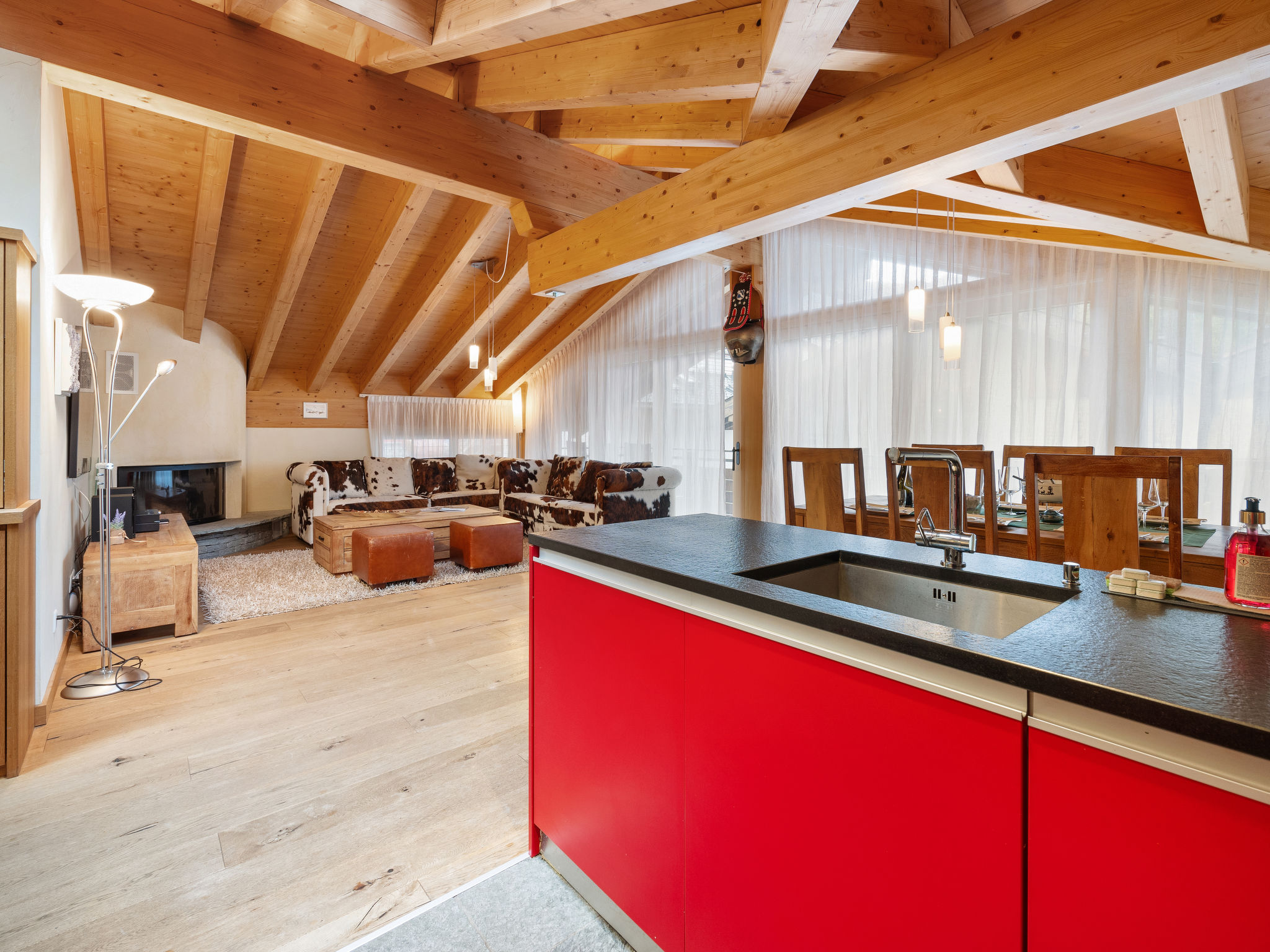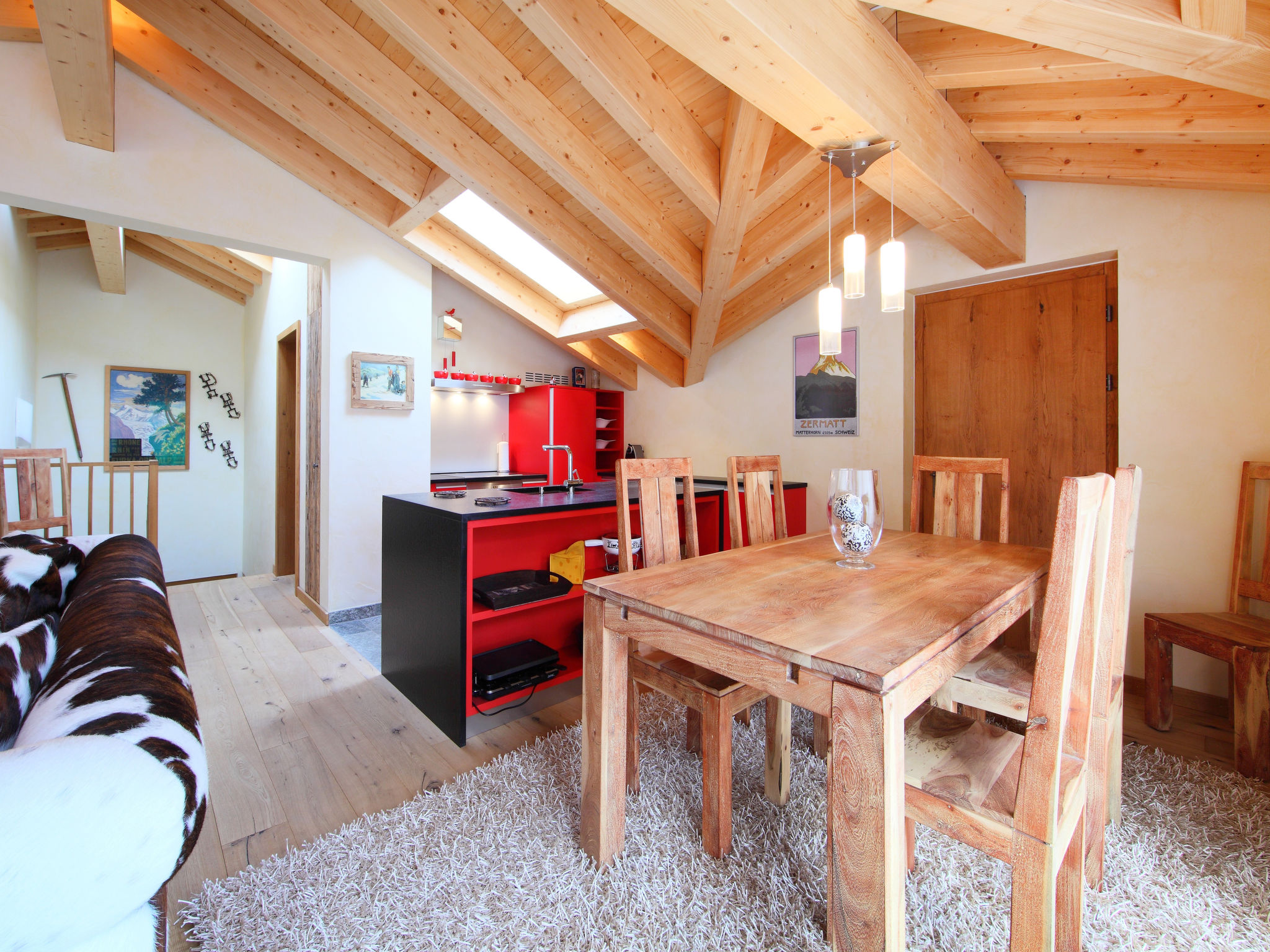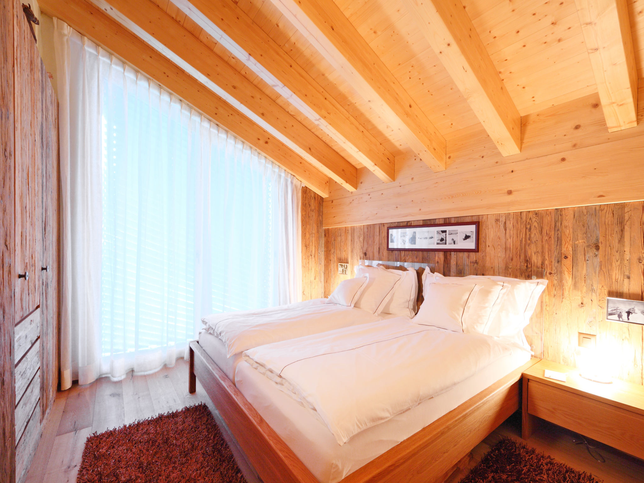 8-Zimmer-Wohnung 255 m2 auf 2 Stockwerken im 3. Stock. Luxuriös und gemütlich eingerichtet: 2 Doppelzimmer, jedes Zimmer mit 1 Doppelbett und TV. Wohn-/Esszimmer mit offenem Kamin, Esstisch, TV, Radio, CD und DVD. Ausgang zum Balkon. Offene Küche (Backofen, Geschirrspüler, 4 Induktionskochplatten, Toaster, Wasserkocher, Tiefkühler, elektrische Kaffeemaschine, Kapseln für die Kaffeemaschine (Nespresso) extra, Racletteofen, Fondue Set (Käse)). 2 Bäder/WC, Whirlbadewanne. Unteres Geschoss: 3 Doppelzimmer, jedes Zimmer mit 1 Doppelbett. 1 Zimmer mit 2 Betten (90 cm, Länge 200 cm). 2 Bäder/WC, Whirlbadewanne. Balkon 14 m2, Südlage Balkon 12 m2, Südlage. Balkonmöbel. Sicht auf das Matterhorn. Zur Verfügung: Safe, Haartrockner. Internet (WLAN, gratis). Bitte beachten: Nichtraucher-Unterkunft. Kombination (Verbindungstür) aus 2 Duplex Wohnungen.