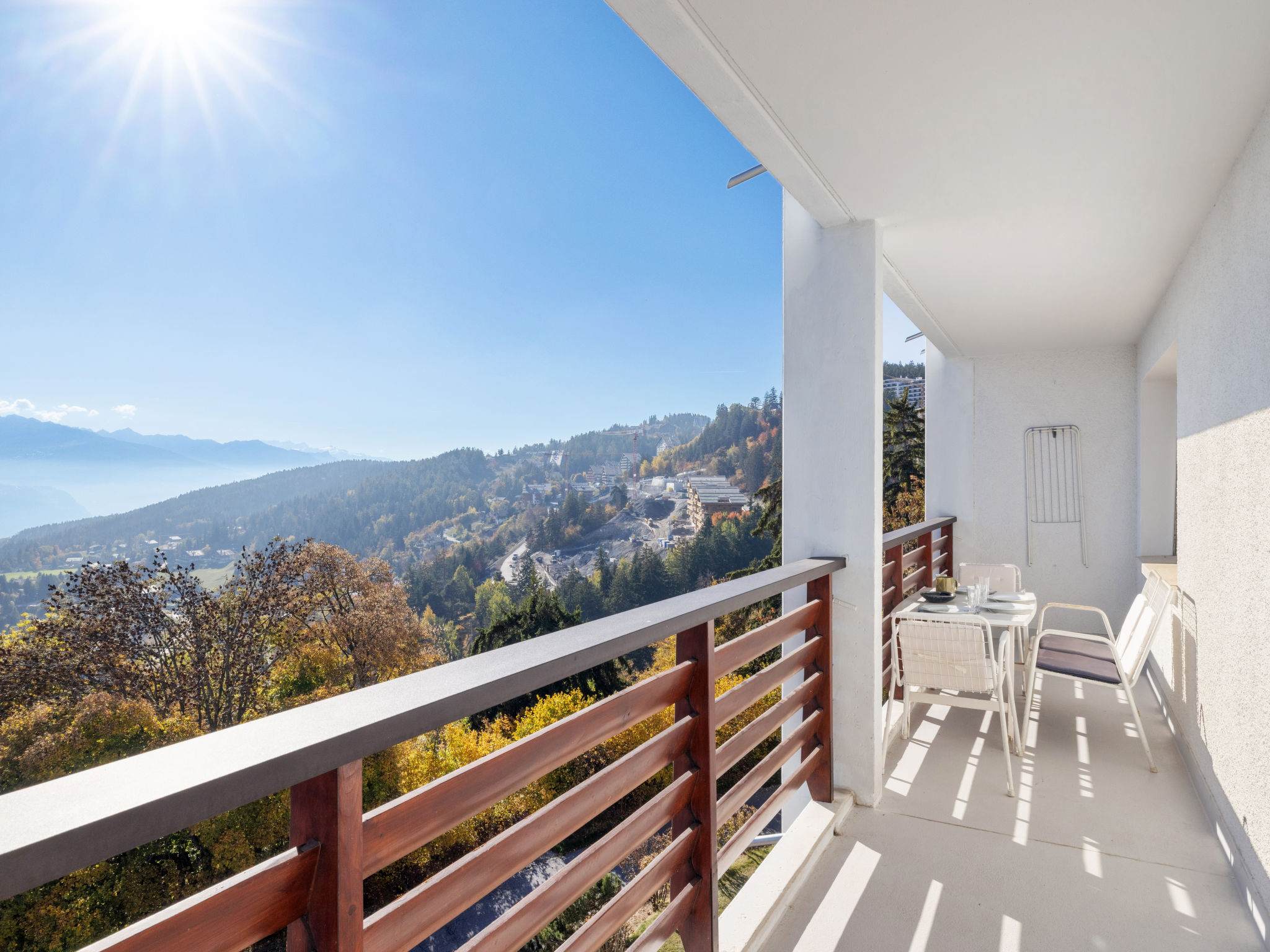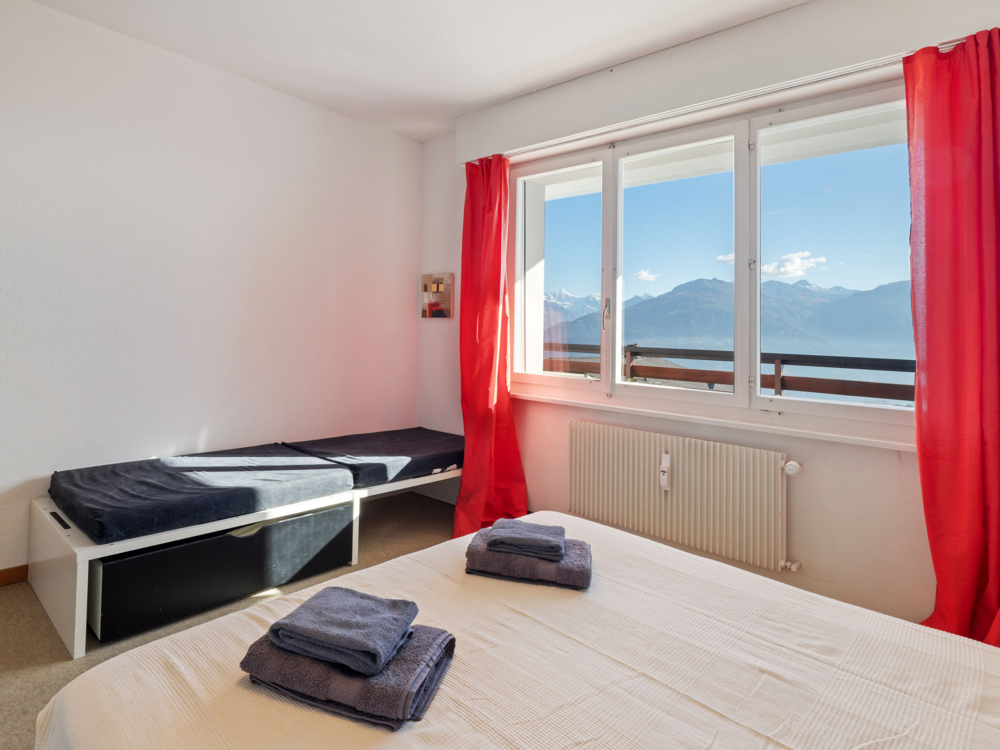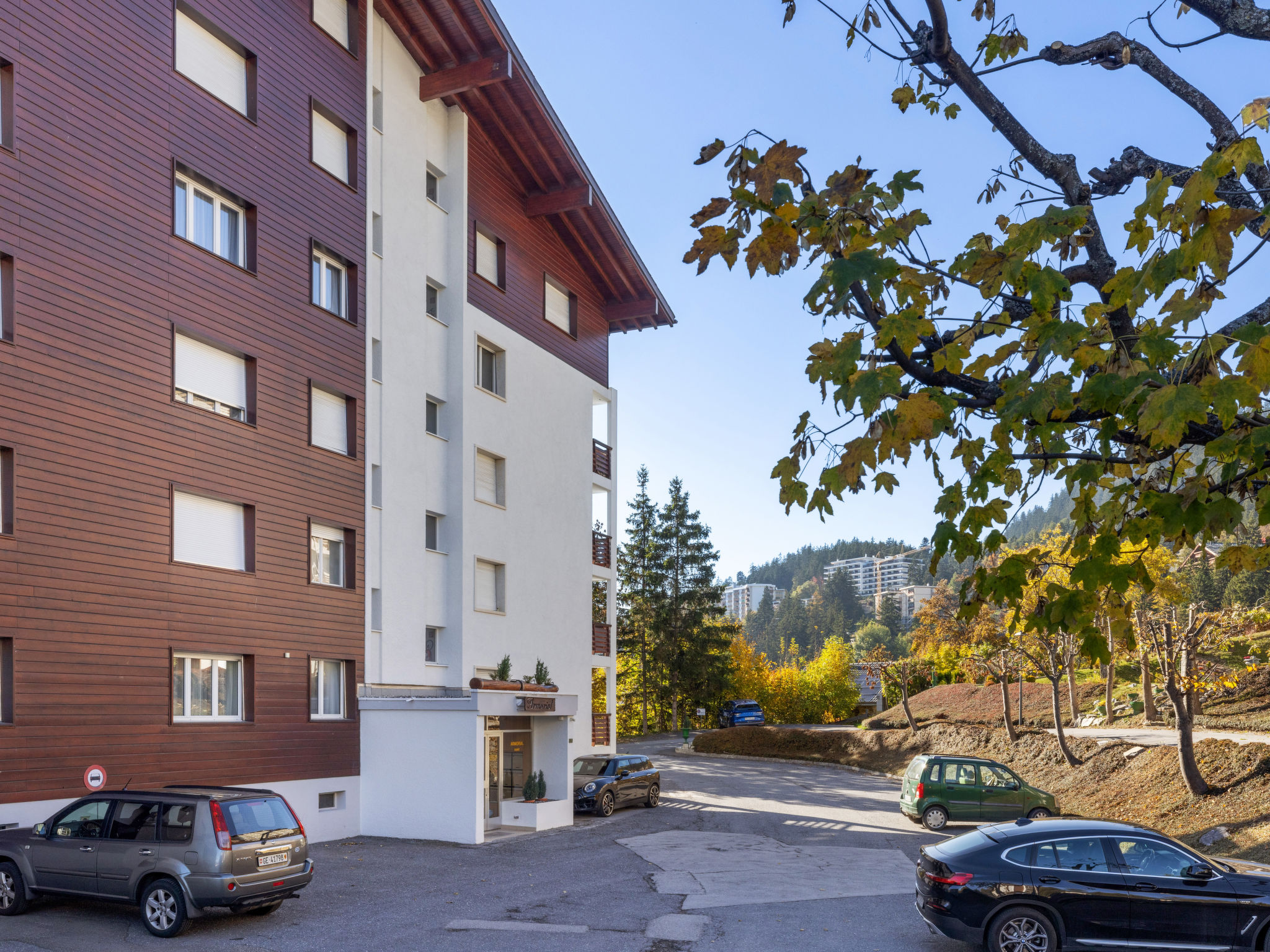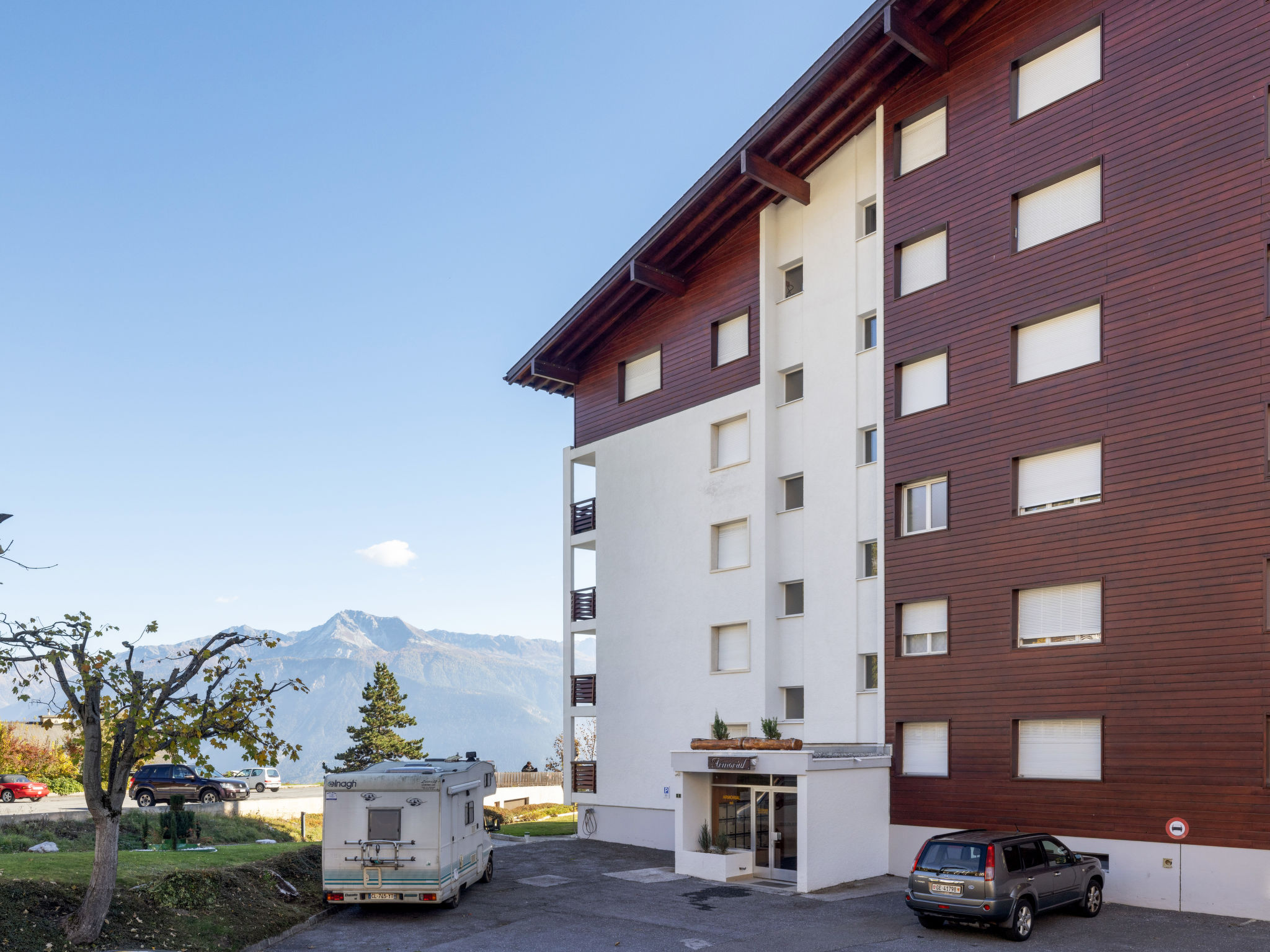 Residenz "Armorial Est / Ouest", auf 5 Stockwerken. Im Ortsteil Combaz, 1.5 km vom Zentrum von Montana, ruhige, sonnige Lage, verkehrsberuhigte Zone, 2.1 km vom See, 1.2 km vom Skigebiet, Richtung Süden. In der Anlage: Tischtennis, Fahrstuhl, Skiraum, Zentralheizung, Waschmaschine, Wäschetrockner (zur Mitbenutzung, extra). Parkplatz (beschränkte Anzahl) beim Haus. Einkaufsgeschäft 1.5 km, Supermarkt 1.5 km, Restaurant 1.5 km, Bäckerei 750 m, Bushaltestelle "Comba" 300 m, Bahnstation "Funiculaire Montana Gare" 1.1 km, Badesee "Moubra" 2.5 km. Golfplatz (18 Loch) 3.5 km, Tennis 2.5 km, Sportzentrum 2.5 km, Skisportanlagen 1.2 km, Langlaufloipe 2.5 km, Eisfeld 1.9 km. Bekannte Seen in der Umgebung sind gut erreichbar: Grenon 2.1 km, Etang Long 3.6 km. Bitte beachten: Gratis Skibus. Weitere Unterkünfte sind buchbar.