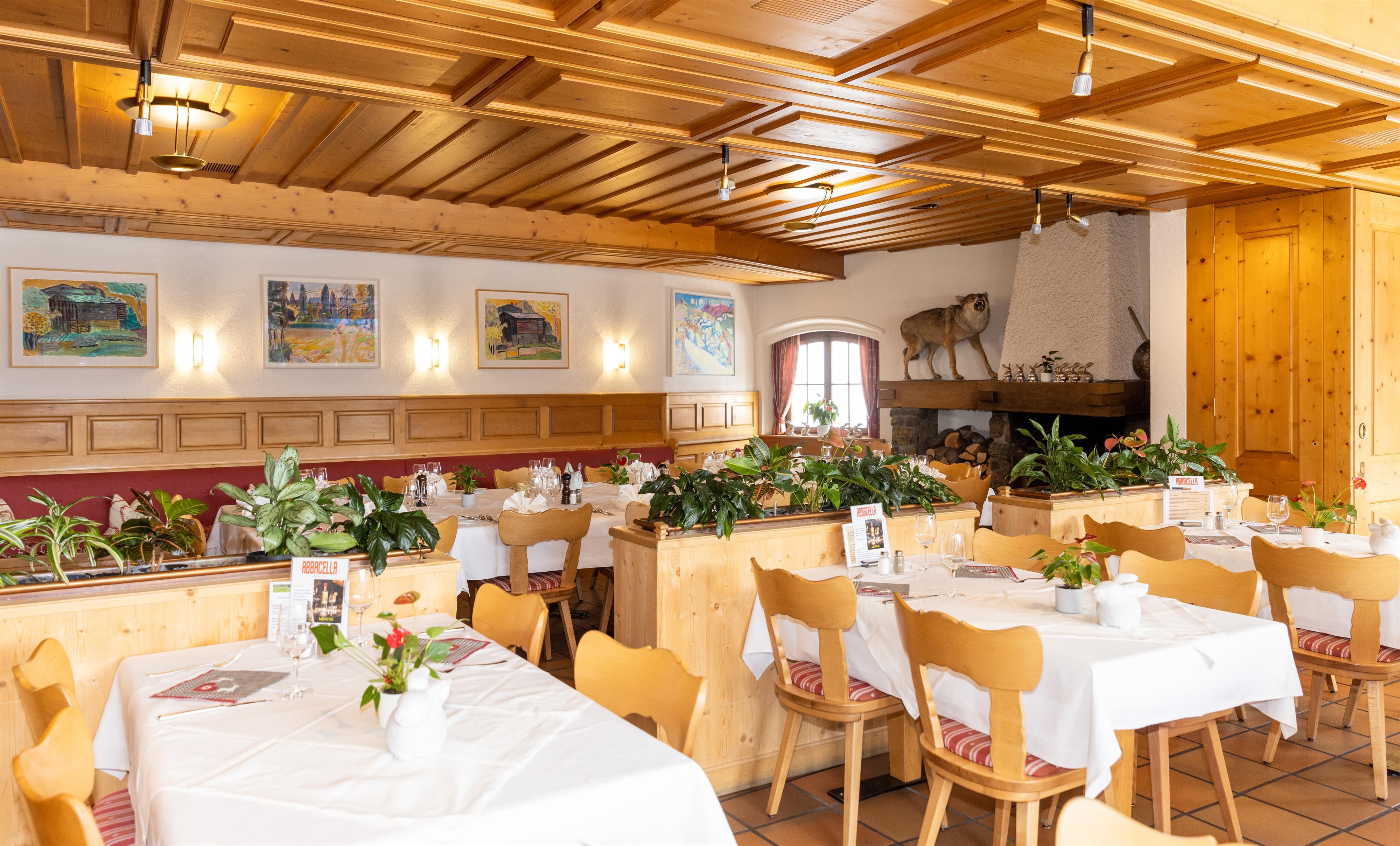 Im Restaurant, zu dem eine große Sonnenterrasse gehört, genießen Sie Gerichte der regionalen und der klassischen Schweizer Küche.