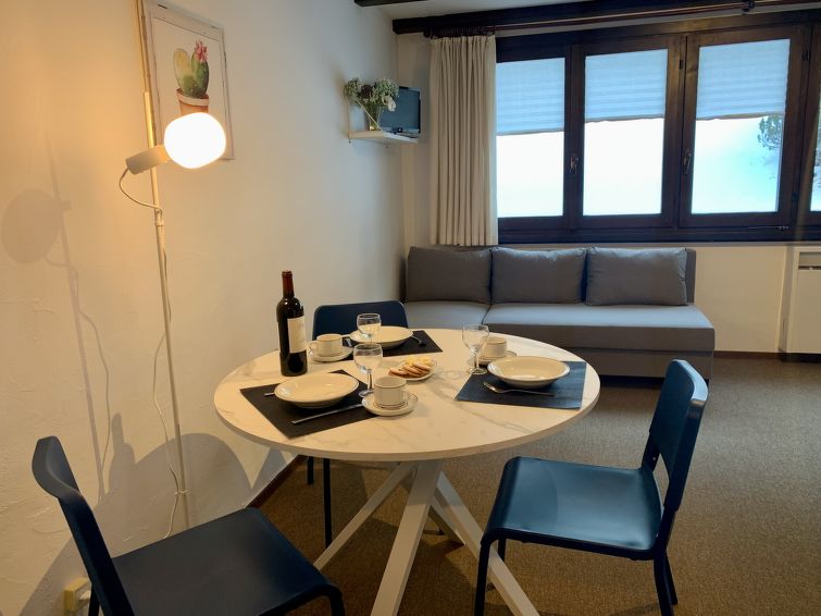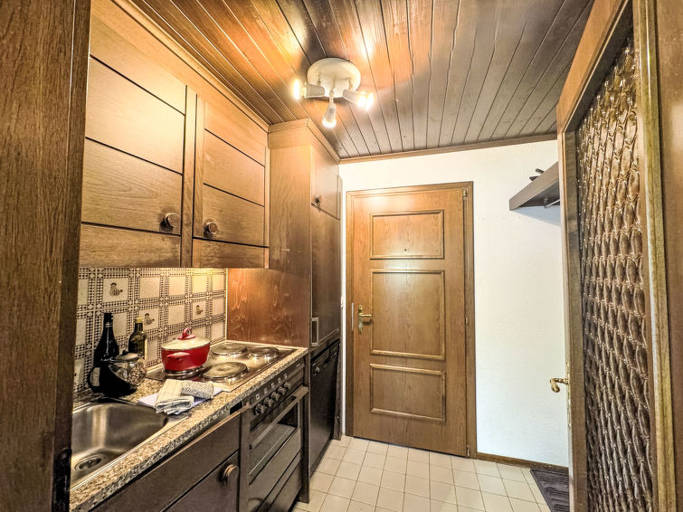 "Apt. 33-1", 1-Zimmer-Wohnung 32 m2, im Erdgeschoss, Nordlage. Objekt geeignet für 2 Erwachsene + 1 Kind. Komfortabel und gemütlich eingerichtet: Wohn-/Esszimmer mit 1 Diwanbett (140 cm, Länge 190 cm), 1 Doppelwandschrankbett (160 cm, Länge 190 cm), Digital-TV und Flachbildschirm. (4 Kochplatten, Backofen, Geschirrspüler, Tiefkühler, elektrische Kaffeemaschine) mit 1 Diwanbett (130 cm, Länge 190 cm). Dusche/WC. Heizung. Teppichboden. Zur Verfügung: Internet (WLAN, gratis). Garage (1 Auto), Höhe 203 cm, Breite 350 cm. Bitte beachten: Wohnung auf Hofseite. Maximal 1 Haustier/Hund erlaubt.
