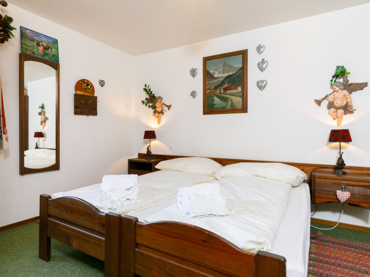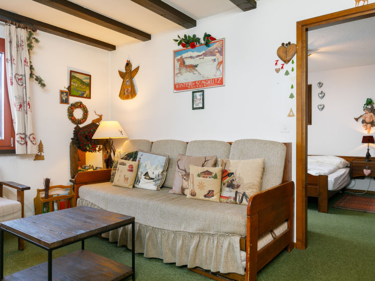 "Residenza Chesa Margun 13-5", 2-Zimmer-Wohnung 53 m2, im Erdgeschoss, Südlage. Zweckmässig und gemütlich eingerichtet: Wohn-/Esszimmer mit 1 Diwanbett (140 cm, Länge 190 cm), Esstisch und Sat-TV. 1 Zimmer mit 2 Betten. Kleine Kochnische im Eingang (4 Kochplatten, Backofen, Geschirrspüler, Mikrowelle). Bad/WC. Heizung. Sicht auf die Ortschaft. Zur Verfügung: Internet (WLAN, gratis). Garage. Maximal 1 Haustier/Hund erlaubt. Bitte beachten: Raucher Wohnung.