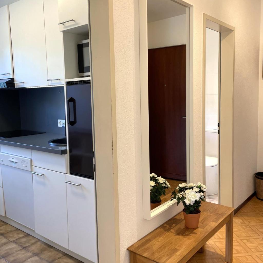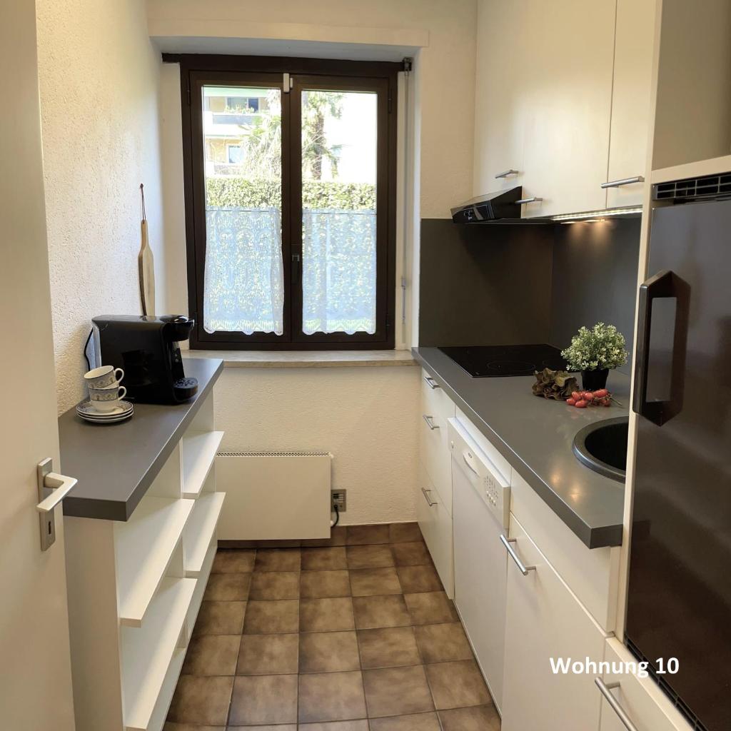 Die Küche ist ausgestattet mit einem Kühlschrank und einem Geschirrspüler, einem Ofen sowie einer Kaffeemaschine und einem Wasserkocher.