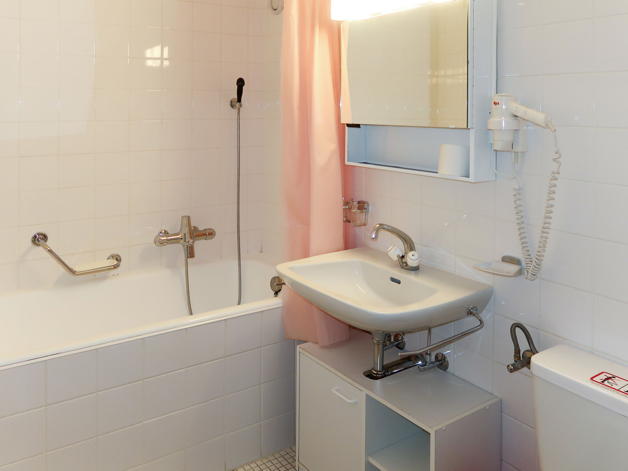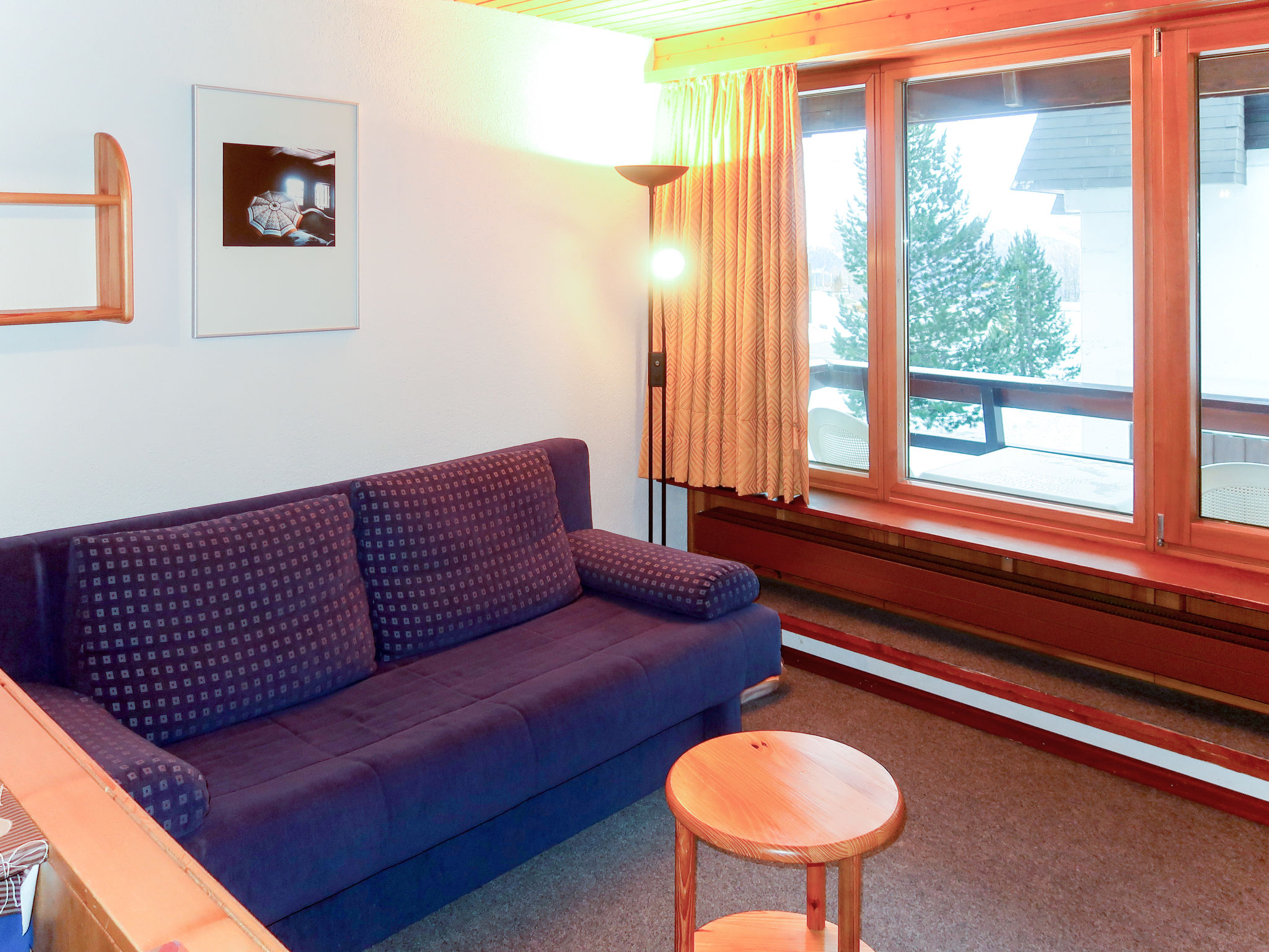 "Résidence Dixence", 1-Zimmer-Studio im 1. Stock. Zweckmässig eingerichtet: Wohn-/Schlafzimmer mit 1 Doppeldiwanbett (160 cm, Länge 200 cm), Essecke und Kabel-TV. Ausgang zum Balkon. Offene Küche (2 Kochplatten). Bad/WC. Balkon. Balkonmöbel. Zur Verfügung: Internet (Wireless LAN, extra). Bitte beachten: Nichtraucher-Unterkunft.