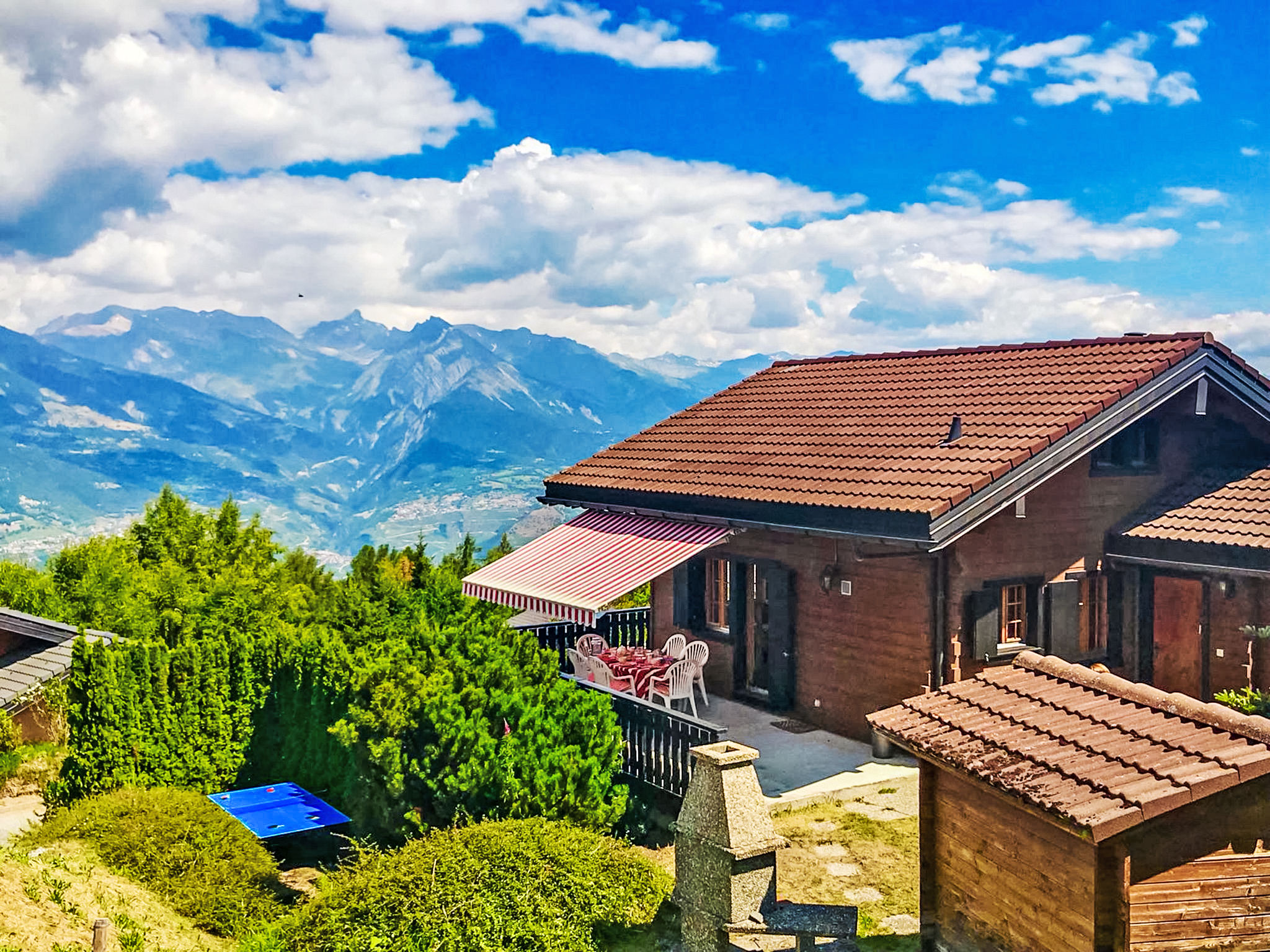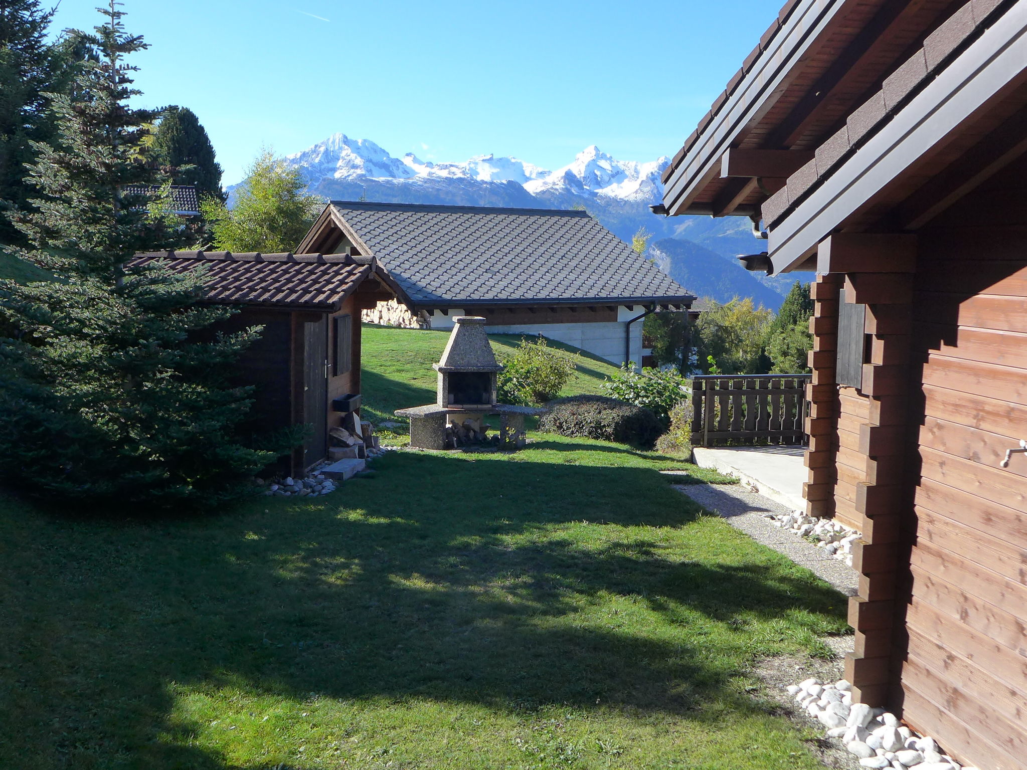 Tzamandon: Gemütliches Chalet "Bivak", auf 3 Stockwerken. Am Ortsrand. Zur Alleinbenutzung: Garten mit Rasen. Tischtennis, Terrasse, Gartenmöbel, Grill. Im Hause: Skischuhtrockner. Zufahrt bis zum Haus. Treppenweg (18 Stufen) bis zum Haus. Einkaufsgeschäft 900 m, Restaurant 50 m, Bushaltestelle "Haute-Nendaz, station/poste" 1.4 km, Bahnstation "Sion" 17.2 km, Freibad 500 m. Golfplatz (18 Loch) 18 km, Gondelbahn 1 km, Skibushaltestelle 50 m.