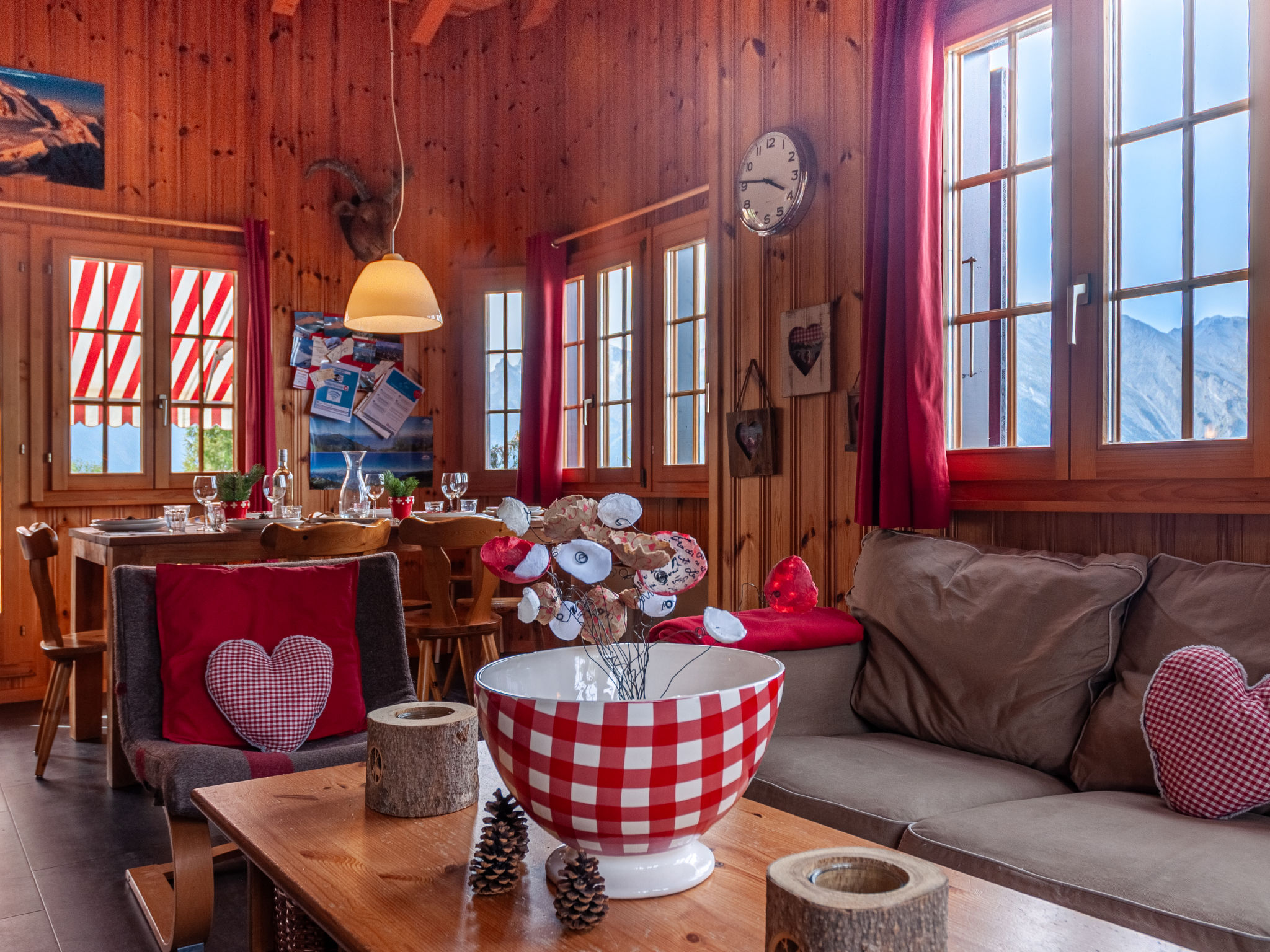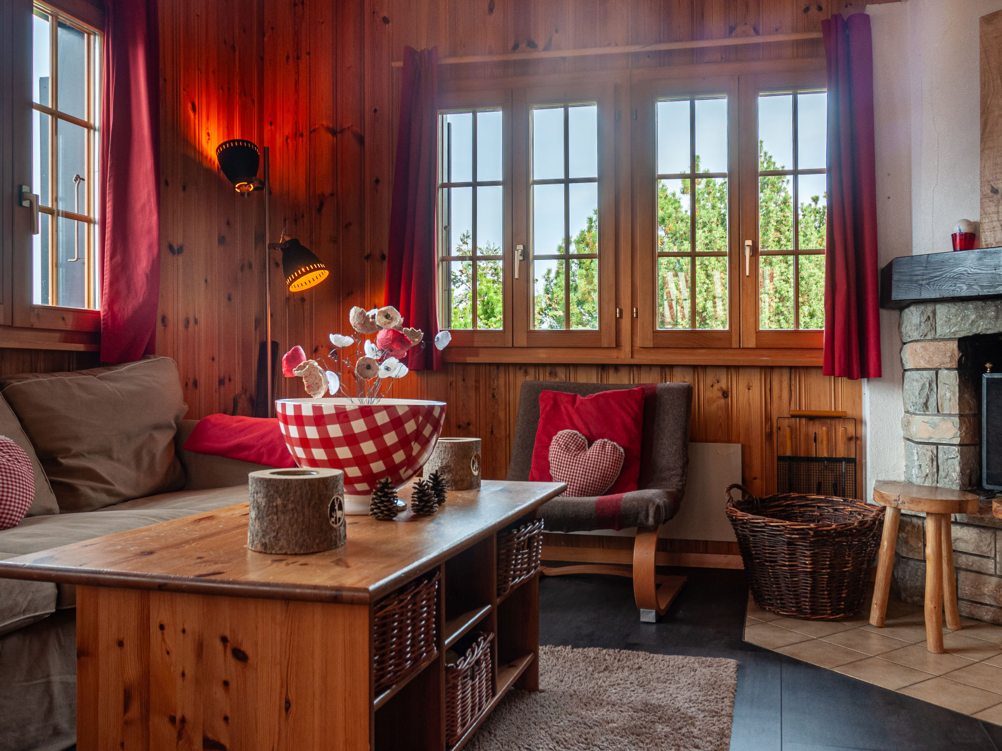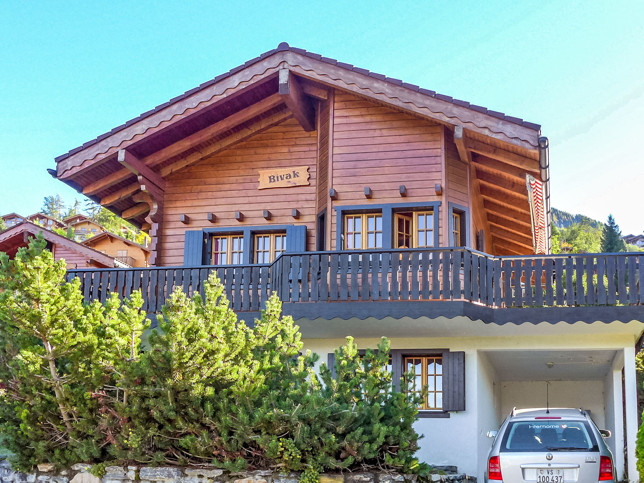 "Bivak", 4-Zimmer-Chalet 100 m2 auf 2 Stockwerken. Zweckmässig eingerichtet: Wohn-/Esszimmer mit offenem Kamin, sep. WC, Kabel-TV und DVD. Ausgang zur Terrasse. Offene Küche (4 Kochplatten, Backofen, Geschirrspüler, Toaster, Wasserkocher, elektrische Kaffeemaschine, Kapseln für die Kaffeemaschine (Nespresso) extra, Fondue Set (Käse)). E-Heizung. Unteres Geschoss: 2 Doppelzimmer, jedes Zimmer mit 1 franz. Bett (160 cm, Länge 200 cm). Ausgang zum Garten, Richtung Norden. Bad/WC. Obergeschoss: 1 abgeschrägtes Zimmer mit 2 Betten (90 cm, Länge 200 cm). Terrasse, Südlage, Garten 600 m2. Terrassenmöbel. Sehr schöne Panoramasicht. Zur Verfügung: Waschmaschine, Kinderhochstuhl, Babybett, Haartrockner. Internet (WLAN, gratis). Parkplatz (überdacht). Bitte beachten: Nichtraucher-Haus.
