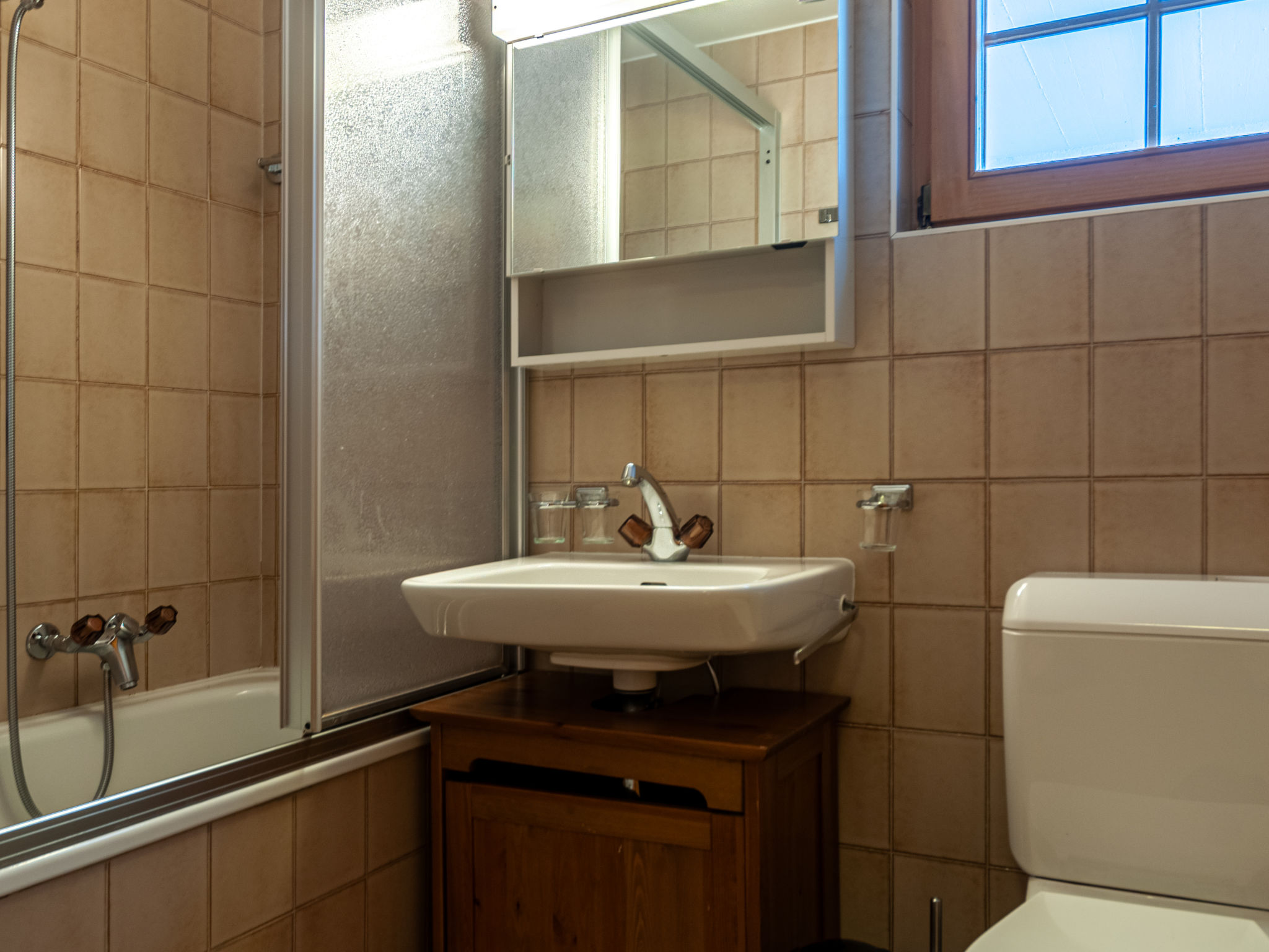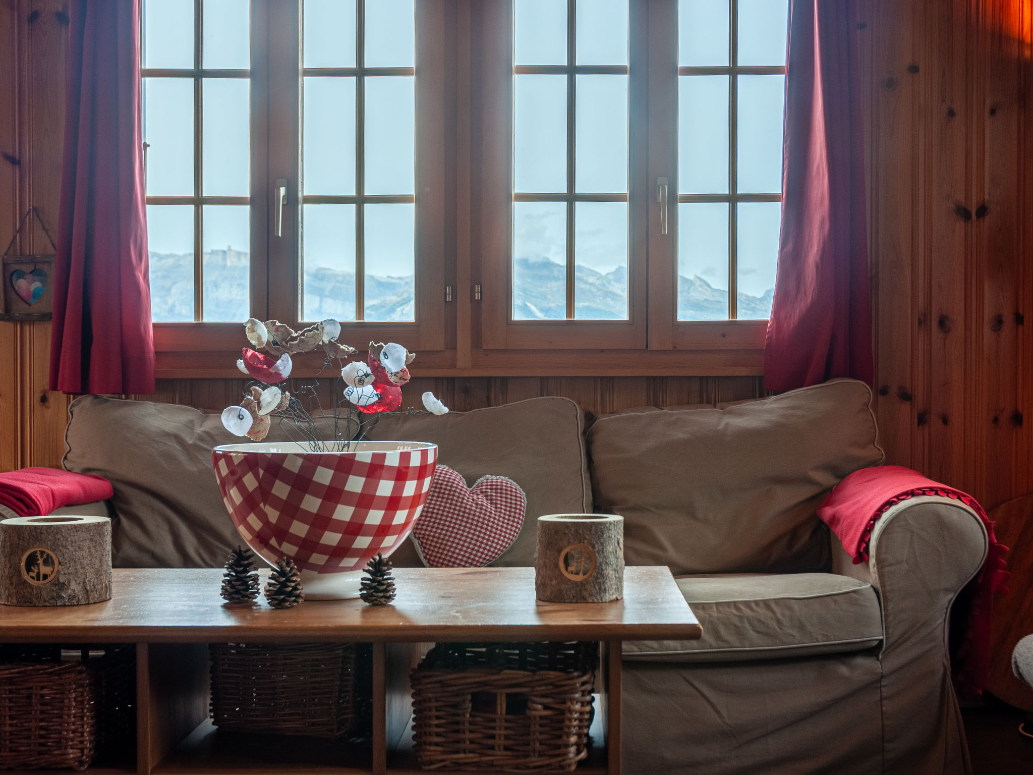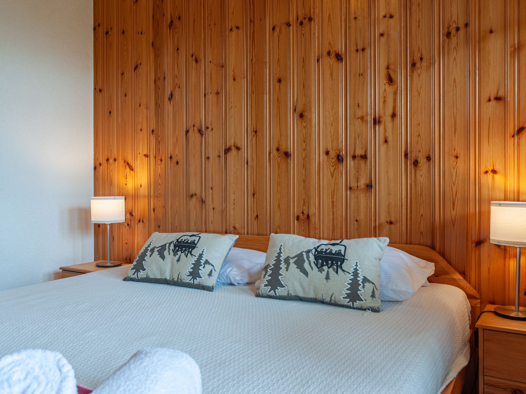 "Bivak", 4-Zimmer-Chalet 100 m2 auf 2 Stockwerken. Zweckmässig eingerichtet: Wohn-/Esszimmer mit offenem Kamin, sep. WC, Kabel-TV und DVD. Ausgang zur Terrasse. Offene Küche (4 Kochplatten, Backofen, Geschirrspüler, Toaster, Wasserkocher, elektrische Kaffeemaschine, Kapseln für die Kaffeemaschine (Nespresso) extra, Fondue Set (Käse)). E-Heizung. Unteres Geschoss: 2 Doppelzimmer, jedes Zimmer mit 1 franz. Bett (160 cm, Länge 200 cm). Ausgang zum Garten, Richtung Norden. Bad/WC. Obergeschoss: 1 abgeschrägtes Zimmer mit 2 Betten (90 cm, Länge 200 cm). Terrasse, Südlage, Garten 600 m2. Terrassenmöbel. Sehr schöne Panoramasicht. Zur Verfügung: Waschmaschine, Kinderhochstuhl, Babybett, Haartrockner. Internet (WLAN, gratis). Parkplatz (überdacht). Bitte beachten: Nichtraucher-Haus.