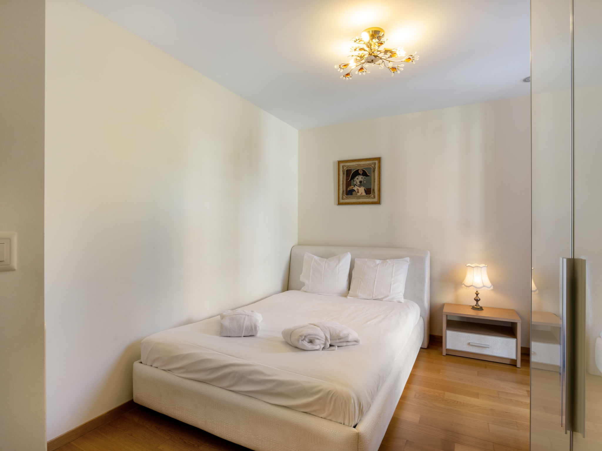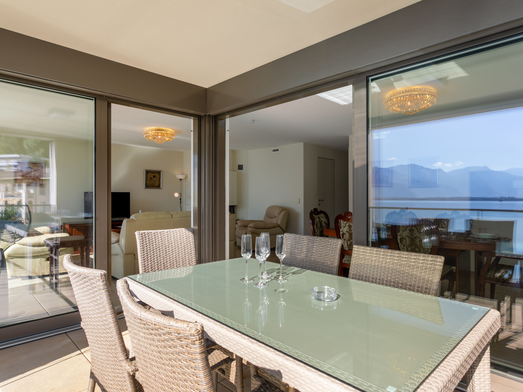 "Le Belvédère D1.4", 4-Zimmer-Wohnung 120 m2 im 1. Stock. Komfortabel und geschmackvoll eingerichtet: Wohn-/Esszimmer mit offenem Kamin (nur Deko), Kabel-TV, DVD, G-Heizung, Ventilator und elektrischem Rollladen. Ausgang zum Balkon. 2 Zimmer, jedes Zimmer mit 1 Doppelbett (180 cm, Länge 200 cm), Ventilator. 1 Zimmer mit 1 franz. Bett (140 cm, Länge 200 cm), Ventilator. Küche (Backofen, Geschirrspüler, 4 Glaskeramikplatten, Toaster, Wasserkocher, Mikrowelle, elektrische Kaffeemaschine, Kapseln für die Kaffeemaschine (Nespresso) extra). Bad/WC, Dusche/WC, sep. WC. Balkon 14 m2. Balkonmöbel. Herrliche Sicht auf den See, die Berge, die Landschaft und die Ortschaft. Zur Verfügung: Waschmaschine, Wäschetrockner, Bügeleisen, Haartrockner. Internet (WLAN, gratis). Garage Nr. 146 + 147 auf dem Grundstück (2 Autos). Bitte beachten: Nichtraucher-Unterkunft.