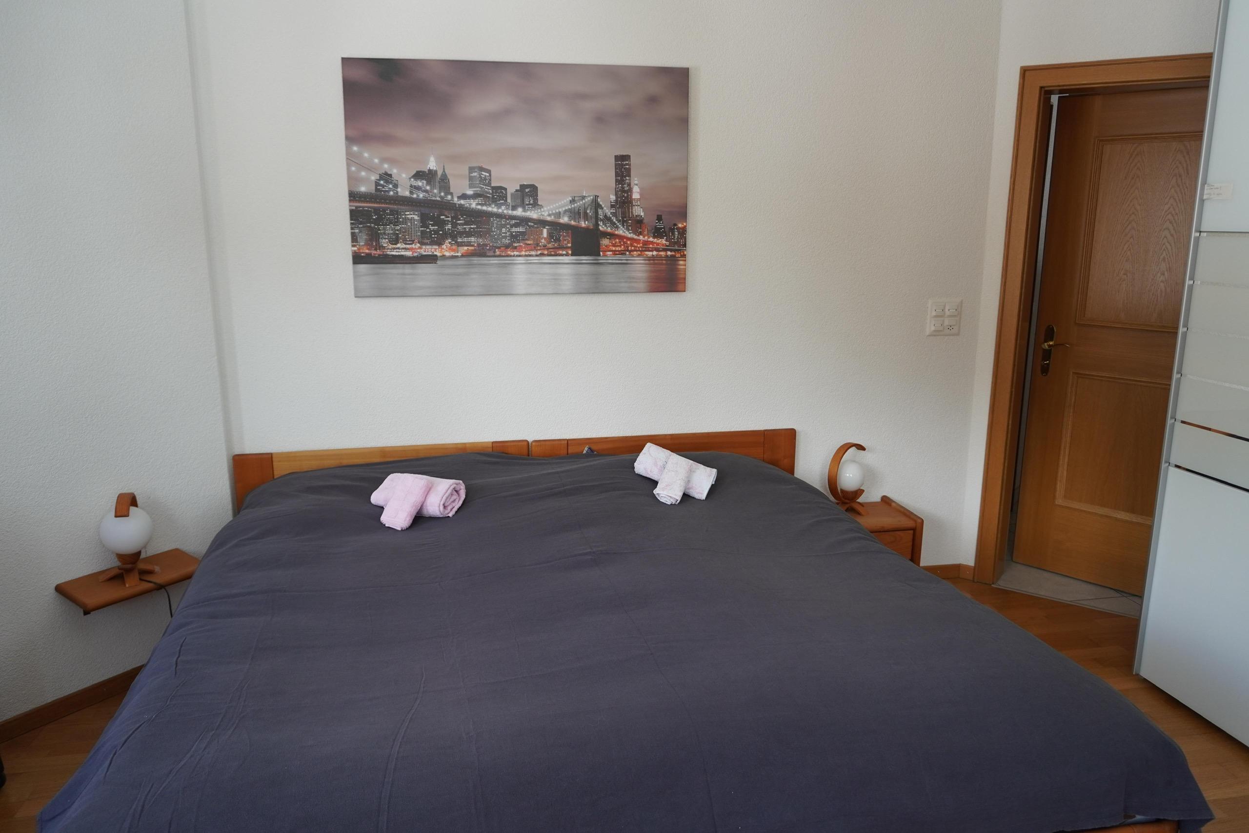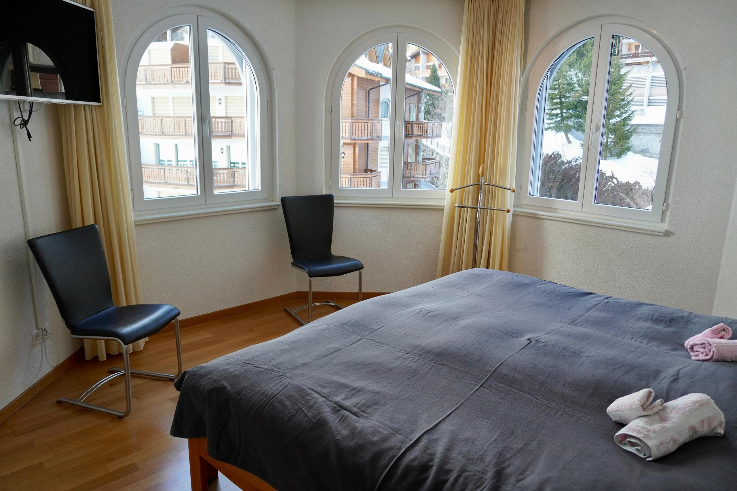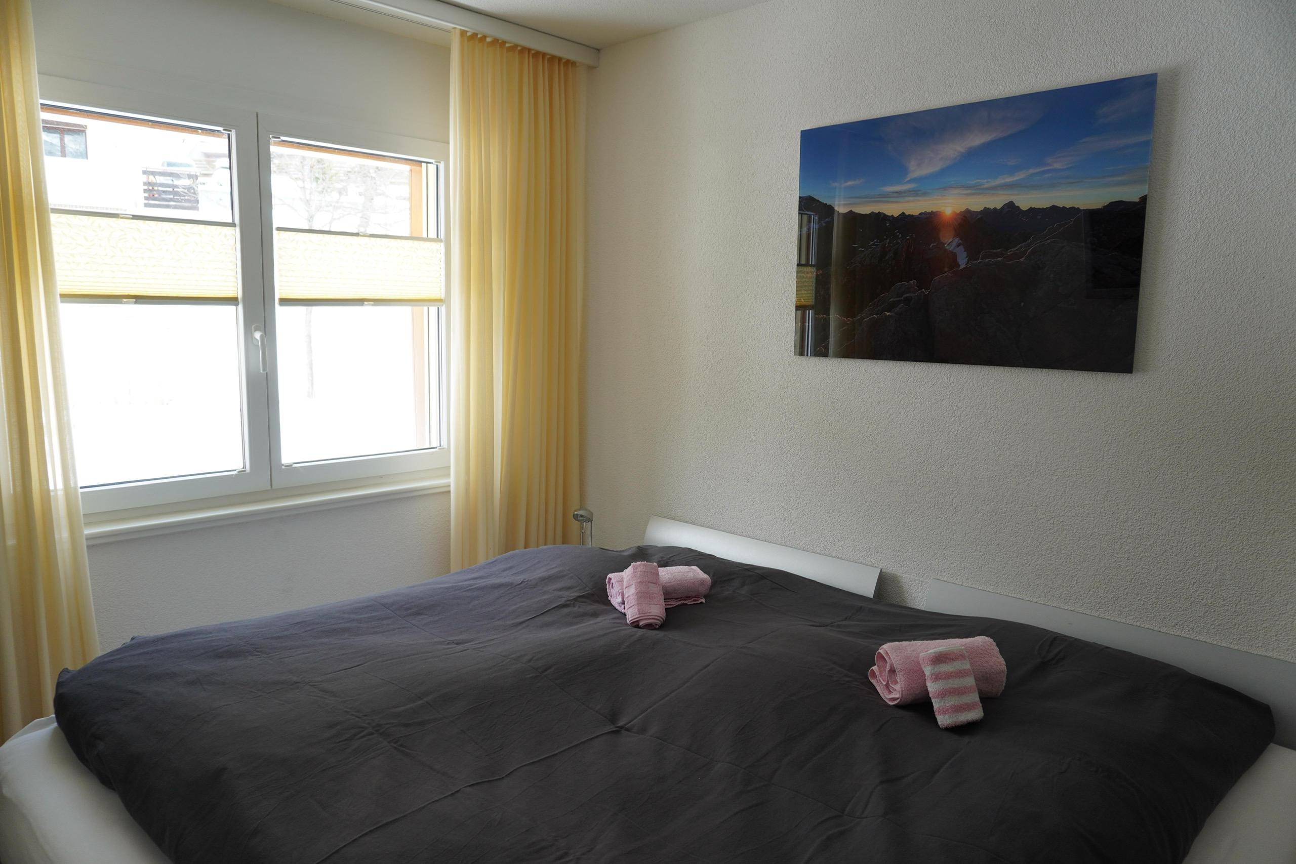 Luxuriöse 3-Zimmerwohnung, in modernem Neubau (3. Etage): Wohn- / Esszimmer mit Cheminée, gratis WiFi, Flachbildfernseher, DVD-Gerät, Stereo-Anlage, exklusiv eingerichtete moderne offene Wohnküche mit Geschirrspüler, Mikrowelle, Steamer, Raclette- und Fondue-Set, 2 Doppelschlafzimmer mit Flachbildfernseher, Badezimmer mit Wellnessdusche und Closomat-WC, zusätzlich separates WC. Süd-Balkon mit Panoramablick. Ruhige Lage, Aufzug, Ski- & Veloraum, Kinderspielplatz. In der Nähe: Torrentbahnen, Thermalbäder, Ortsbus-Haltestelle, Dorfzentrum. Garage zu mieten im Haus. Nichtraucher-Wohnung. Haustiere sind nicht erlaubt.