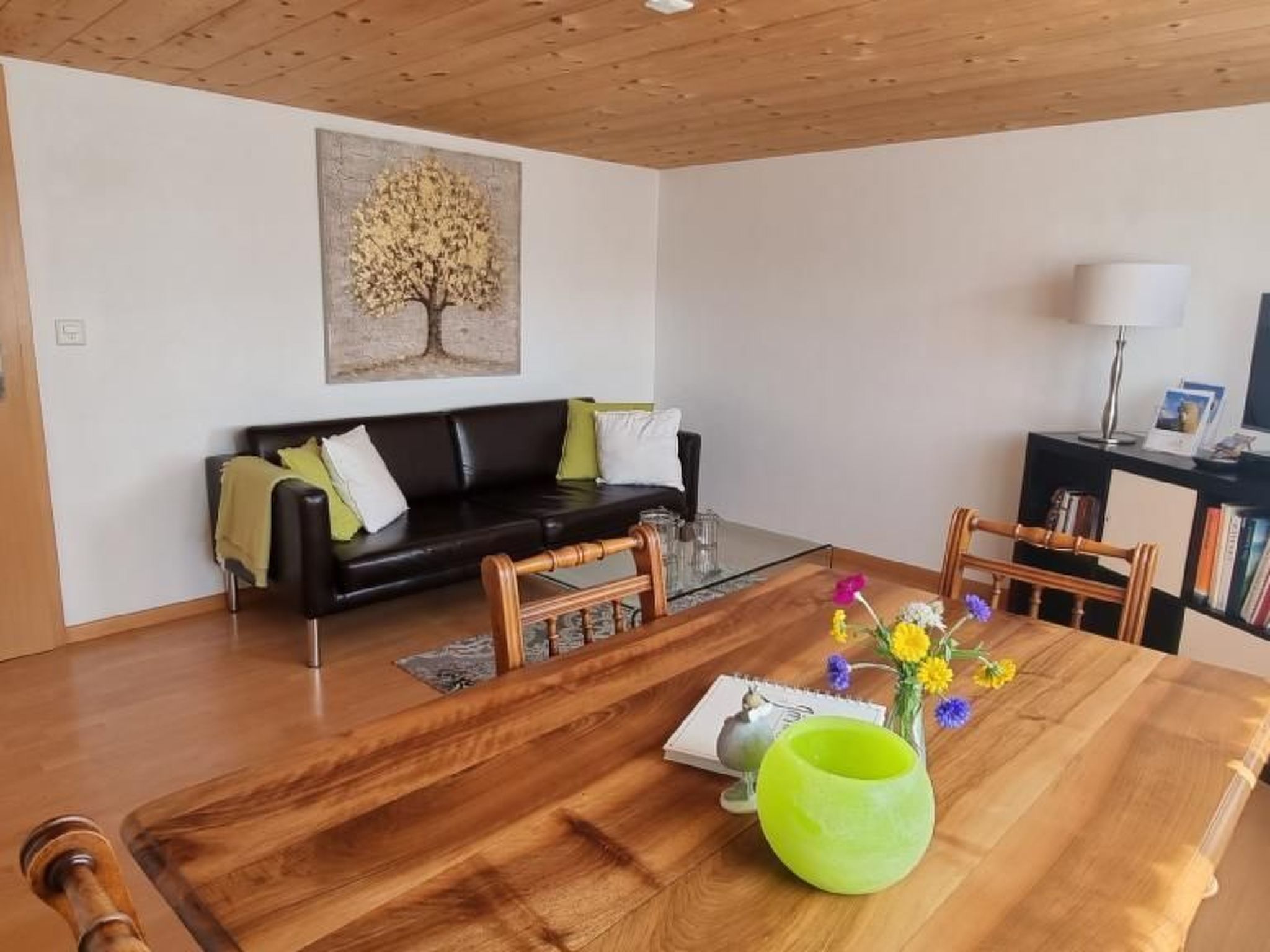 Die gemütliche Wohnung bietet eine moderne Küche, eine Stube und zwei Schlafzimmer. Ein grosszügiger Garten mit viel Sonne, schattenspendenden Obstbäumen und herrlichem Weitblick lädt zum Verweilen ein. Zahllose Wanderwege warten darauf, entdeckt zu werden. Im nahegelegenen Wald lädt ein Tipi (inkl. Feuerstelle) zu Spass und Abenteuern ein.