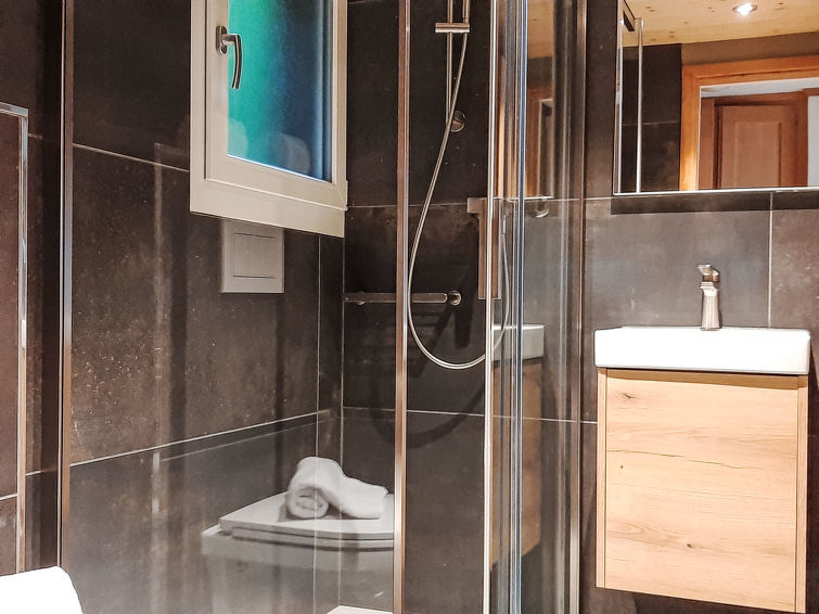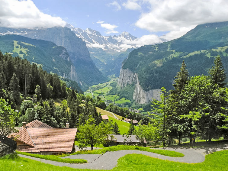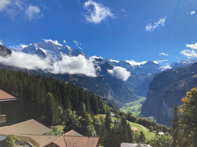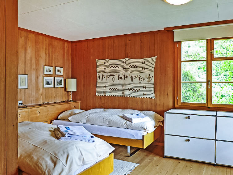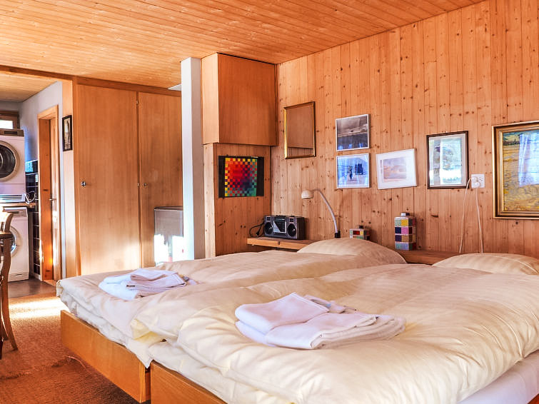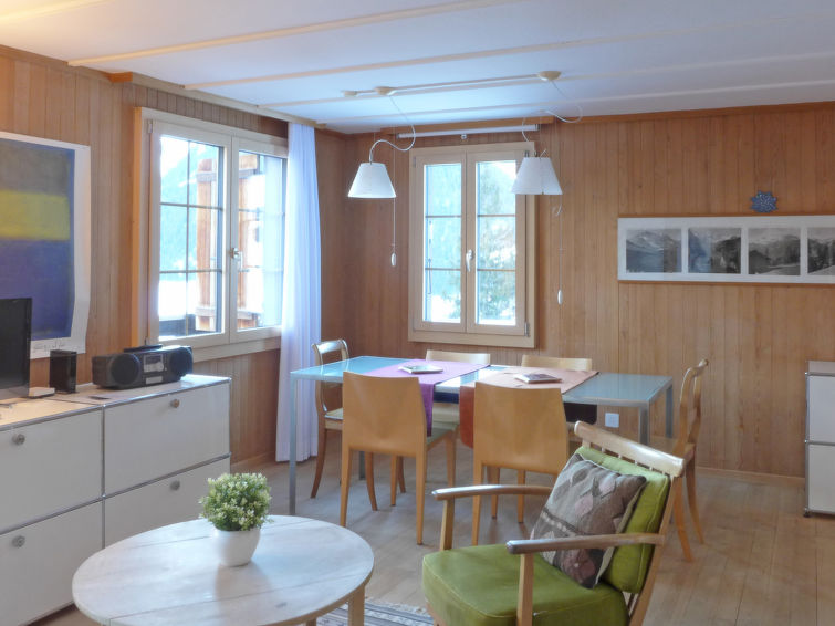 "Jungfrau a d Ledi", 3-Zimmer-Chalet 75 m2. Geräumig, teilweise renoviert, modern und geschmackvoll eingerichtet: Wohn-/Esszimmer 30 m2 mit 1 Bett (90 cm, Länge 190 cm), Esstisch, Kabel-TV und Internationale TV-Sender (Flachbildschirm), Radio und CD. Ausgang zum Balkon, Richtung Süden. 1 Zimmer 14 m2 mit 2 Betten (90 cm, Länge 190 cm). Offene Küche (Backofen, Geschirrspüler, 4 Glaskeramikplatten, Toaster, Wasserkocher, elektrische Kaffeemaschine, Kapseln für die Kaffeemaschine (Nespresso) extra). Dusche/WC. Ölheizung. Unteres Geschoss: (Aussentreppe) 25 m2, 1 Zimmer mit 2 Betten (90 cm, Länge 200 cm). Ausgang zum Gartensitzplatz. Sep. WC. Balkonmöbel, Liegestühle (2). Herrliche Panoramasicht auf die Berge und das Tal. Zur Verfügung: Waschmaschine, Wäschetrockner (extra). Internet (Wireless LAN, gratis). Bitte beachten: ein Doppelzimmer liegt außerhalb der Wohnung. Nichtraucher-Haus. Maximal 1 Haustier/Hund erlaubt. Keine interne Verbindung zwischen den Etagen.