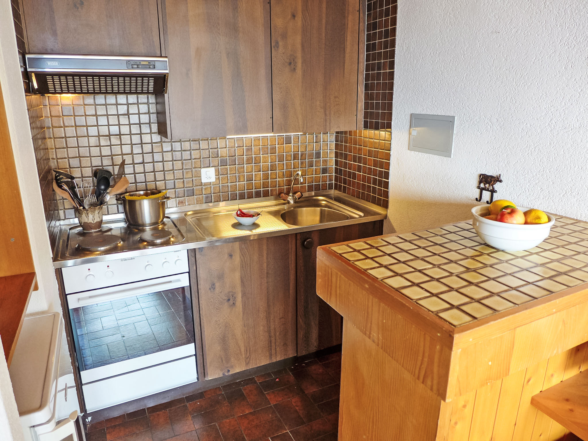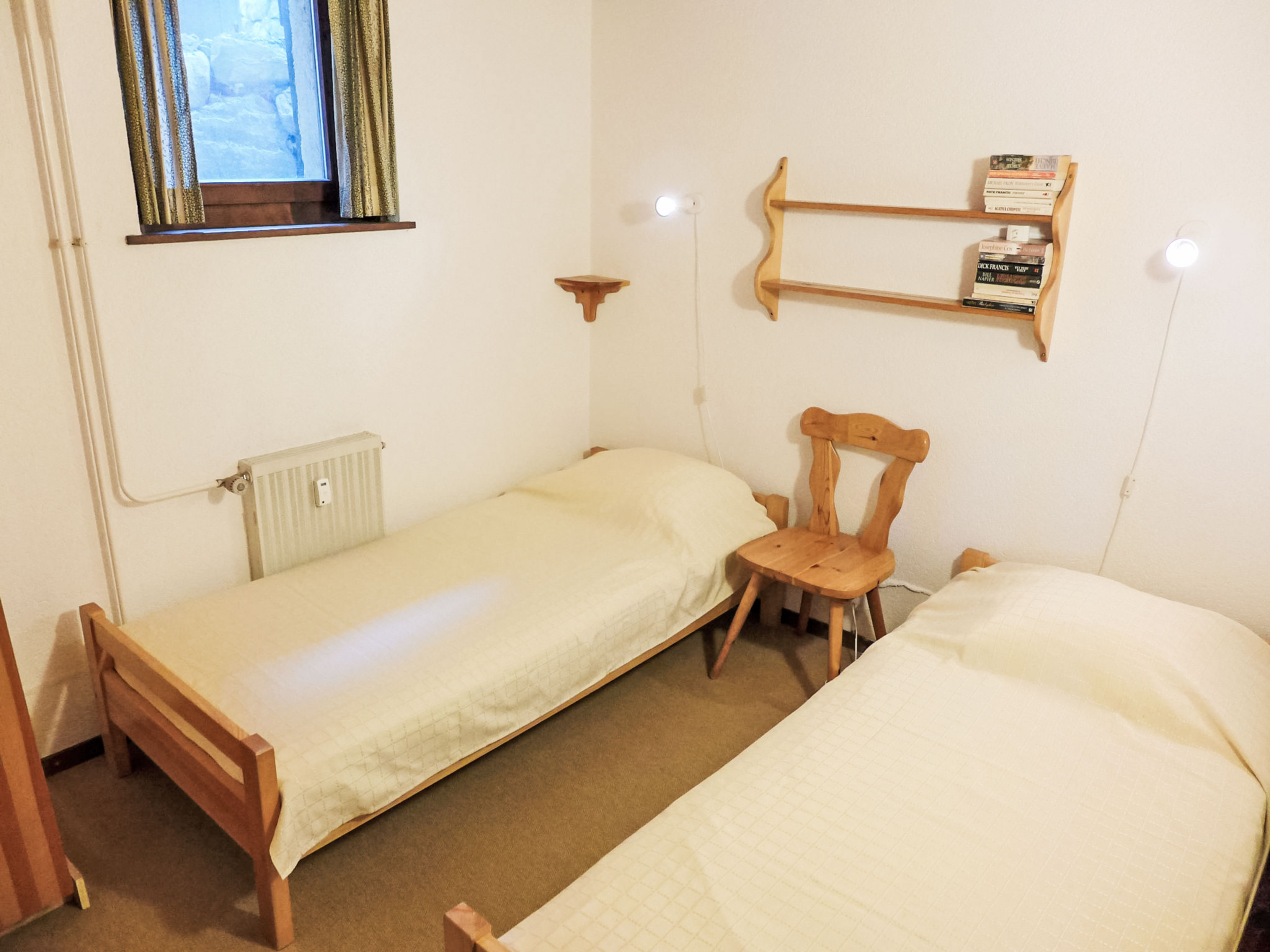 "La Vire D'Aufalle 14 Inférieur", 3-Zimmer-Wohnung 45 m2, im Erdgeschoss. Zweckmässig eingerichtet: Wohn-/Esszimmer mit offenem Kamin und TV (Flachbildschirm), DVD. Ausgang zur Terrasse. 2 Zimmer, jedes Zimmer mit 2 Betten. Kleine, offene Küche (3 Kochplatten, Backofen, Toaster, Wasserkocher, elektrische Kaffeemaschine, Racletteofen, Fondue Set (Käse)). Bad/WC. Terrasse, Südlage. Terrassenmöbel. Sicht auf die Berge und die Landschaft. Zur Verfügung: Internet (Wireless LAN, gratis). Parkplatz Nr. 14I (überdacht) in 100 m, Höhe 200 cm, Breite 237 cm.