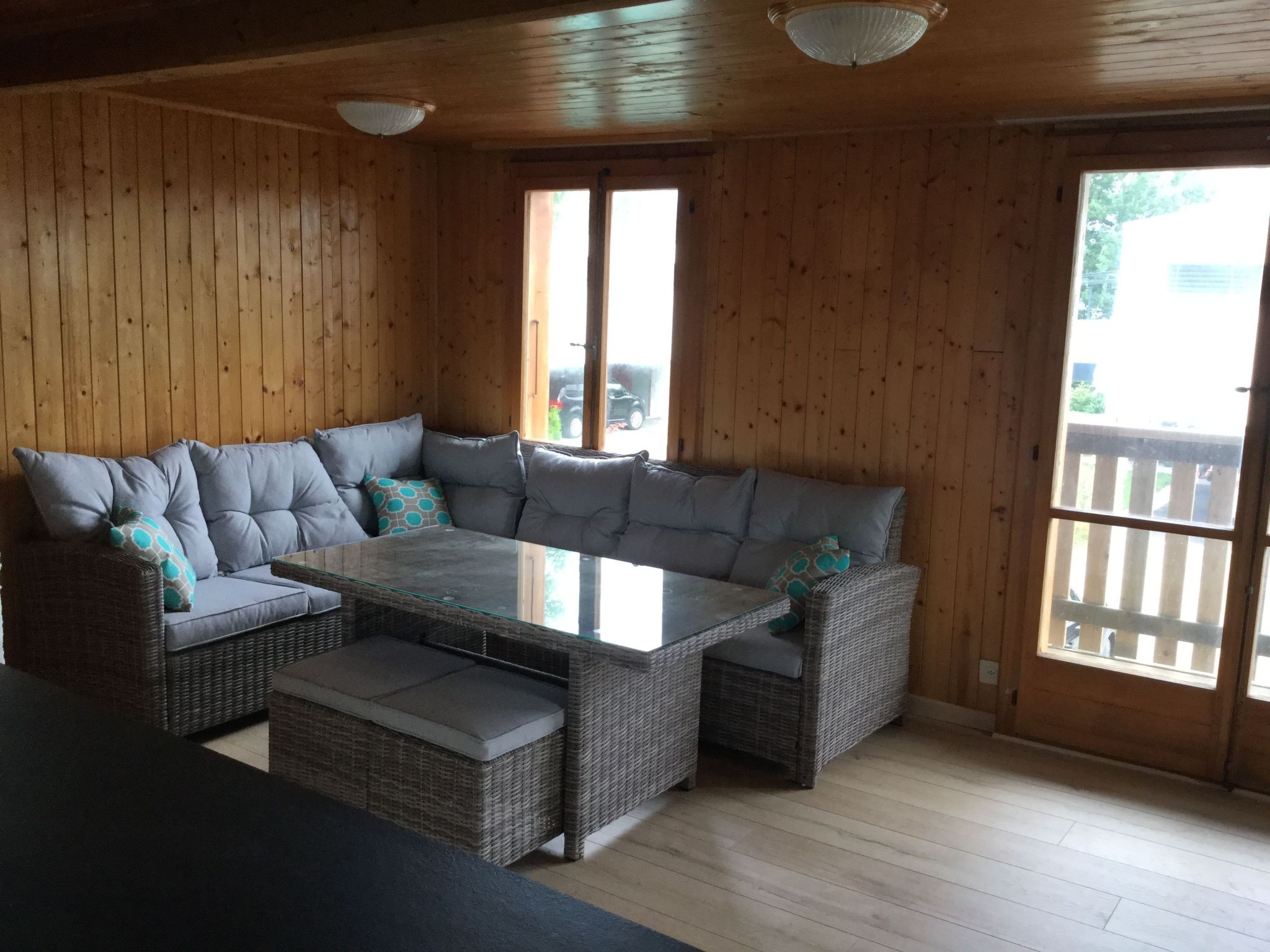 Das Innere des Chalets ist auf Ihren Komfort ausgerichtet und erstreckt sich über zwei Etagen, die viel Platz und Privatsphäre bieten. Im ersten Stock finden Sie ein gemütliches Schlafzimmer mit zwei Einzelbetten, ergänzt durch einen offenen Wohnbereich mit Wohnzimmer, Esszimmer und Küche für gemeinsame und gesellige Momente. Ein WC mit Dusche ist ebenfalls vorhanden, ebenso wie eine überdachte Terrasse mit Gartentisch und -stühlen, die ideal für Mahlzeiten im Freien ist. Die zweite Etage beherbergt ein geräumiges Schlafzimmer mit drei Einzelbetten und ein zweites WC mit Dusche, das über eine Außentreppe erreichbar ist und Privatsphäre und Komfort für alle Gäste garantiert.