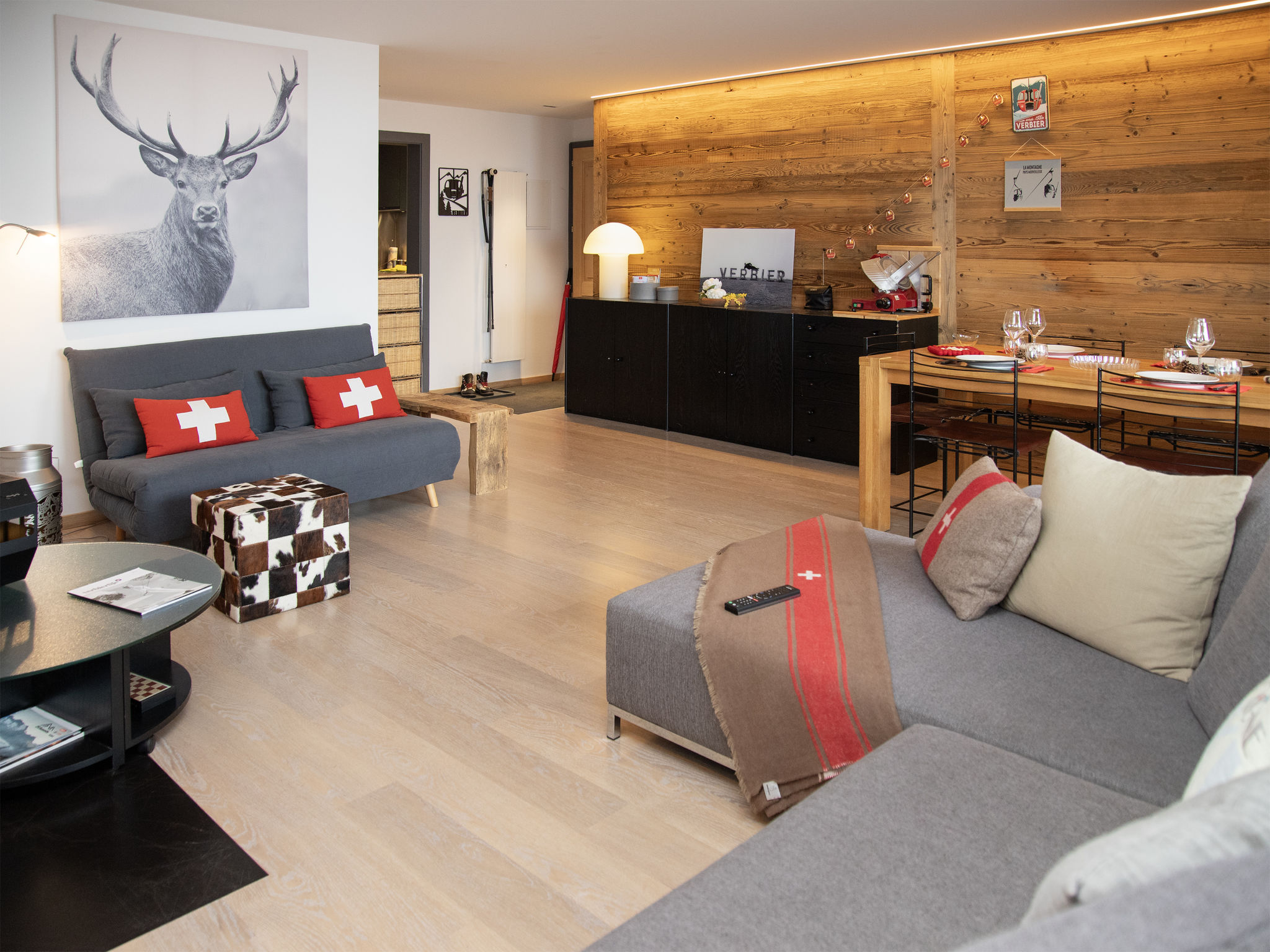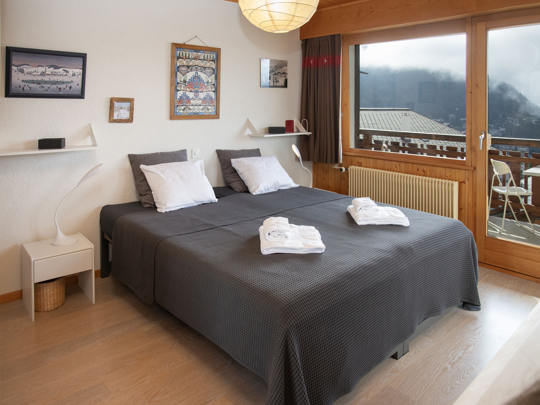 "Soleil des Alpes", 3-Zimmer-Wohnung im erhöhten Erdgeschoss, Südlage. Komfortabel und modern eingerichtet: grosses Wohn-/Esszimmer mit Schwedenofen und Kabel-TV. Ausgang zum Balkon, zur Terrasse, Richtung Süden. 1 grosses Zimmer mit 1 Doppelbett (1 x 180 cm, Länge 200 cm), Kabel-TV. Ausgang zur Terrasse. 1 grosses Zimmer mit 2 Betten (90 cm, Länge 200 cm), Kabel-TV. Küche (4 Kochplatten, Backofen, Geschirrspüler, Toaster, Wasserkocher, Mikrowelle, Tiefkühler, elektrische Kaffeemaschine, Kapseln für die Kaffeemaschine (Nespress) extra, Racletteofen, Fondue Set (Käse)). Dusche/WC, sep. WC. Parkettboden. Balkon, Südlage. Balkonmöbel. Sehr schöne Panoramasicht. Zur Verfügung: Haartrockner. Internet (WLAN, gratis). Parkplatz (1 Auto). Bitte beachten: geeignet für Familien. Nichtraucher-Unterkunft.