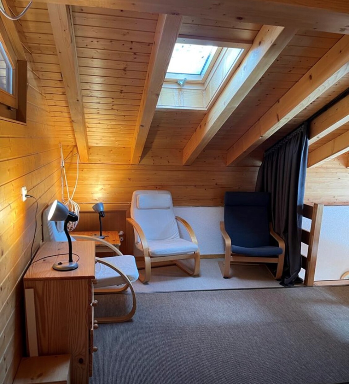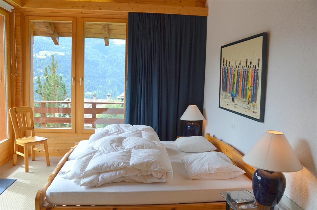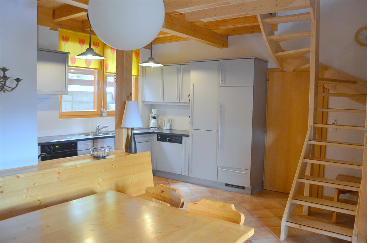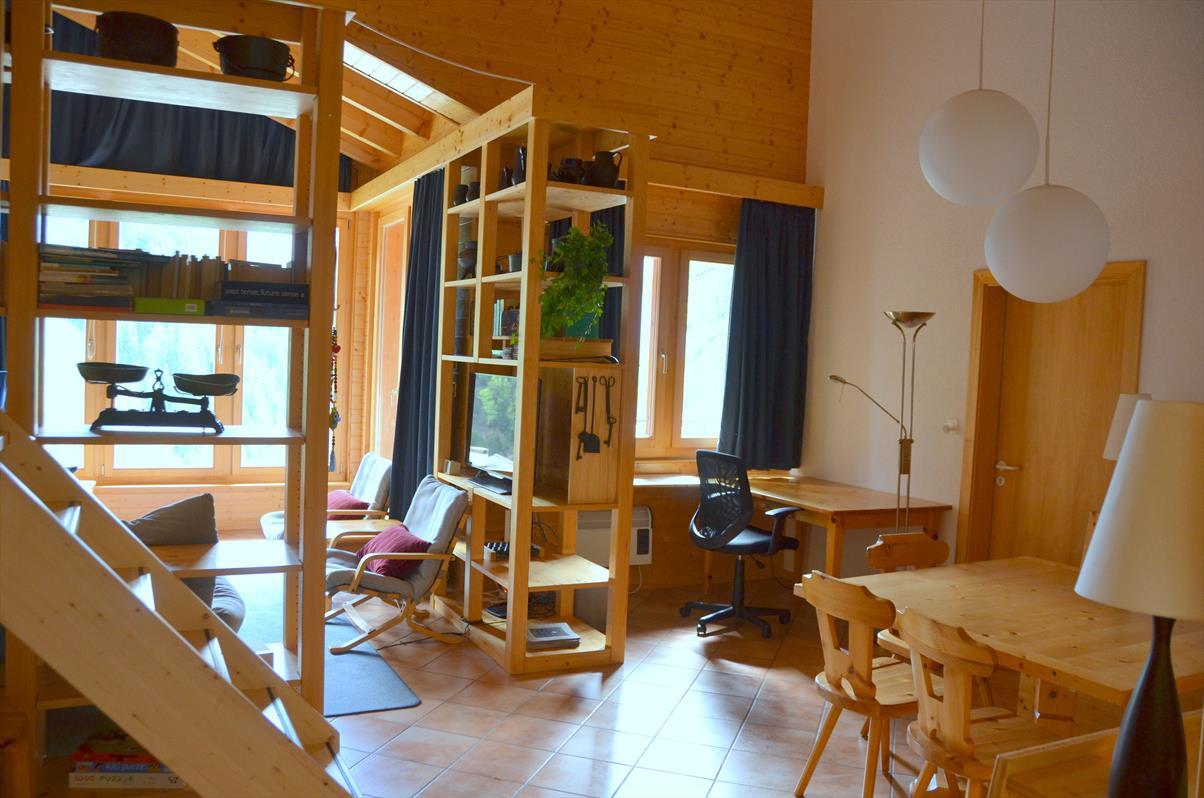 Aussen : Komfortable und moderne Dachwohnung im 1. Stock eines Chalets, für 6-8 Personen, Balkon-Terrasse, Panoramablick nach Süden, nur 50m bis zur Standseilbahn -Innen : 120 qm, Wohnraum mit Schwedenofen, Essecke, Mezzanin -Zimmer : 1 Doppelbettzimmer mit private Badezimmer (Badewanne und Dusche), 1 Zimmer mit Etagenbett (2 Personen), Mezzanin mit 2 Betten -Sanitäranlagen : 1 Badezimmer mit Badewanne und WC, 1 Badezimmer mit Dusche -Küche : offene Küche, Glaskeramikkochfeld mit Backofen, Kühlschrank mit Tiefkühler, Wasserkocher, Geschirrspüler -Verschiedenes : Kabel-TV, WiFi, DVD Player, Haustiere nicht genehmigt, Nichtraucher, Garage -