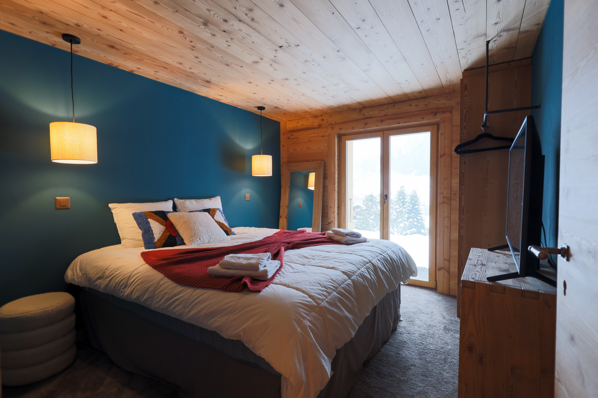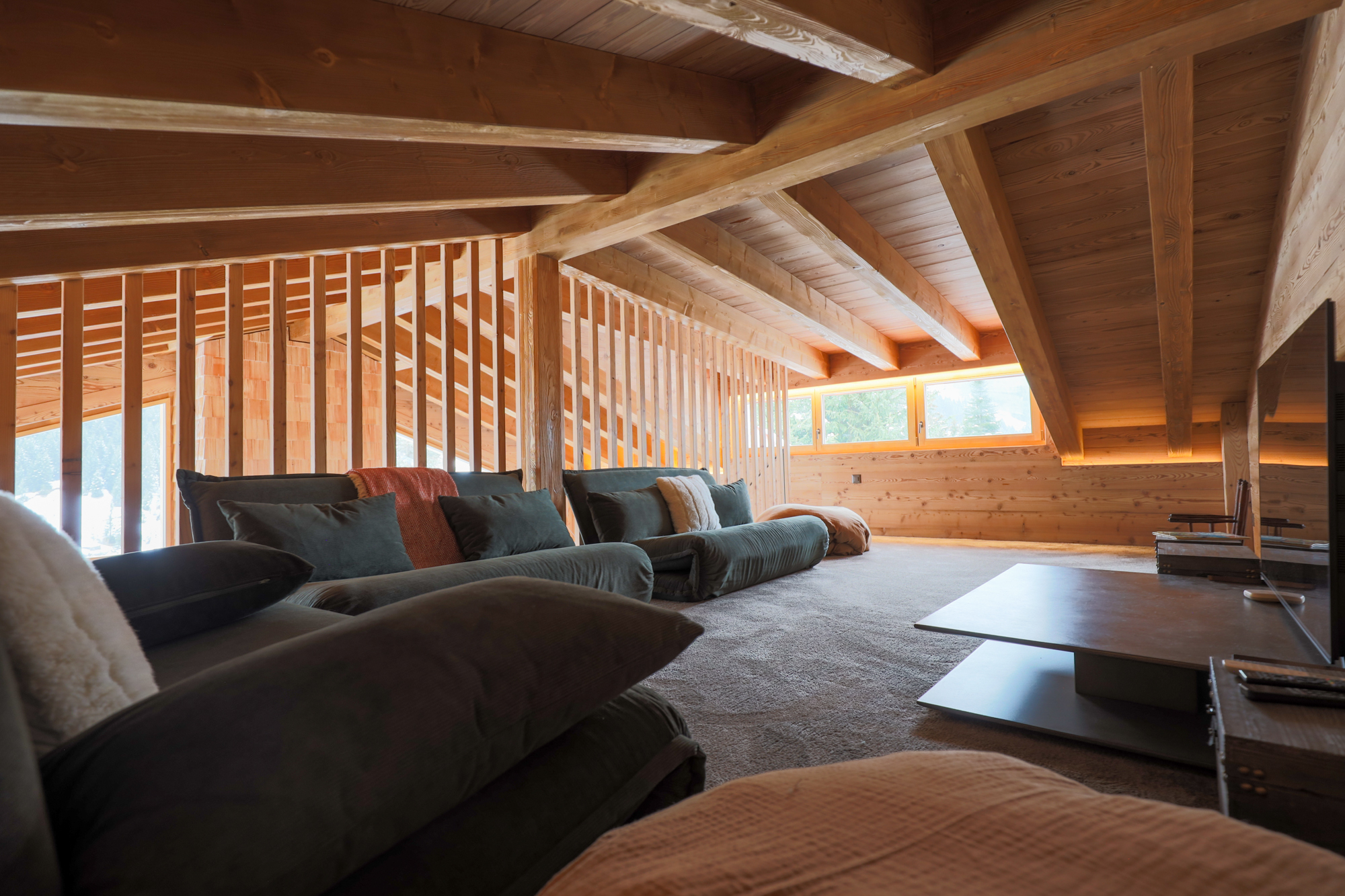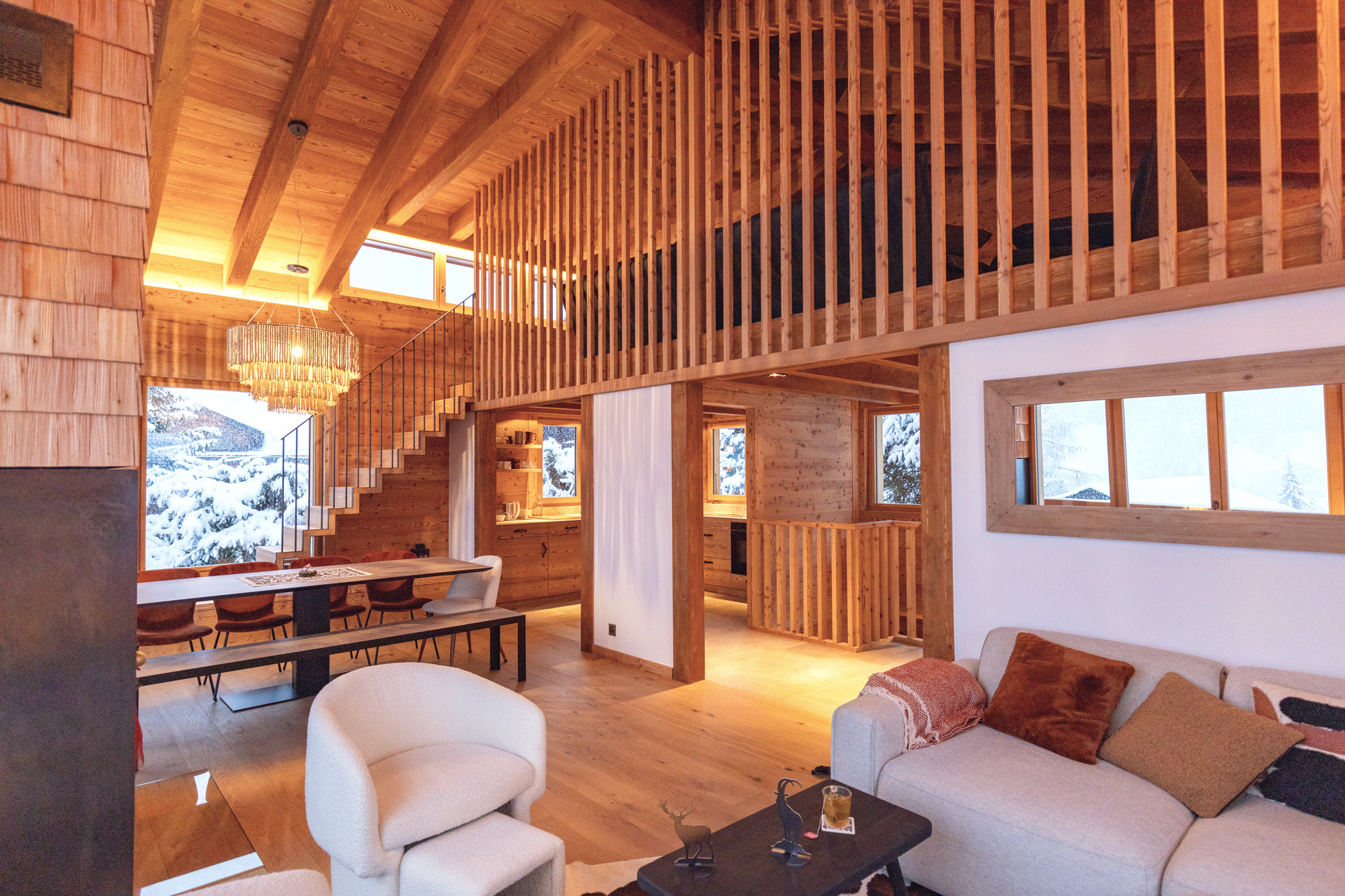 Chalet de 170m² > Rez-sup : Entrée avec vestiaire - WC Séjour - Wifi - Salle à manger avec cheminée Cuisine ouverte toute équipée Terrasse - balcon En duplex mezzanine: Grand séjour avec TV > Rez-inf : Sauna Lave-linge - sèche-linge WC séparé - bain - douche - WC - douche Disposition des lits (3 chambres) : 2 chambres à 1 lit pour 2 (180*200) personnes = 4 - 1 TV dans chaque chambre 1 chambre à 2 lits à étages 90*200 et 2 lit 160*200 = 6