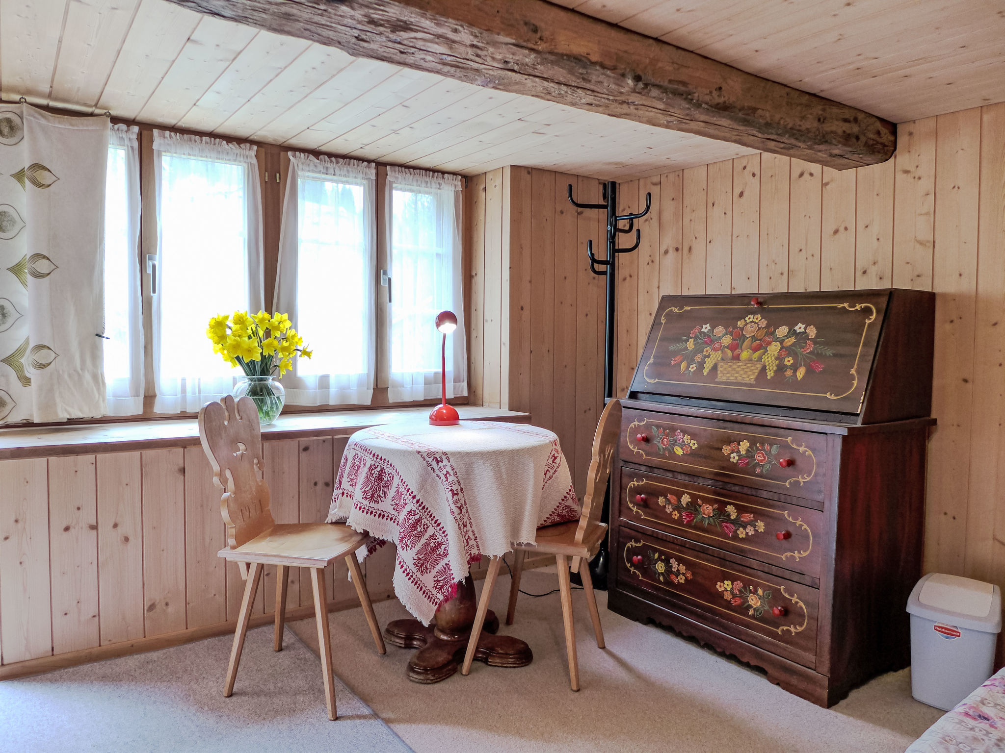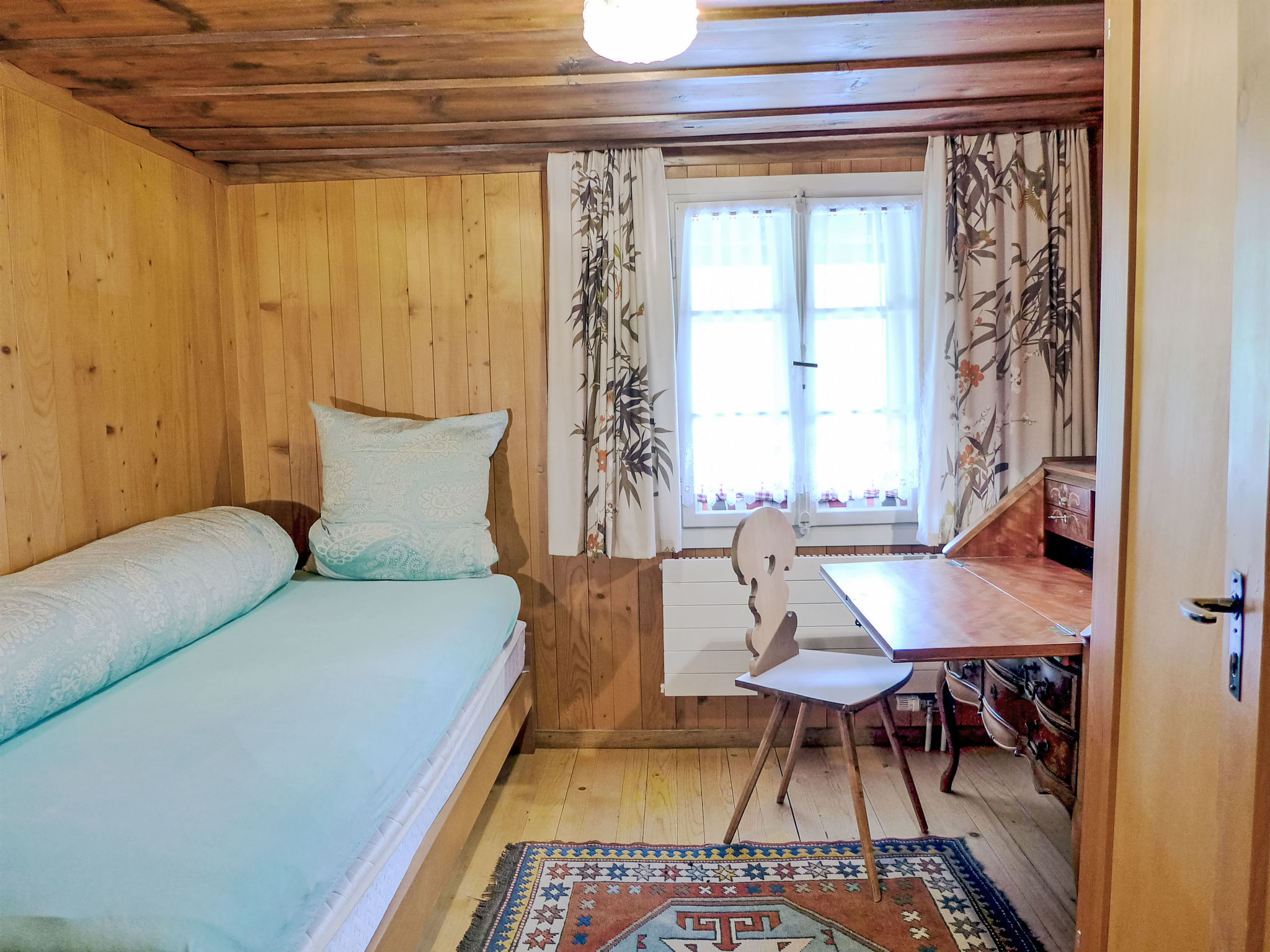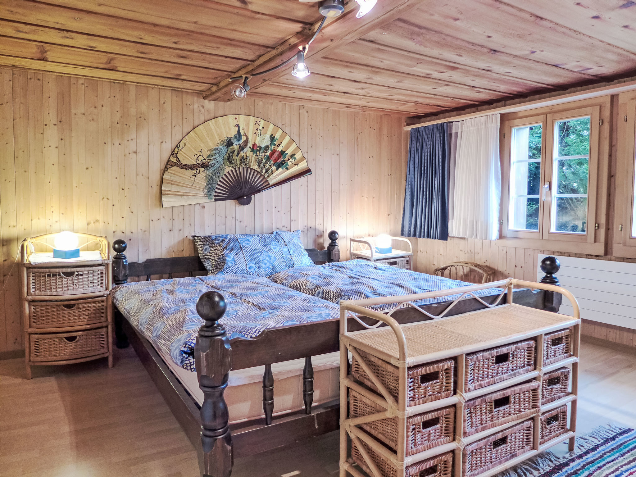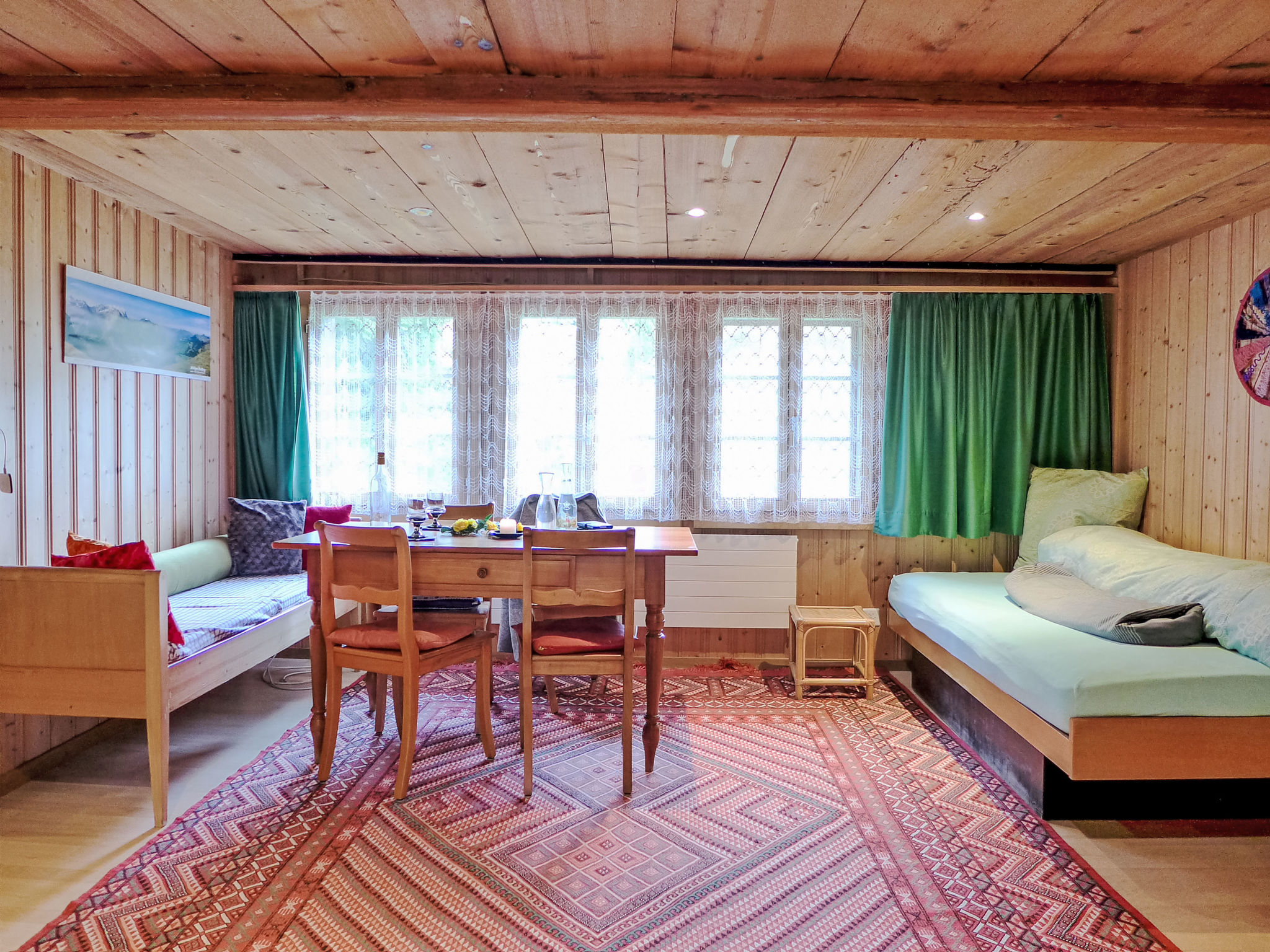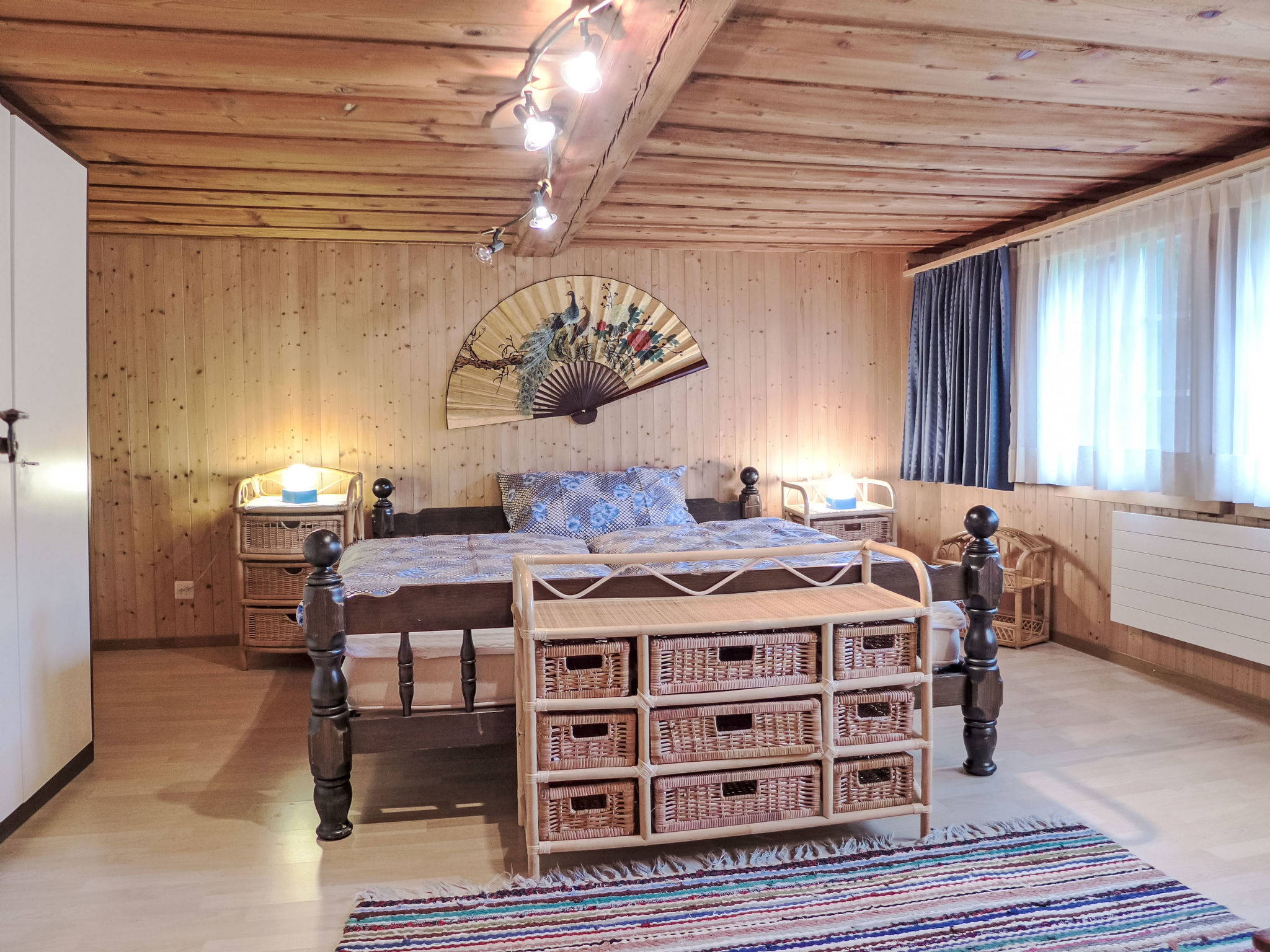5-Zimmer-Chalet auf 2 Stockwerken. Geräumig, teilweise abgeschrägt, sehr einfach und gemütlich eingerichtet: Deckenhöhe 180 - 190 cm, niedrige Türrahmen, Höhe 180 cm. Wohn-/Schlafzimmer mit 1 Bett (90 cm, Länge 200 cm), TV. 1 grosses Zimmer mit 1 Doppelbett (2 x 90 cm, Länge 200 cm). 1 kleines Zimmer mit 1 Bett (90 cm, Länge 200 cm). Offenes Wohn-/Esszimmer mit Esstisch. Offene Küche (4 Glaskeramikplatten, Toaster, Wasserkocher, Mikrowelle, elektrische Kaffeemaschine, Kapseln für die Kaffeemaschine (Delizio) extra, Racletteofen, Fondue Set (Käse)). Bad/WC. Unteres Geschoss: (Aussentreppe) 1 Zimmer, Deckenhöhe 170 - 185 cm mit 1 Doppelbett (2 x 90 cm, Länge 200 cm). Holzdielenboden. Terrasse. Terrassenmöbel. Herrliche Panoramasicht auf die Berge und die Landschaft. Zur Verfügung: Haartrockner. Internet (WLAN, gratis). Parkplatz beim Haus. Bitte beachten: ein Doppelzimmer liegt außerhalb der Wohnung. Nichtraucher-Haus. Maximal 2 Haustiere/Hunde erlaubt. Keine interne Verbindung zwischen den Etagen.
