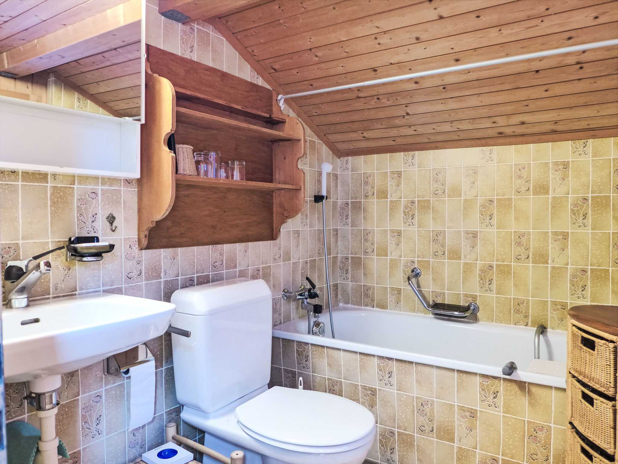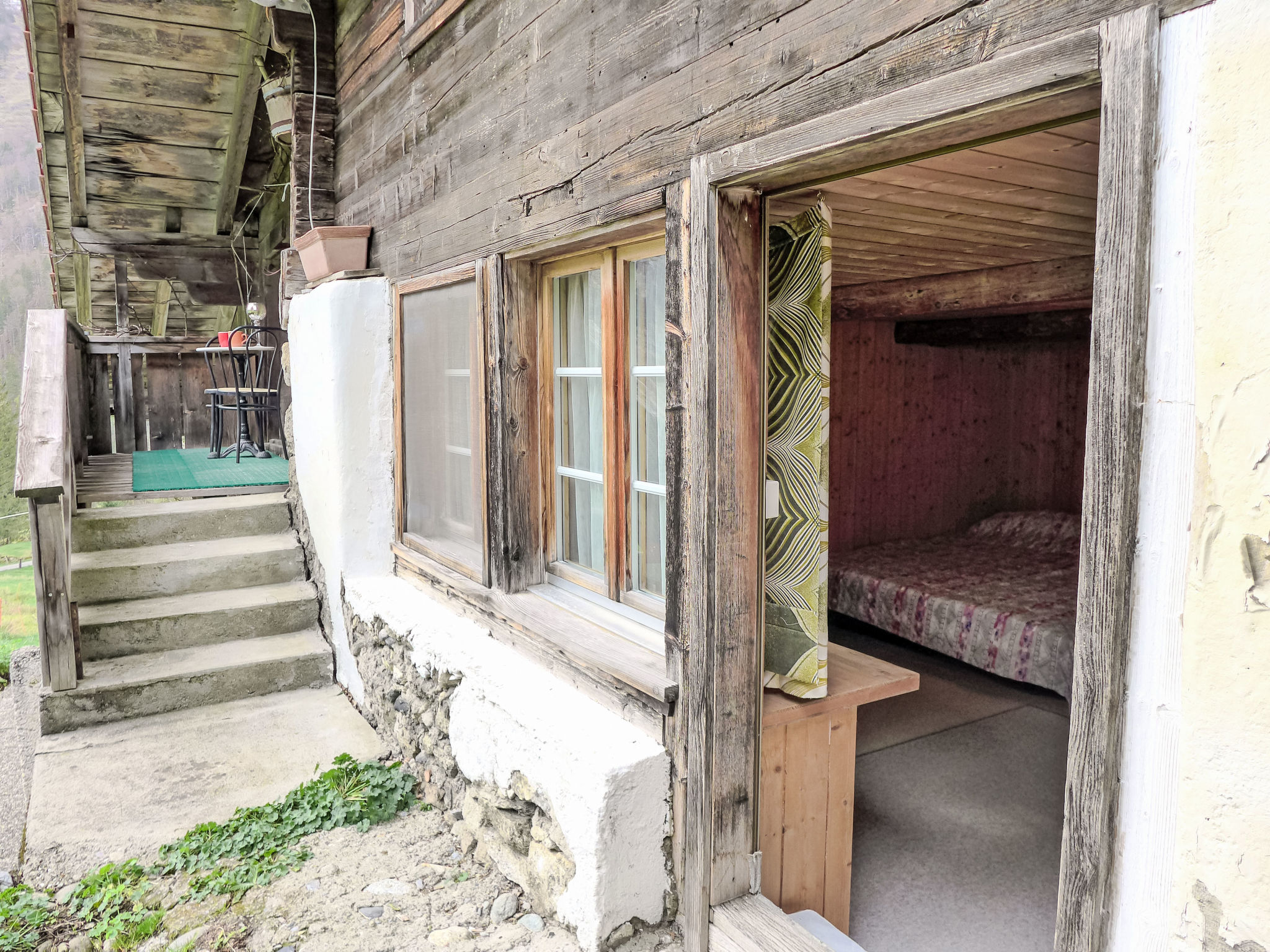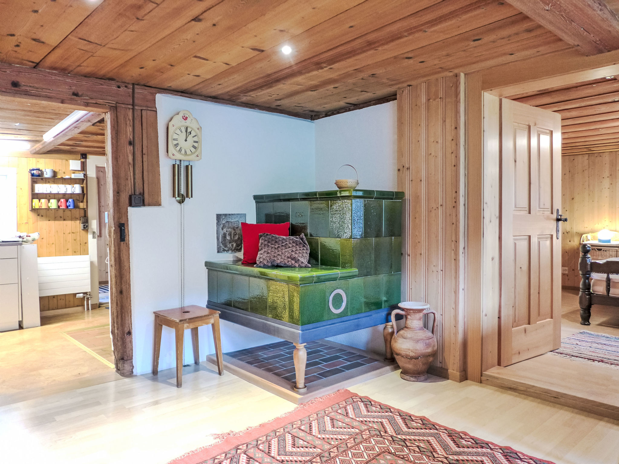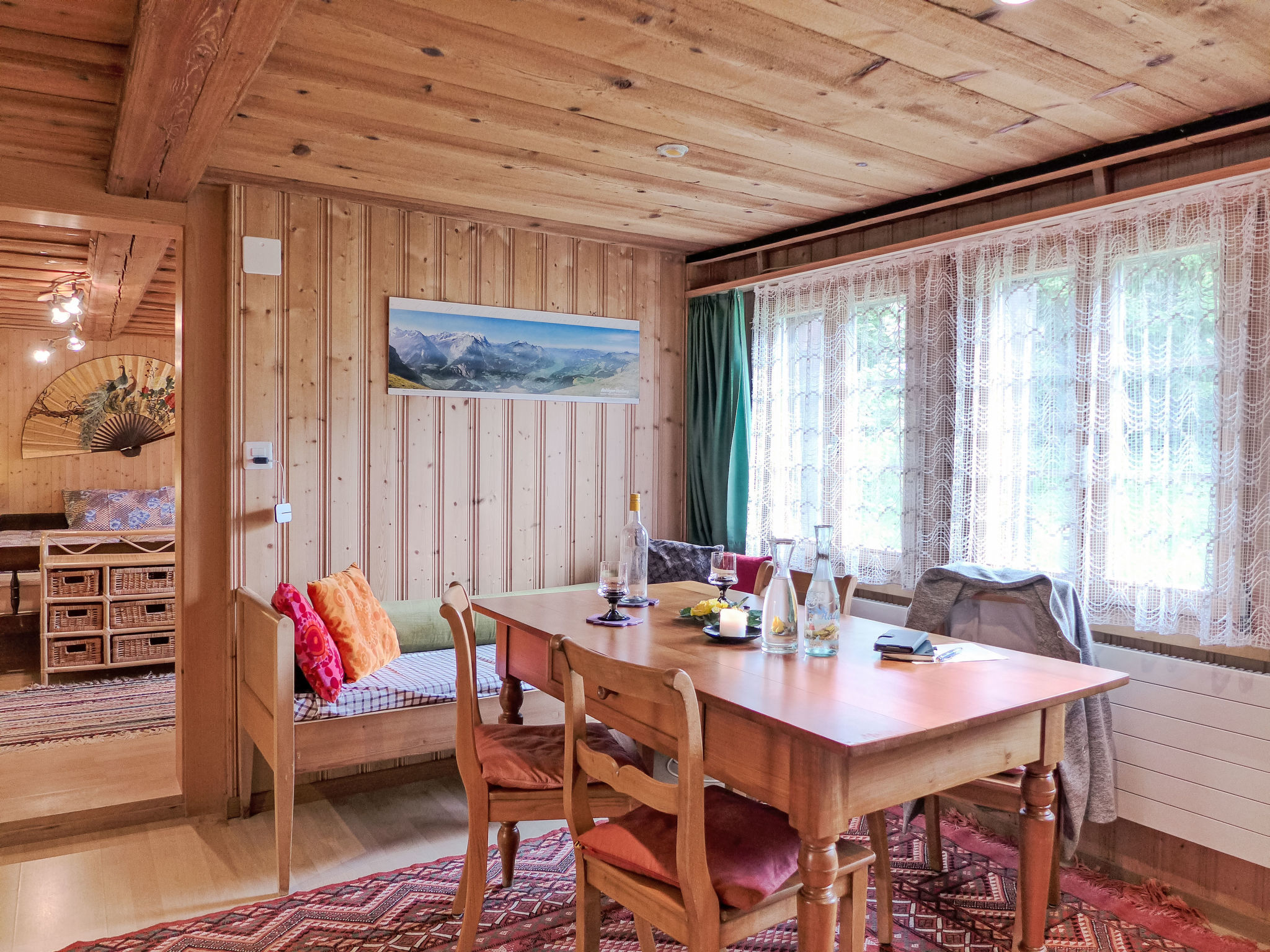 5-Zimmer-Chalet auf 2 Stockwerken. Geräumig, teilweise abgeschrägt, sehr einfach und gemütlich eingerichtet: Deckenhöhe 180 - 190 cm, niedrige Türrahmen, Höhe 180 cm. Wohn-/Schlafzimmer mit 1 Bett (90 cm, Länge 200 cm), TV. 1 grosses Zimmer mit 1 Doppelbett (2 x 90 cm, Länge 200 cm). 1 kleines Zimmer mit 1 Bett (90 cm, Länge 200 cm). Offenes Wohn-/Esszimmer mit Esstisch. Offene Küche (4 Glaskeramikplatten, Toaster, Wasserkocher, Mikrowelle, elektrische Kaffeemaschine, Kapseln für die Kaffeemaschine (Delizio) extra, Racletteofen, Fondue Set (Käse)). Bad/WC. Unteres Geschoss: (Aussentreppe) 1 Zimmer, Deckenhöhe 170 - 185 cm mit 1 Doppelbett (2 x 90 cm, Länge 200 cm). Holzdielenboden. Terrasse. Terrassenmöbel. Herrliche Panoramasicht auf die Berge und die Landschaft. Zur Verfügung: Haartrockner. Internet (WLAN, gratis). Parkplatz beim Haus. Bitte beachten: ein Doppelzimmer liegt außerhalb der Wohnung. Nichtraucher-Haus. Maximal 2 Haustiere/Hunde erlaubt. Keine interne Verbindung zwischen den Etagen.