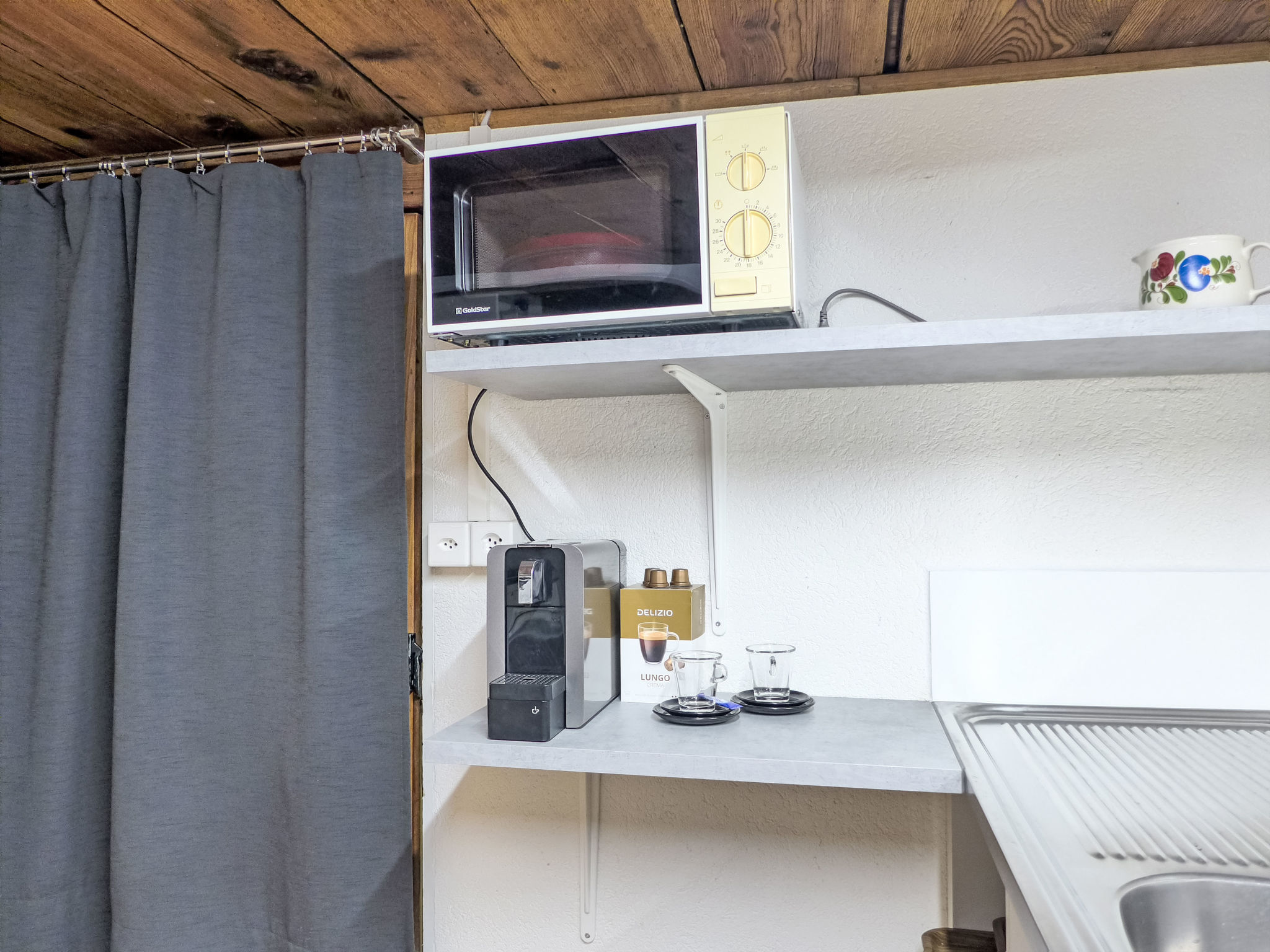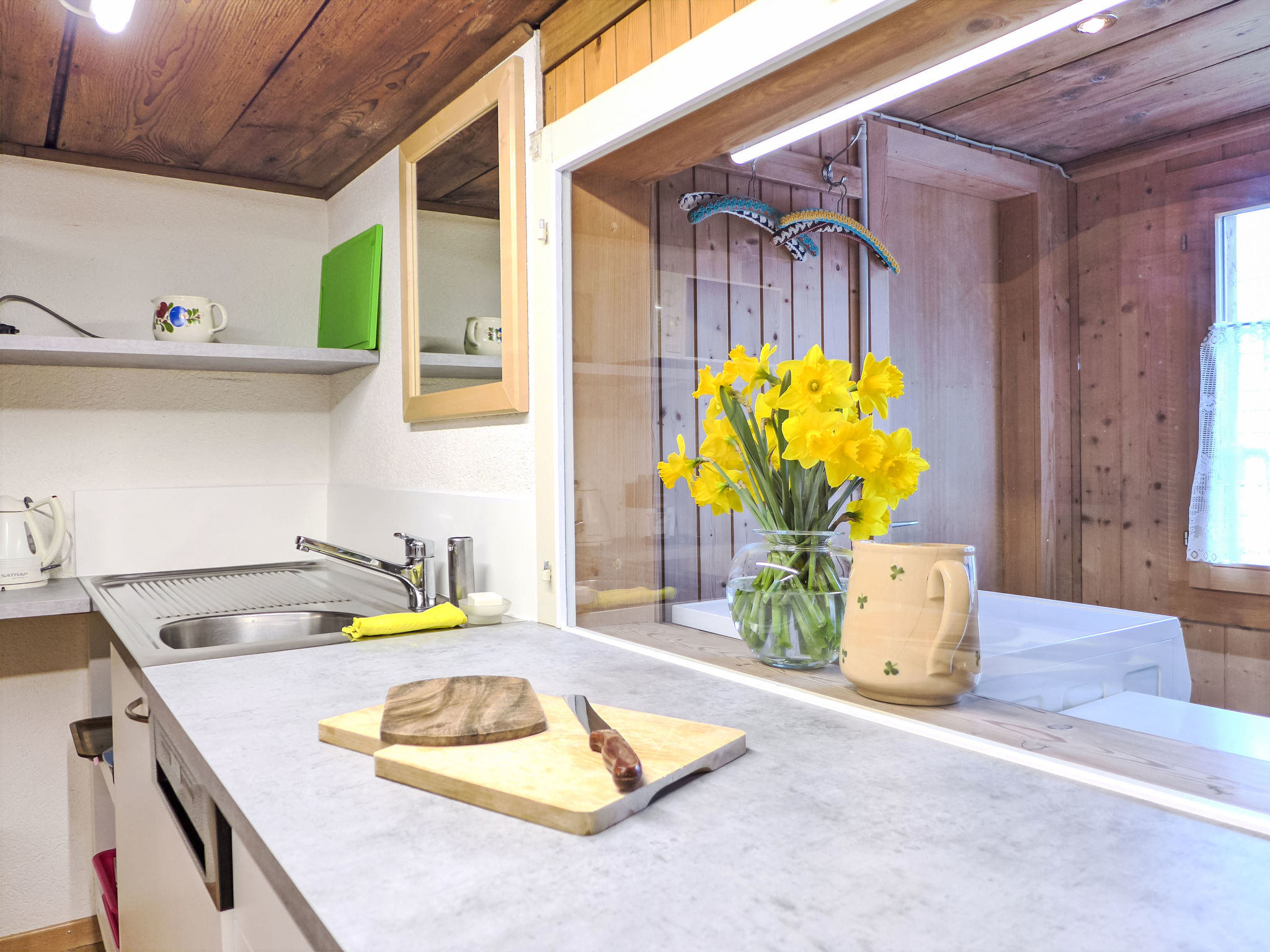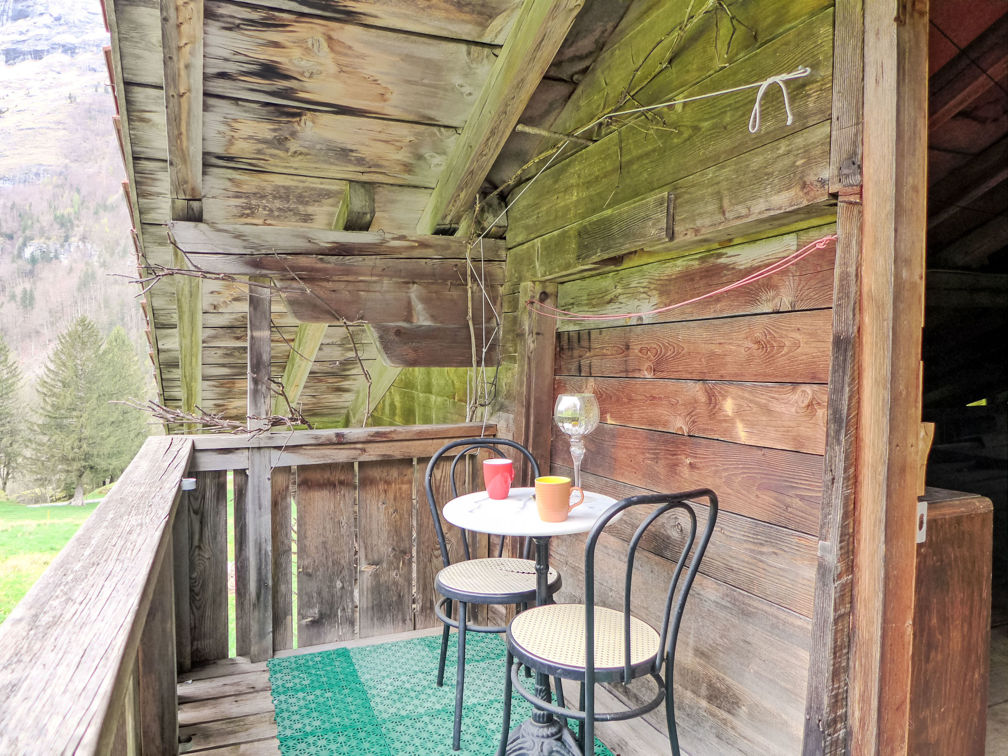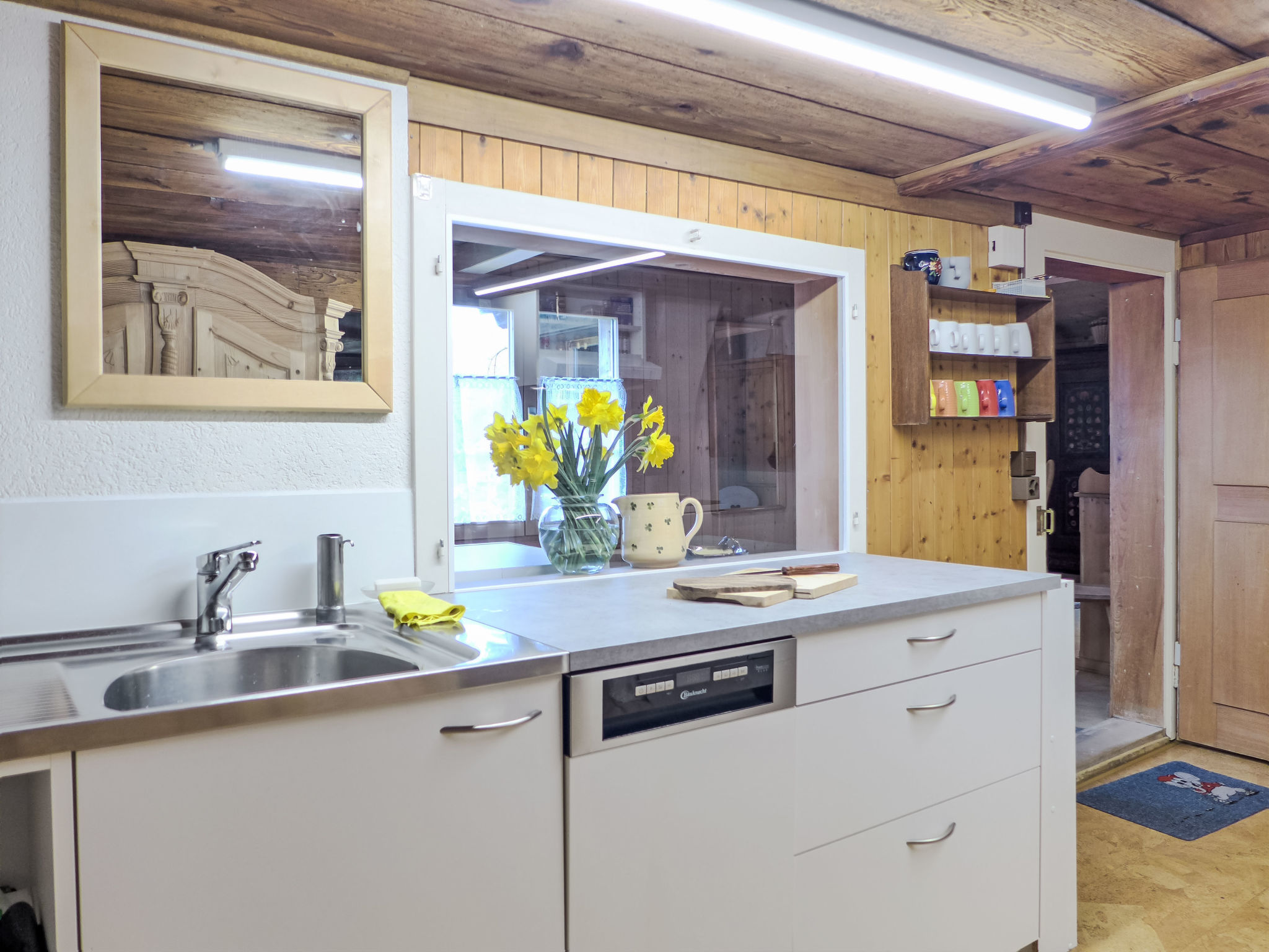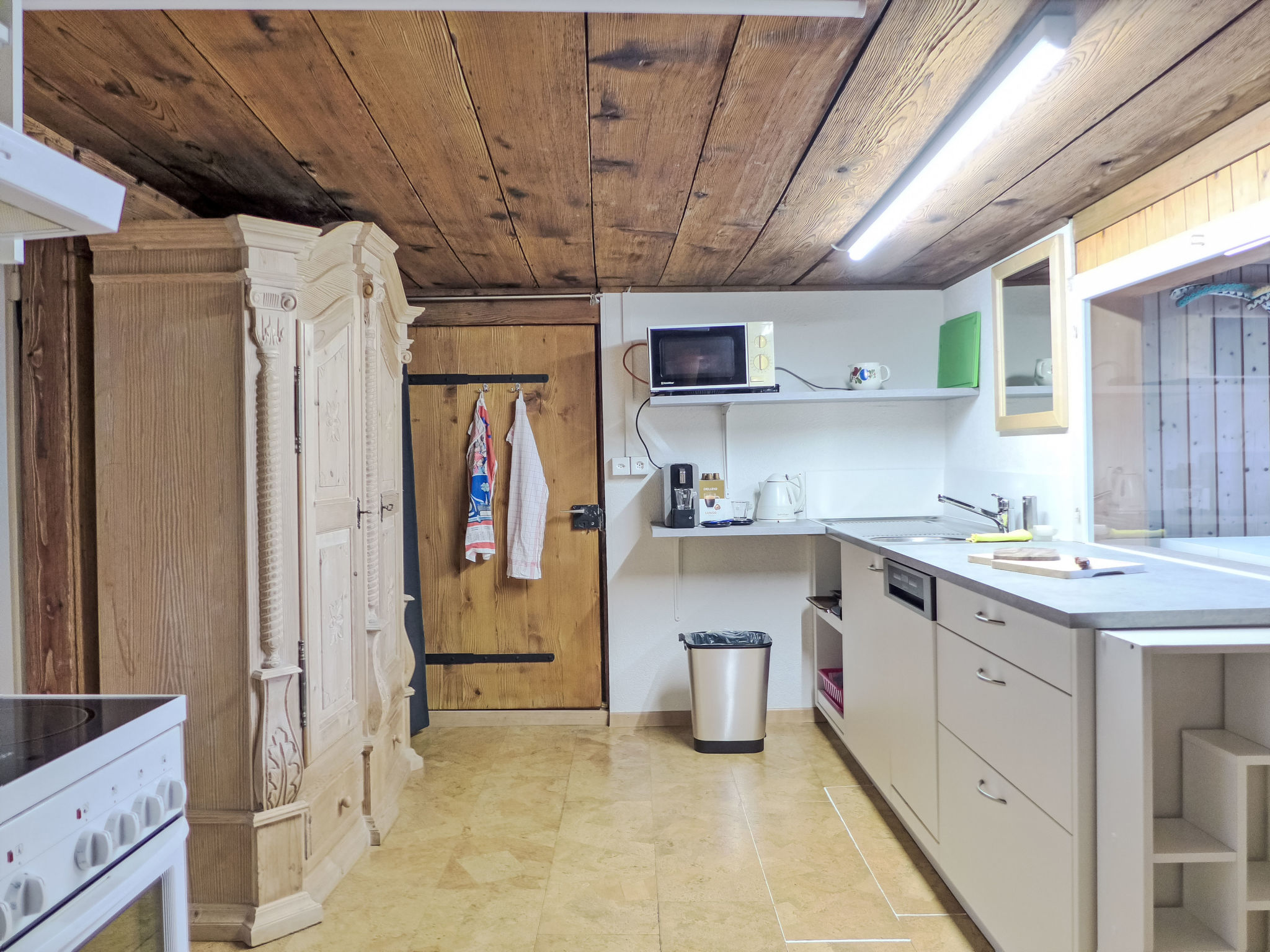 5-Zimmer-Chalet auf 2 Stockwerken. Geräumig, teilweise abgeschrägt, sehr einfach und gemütlich eingerichtet: Deckenhöhe 180 - 190 cm, niedrige Türrahmen, Höhe 180 cm. Wohn-/Schlafzimmer mit 1 Bett (90 cm, Länge 200 cm), TV. 1 grosses Zimmer mit 1 Doppelbett (2 x 90 cm, Länge 200 cm). 1 kleines Zimmer mit 1 Bett (90 cm, Länge 200 cm). Offenes Wohn-/Esszimmer mit Esstisch. Offene Küche (4 Glaskeramikplatten, Toaster, Wasserkocher, Mikrowelle, elektrische Kaffeemaschine, Kapseln für die Kaffeemaschine (Delizio) extra, Racletteofen, Fondue Set (Käse)). Bad/WC. Unteres Geschoss: (Aussentreppe) 1 Zimmer, Deckenhöhe 170 - 185 cm mit 1 Doppelbett (2 x 90 cm, Länge 200 cm). Holzdielenboden. Terrasse. Terrassenmöbel. Herrliche Panoramasicht auf die Berge und die Landschaft. Zur Verfügung: Haartrockner. Internet (WLAN, gratis). Parkplatz beim Haus. Bitte beachten: ein Doppelzimmer liegt außerhalb der Wohnung. Nichtraucher-Haus. Maximal 2 Haustiere/Hunde erlaubt. Keine interne Verbindung zwischen den Etagen.