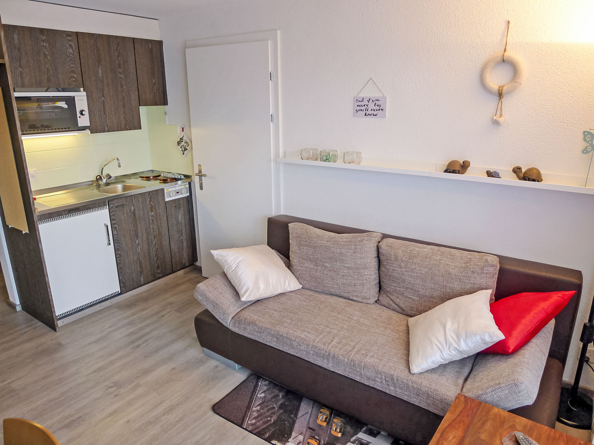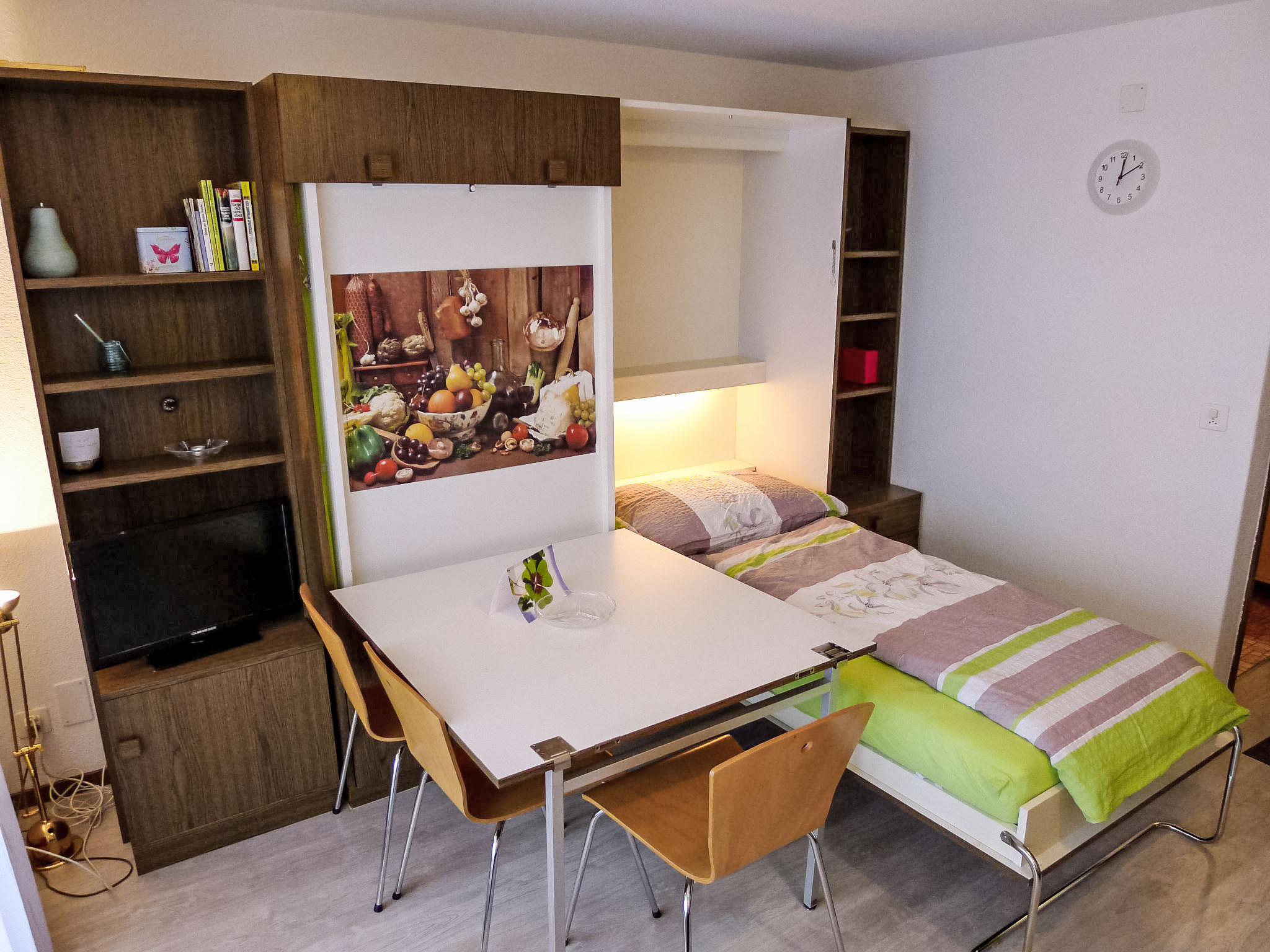 "Annex", 1-Zimmer-Studio 22 m2, im Erdgeschoss. Zweckmässig und gemütlich eingerichtet: Wohn-/Esszimmer mit 2 Wandschrankbetten und Kabel-TV (Flachbildschirm). Ausgang zur Terrasse. Kochnische (2 Kochplatten, Mini-Backofen, elektrische Kaffeemaschine). Dusche/WC. Grosse Terrasse. Terrassenmöbel. Eingeschränkte Sicht auf den See, die Landschaft und die Ortschaft. Zur Verfügung: Babybett. Internet (Wireless LAN, gratis). Parkplatz (1 Auto) beim Haus. Bitte beachten: Nichtraucher-Unterkunft. Tür an Tür mit Wohnung Ramabrice CH6376.400.4.