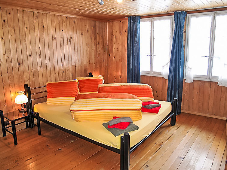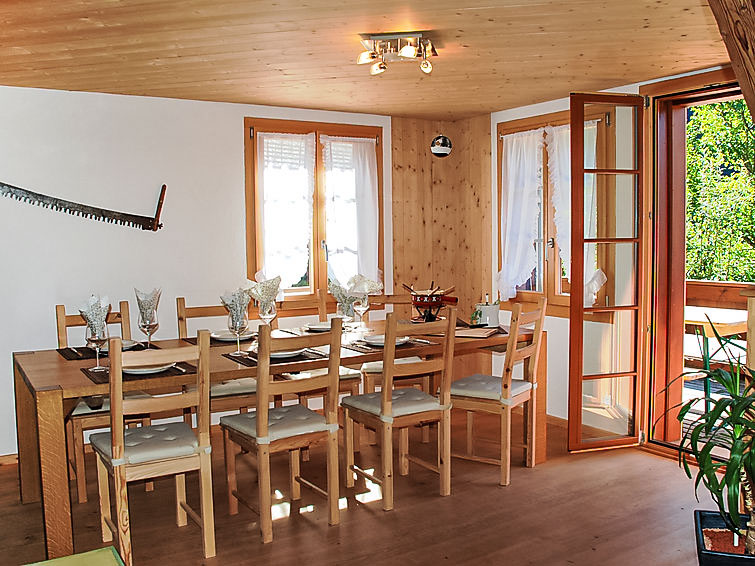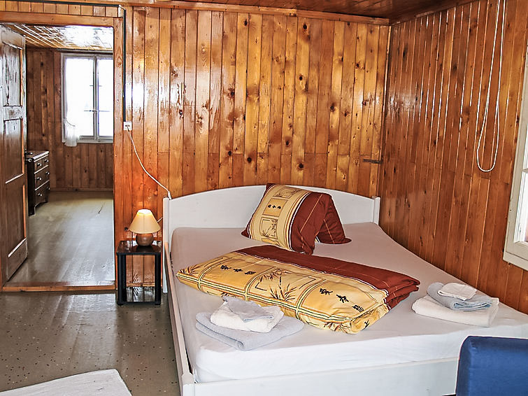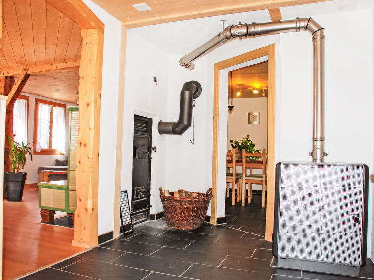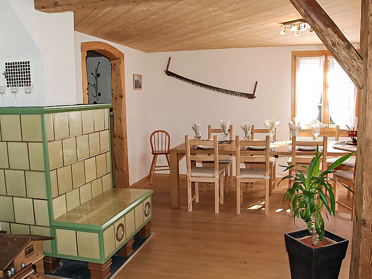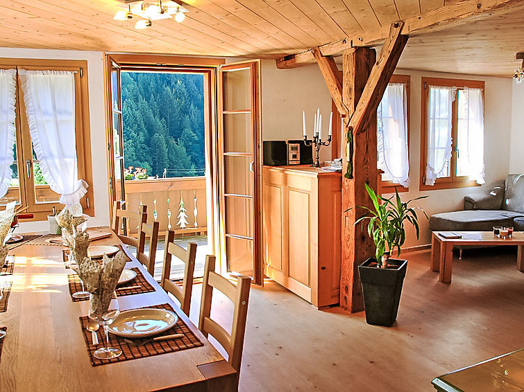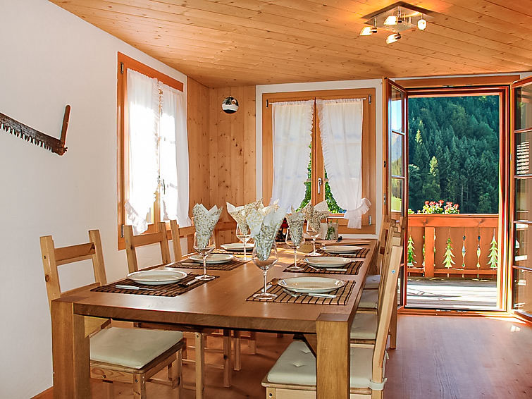 5-Zimmer-Chalet 110 m2 auf 2 Stockwerken. Geräumig und hell, komfortabel und mit viel Holz eingerichtet: offenes Wohn-/Esszimmer mit Esstisch, TV und DVD. Ausgang zur Terrasse, Richtung Südwesten. Grosse Wohnküche (Backofen, Geschirrspüler, 4 Glaskeramikplatten, Toaster, Wasserkocher, elektrische Kaffeemaschine, Kapseln für die Kaffeemaschine (Nespresso) extra, Racletteofen, Fondue Set (Käse)) mit Esstisch. Bad/WC. Ölheizung. Heizung nicht in allen Räumen. Obergeschoss: 1 Doppelzimmer mit 1 franz. Bett (1 x 180 cm, Länge 200 cm), Stereoanlage. Durchgangszimmer mit 1 franz. Bett. Ausgang zum Balkon. 1 Doppelzimmer mit 2 Betten. Grosse Terrasse 25 m2 teilweise überdacht. Sehr schöne Sicht auf die Berge, die Landschaft und den Fluss. Zur Verfügung: Waschmaschine, Kinderhochstuhl, Babybett bis 3 Jahre, Haartrockner, Holz (gratis). Internet (Wireless LAN). Bitte beachten: Nichtraucher-Haus.