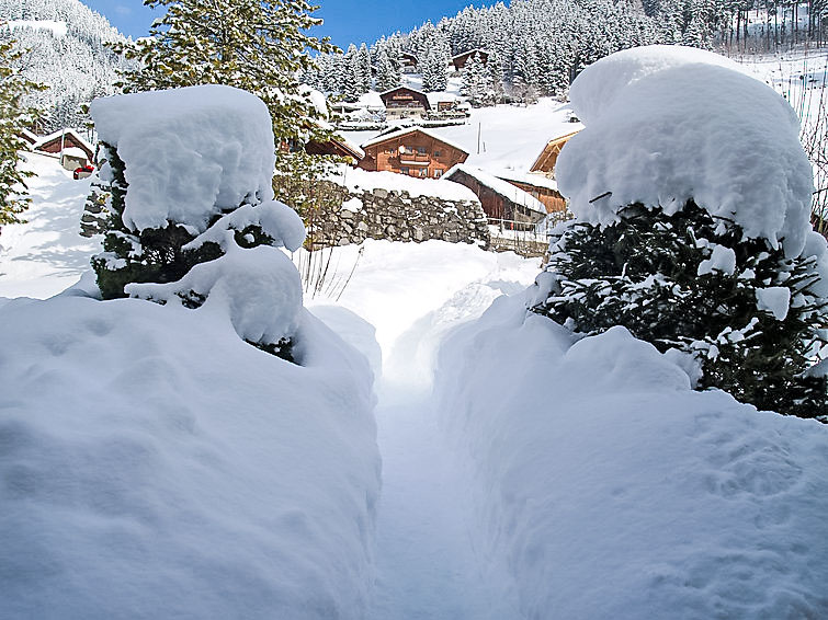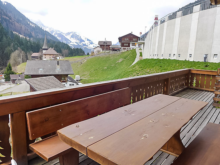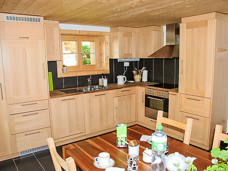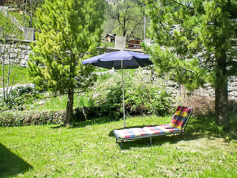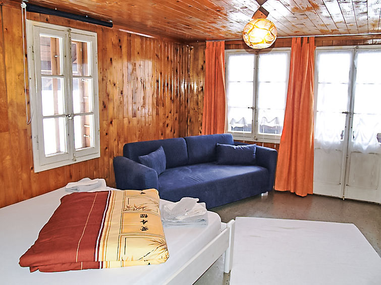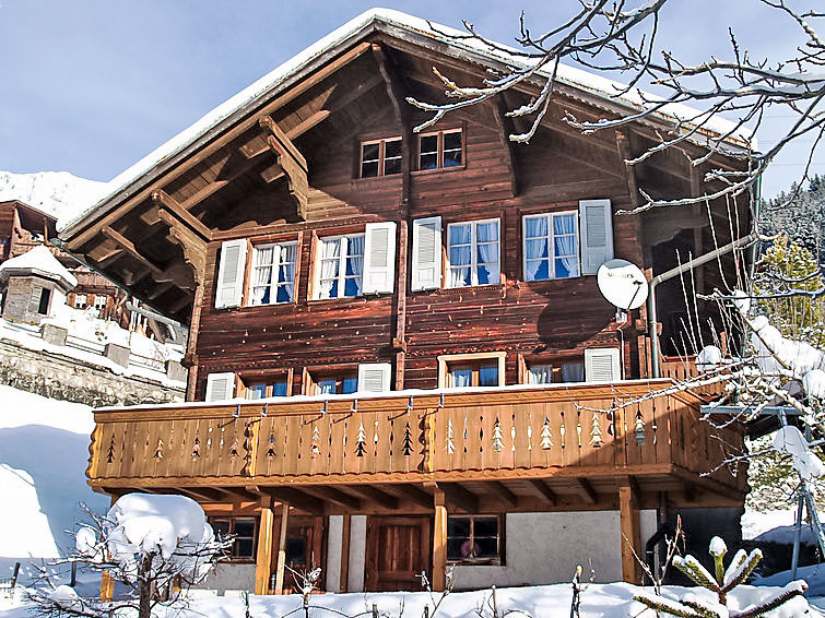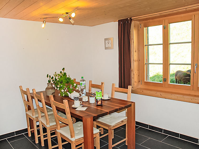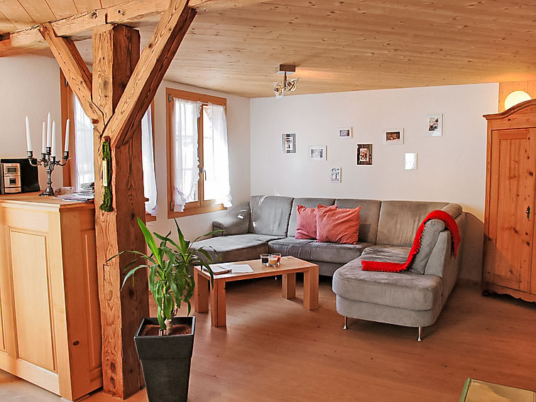 5-Zimmer-Chalet 110 m2 auf 2 Stockwerken. Geräumig und hell, komfortabel und mit viel Holz eingerichtet: offenes Wohn-/Esszimmer mit Esstisch, TV und DVD. Ausgang zur Terrasse, Richtung Südwesten. Grosse Wohnküche (Backofen, Geschirrspüler, 4 Glaskeramikplatten, Toaster, Wasserkocher, elektrische Kaffeemaschine, Kapseln für die Kaffeemaschine (Nespresso) extra, Racletteofen, Fondue Set (Käse)) mit Esstisch. Bad/WC. Ölheizung. Heizung nicht in allen Räumen. Obergeschoss: 1 Doppelzimmer mit 1 franz. Bett (1 x 180 cm, Länge 200 cm), Stereoanlage. Durchgangszimmer mit 1 franz. Bett. Ausgang zum Balkon. 1 Doppelzimmer mit 2 Betten. Grosse Terrasse 25 m2 teilweise überdacht. Sehr schöne Sicht auf die Berge, die Landschaft und den Fluss. Zur Verfügung: Waschmaschine, Kinderhochstuhl, Babybett bis 3 Jahre, Haartrockner, Holz (gratis). Internet (Wireless LAN). Bitte beachten: Nichtraucher-Haus.
