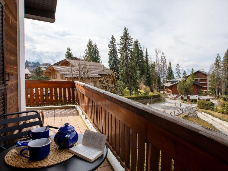 "Montagnards 12", 2-Zimmer-Wohnung im 2. Stock. Zweckmässig und komfortabel eingerichtet: Wohn-/Esszimmer mit Esstisch. Ausgang zum Balkon, Richtung Süden und Richtung Osten. 1 Zimmer mit 1 franz. Bett (1 x 160 cm). Küche (Backofen, Geschirrspüler, 4 Flammen, Toaster, Wasserkocher, Mikrowelle, elektrische Kaffeemaschine, Kapseln für die Kaffeemaschine (Nespresso Vertuo) extra, Racletteofen, Fondue Set (Käse)). Bad/WC. Grosser Balkon, Südlage und Ostlage. Balkonmöbel. Sehr schöne Sicht auf die Berge. Zur Verfügung: Internet (WLAN, gratis). Bitte beachten: Nichtraucher-Unterkunft.