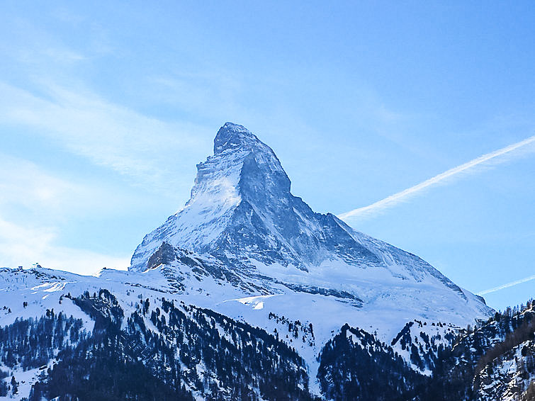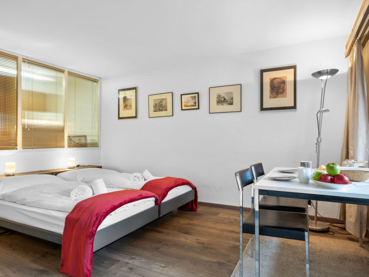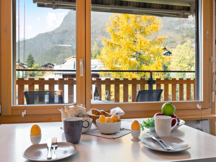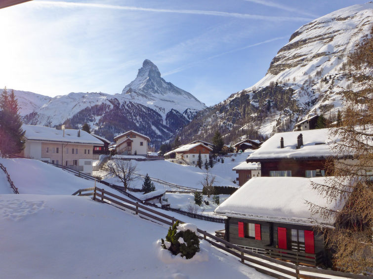 1-Zimmer-Studio 40 m2 im 2. Stock, Südlage. Hell, einfach und komfortabel eingerichtet: Wohn-/Schlafzimmer mit 2 Betten (90 cm, Länge 200 cm), Esstisch und TV. Ausgang zum Balkon, Richtung Süden. Kleine Küche (3 Kochplatten, Backofen, Toaster, Wasserkocher, Mikrowelle, Tiefkühler, elektrische Kaffeemaschine, Racletteofen, Fondue Set (Käse)). Bad/WC. Balkon. Balkonmöbel. Schöne Sicht auf Matterhorn. Zur Verfügung: Haartrockner. Internet (Wireless LAN, gratis). Bitte beachten: Nichtraucher-Unterkunft.
