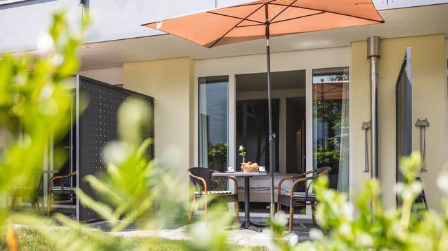 Der südseitige Garten erhebt sich über die umgebenden Häuser, auf den Sie auch von den Terrassen der südseitigen Zimmer einen wunderbaren Ausblick genießen. Alle Terrassen verfügen über Sitzgelegenheiten und eine Sonnenliege.