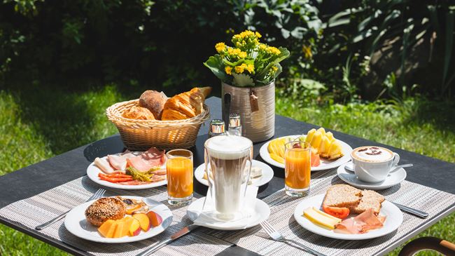 Beginnen Sie den Tag am reichhaltigen Frühstücksbuffet mit ausgewählten Produkten der Region sowie hausgemachter Marmelade und aromatischem Tee aus dem Samowar.
