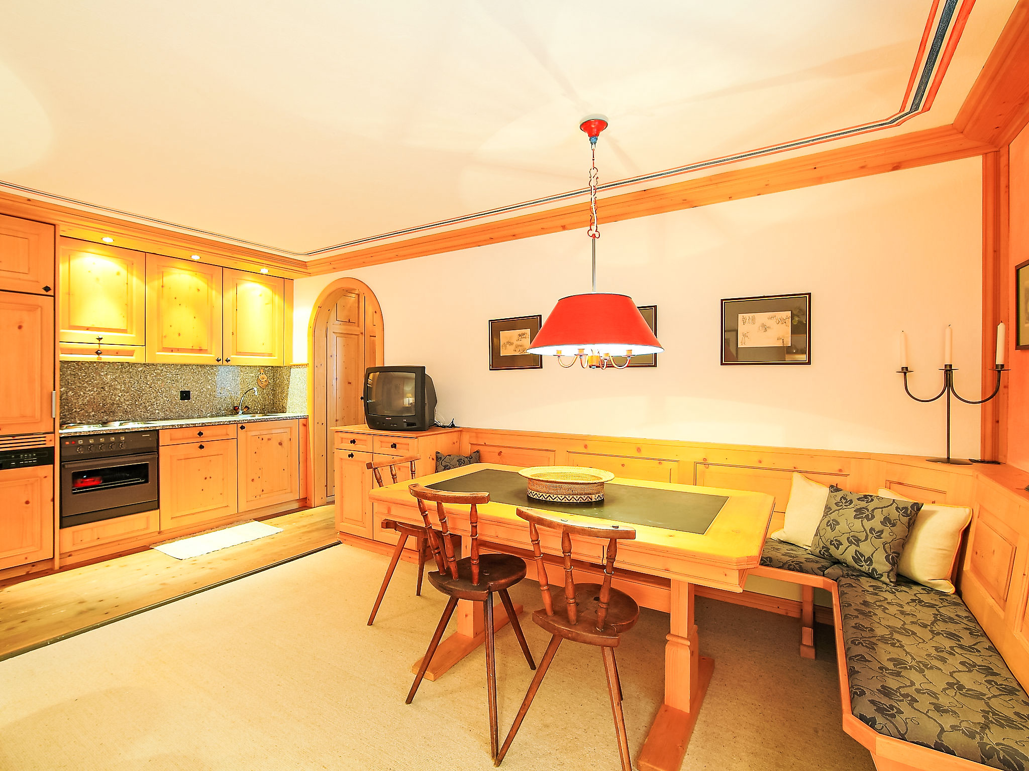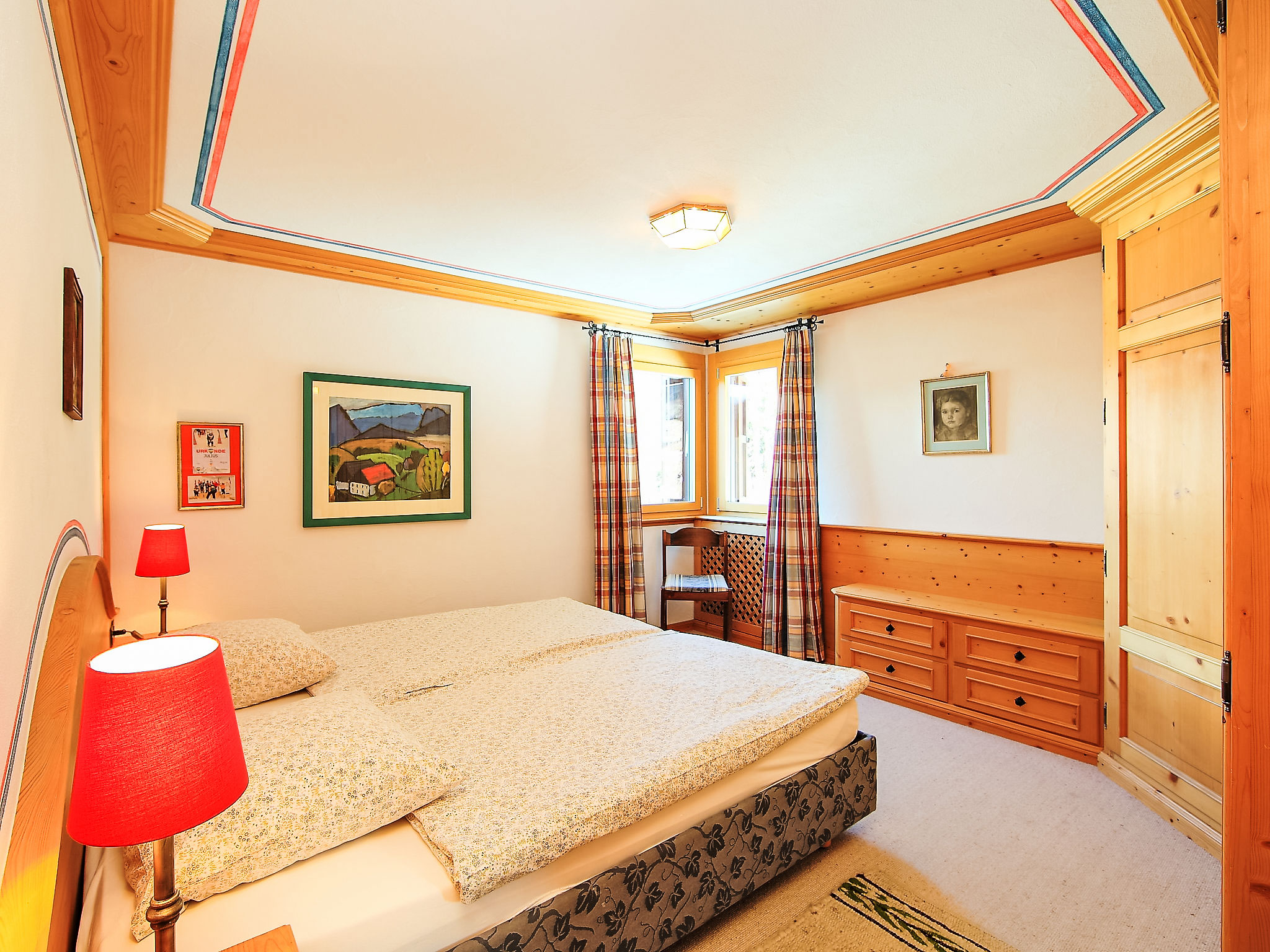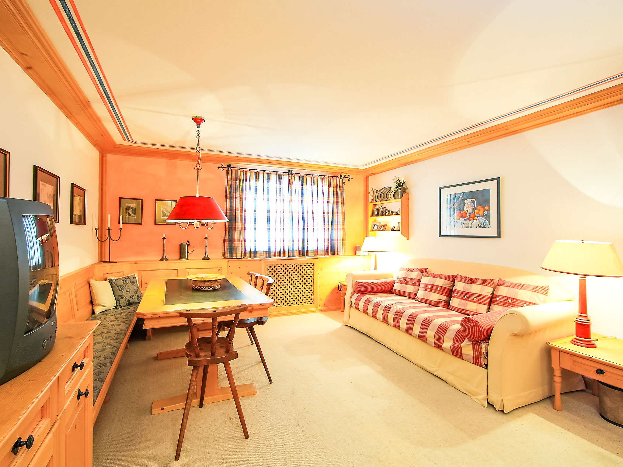"Residenza Chesa Margun 57-4", 2-Zimmer-Wohnung 47 m2, Nordlage. Rustikal und gemütlich eingerichtet: Wohn-/Esszimmer mit TV und Radio. 1 Zimmer mit 2 Betten. Offene Küche (Backofen, Geschirrspüler). Bad/WC. Sicht auf die Berge, die Ortschaft und den Wald. Bitte beachten: Nichtraucher-Unterkunft.