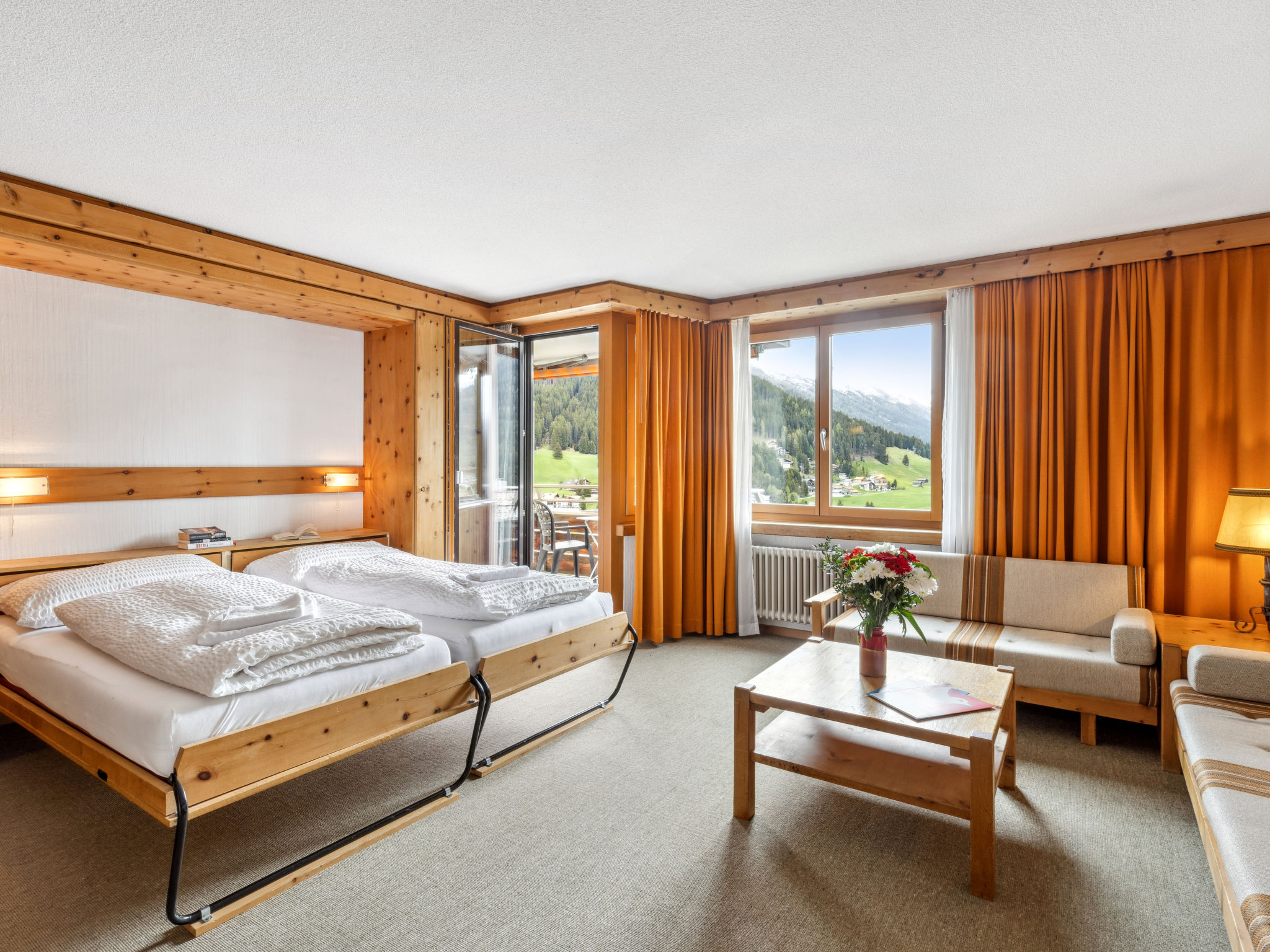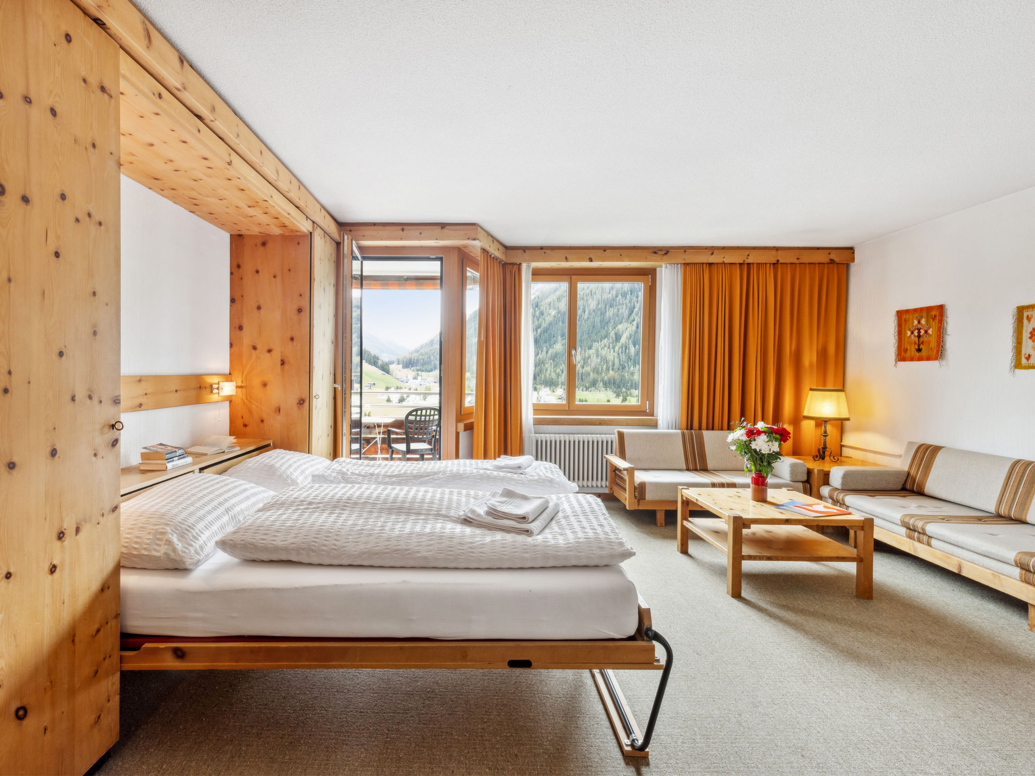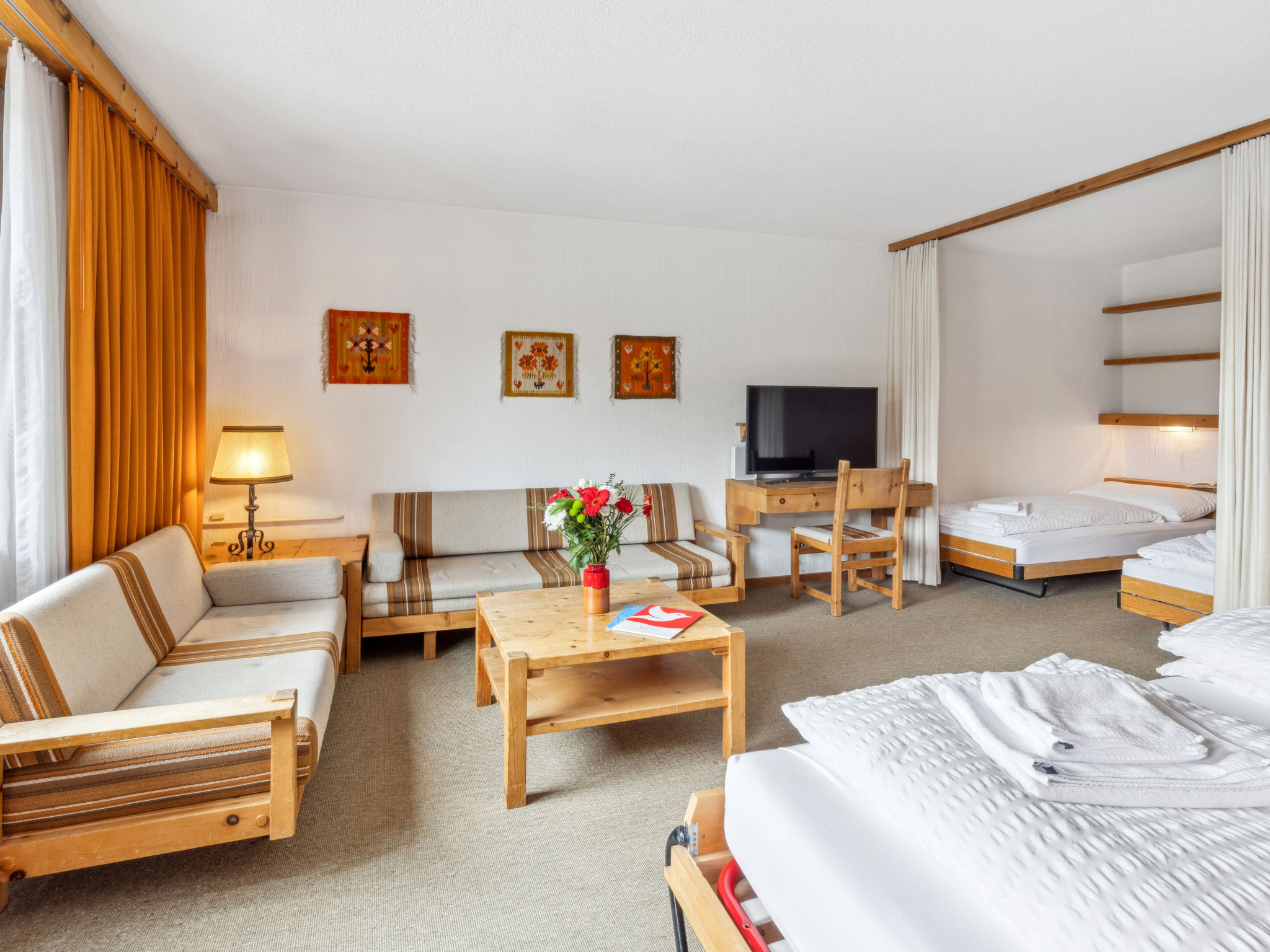 "Guardaval Apt 104", 1-Zimmer-Wohnung 50 m2 im 1. Stock. Wohn-/Esszimmer mit 2 Wandschrankbetten und Kabel-TV (Flachbildschirm), Radio. Ausgang zum Balkon. Schlafnische mit Vorhang mit 2 Betten. Küche (Backofen, Geschirrspüler, 4 Glaskeramikplatten). Bad/WC. Balkon 7 m2, Südlage. Schöne Sicht auf die Berge, die Landschaft und die Ortschaft. Zur Verfügung: Internet (WLAN, gratis). Parkplatz. Bitte beachten: Nichtraucher-Unterkunft. Anstelle eines abgeschlossenen Schlafzimmers befinden sich manche Schlafplätze in einem offenen Bereich (Galerie, Nische etc.). 40993