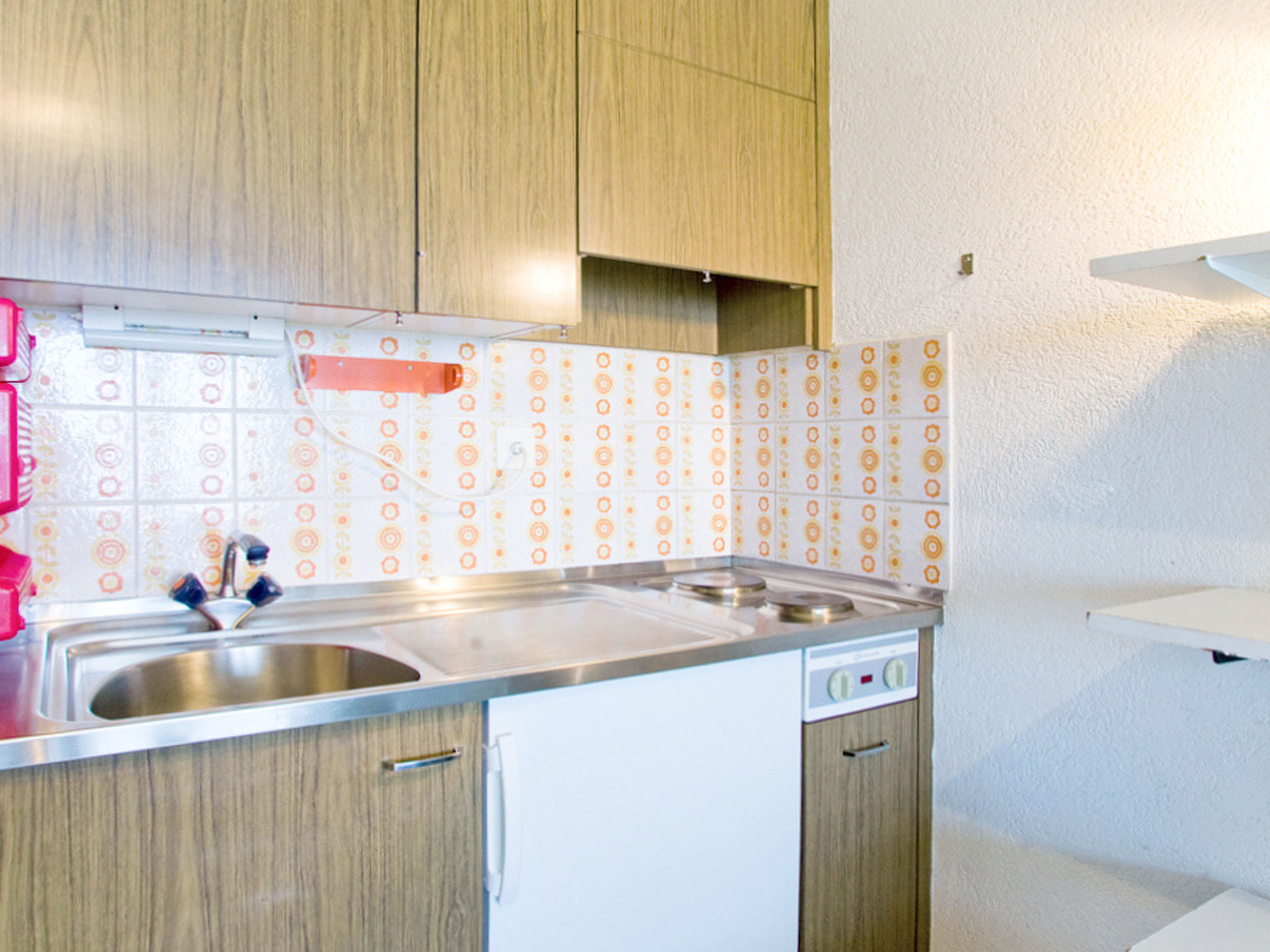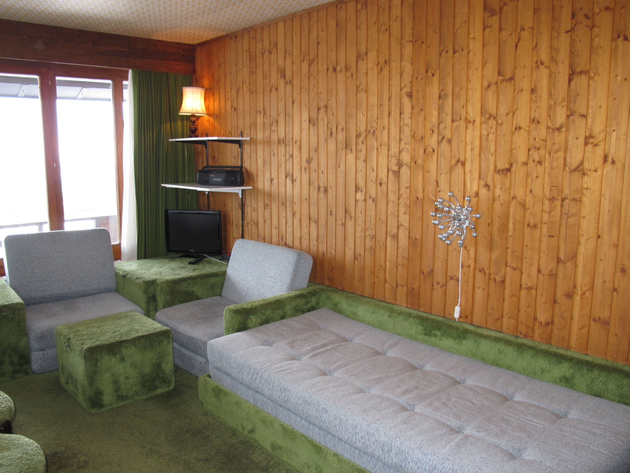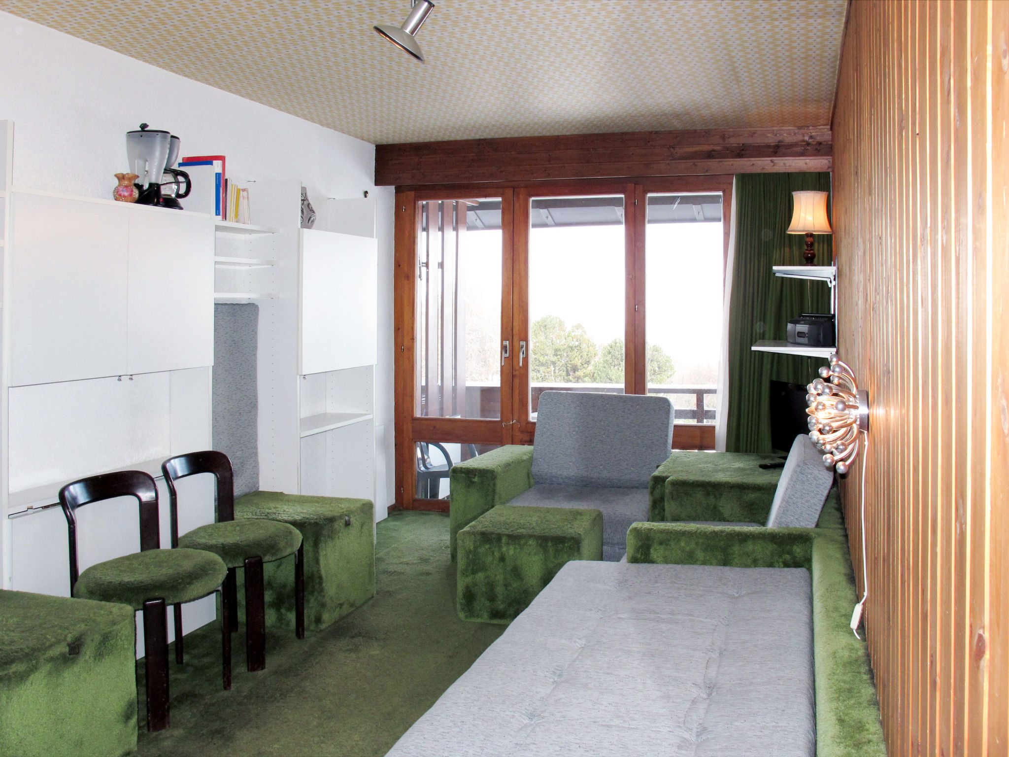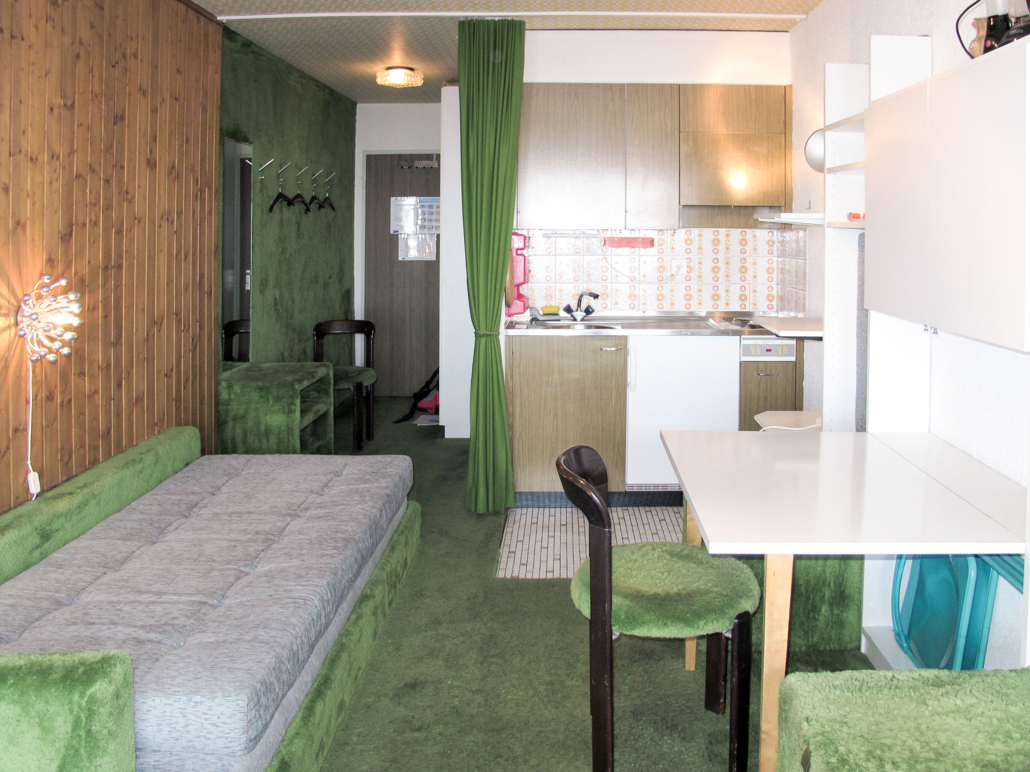 "Résidence Velan", 1-Zimmer-Studio 25 m2 im 2. Stock. Zweckmässig eingerichtet: Wohn-/Schlafzimmer mit 1 Diwanbett (90 cm, Länge 180 cm), 1 Schlafmöglichkeit, Kabel-TV und DVD. Ausgang zum Balkon. (2 Kochplatten, elektrische Kaffeemaschine). Dusche/WC. Balkon. Zur Verfügung: Internet (Wireless LAN, extra). Bitte beachten: Nichtraucher-Unterkunft.
