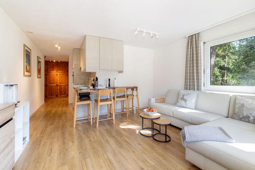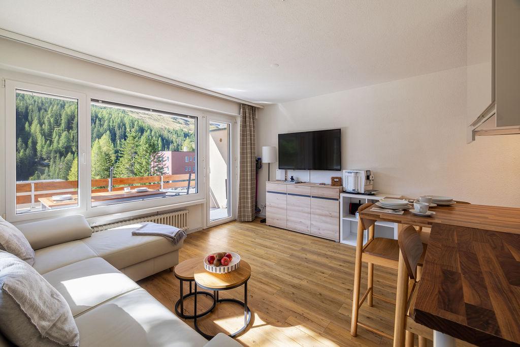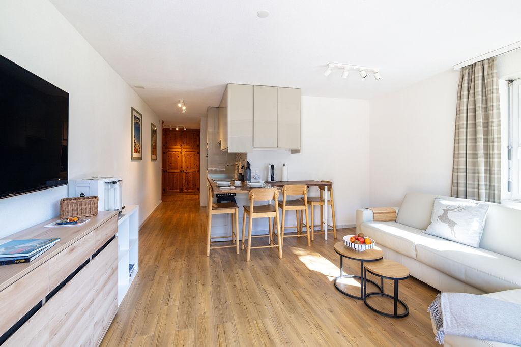 Ein helles und stilvolles Apartment mit einem Schlafzimmer und atemberaubendem Bergblick. Ruhig und zentral liegt die Wohnung im 7. Stock eines Wohngebäudes an ruhiger Lage, mit integriertem Schwimmbad und Sauna zur Mitbenutzung, ausschliesslich in der Sommer & Wintersaison. In der Zwischensaison kann das Schwimmbad genutzt werden, das Wasser wird jedoch nicht geheizt. Diverse Wanderwege sind vom Haus «Irmella» aus einfach zu erreichen und das Zentrum sind nur einen kurzen Fussweg entfernt.