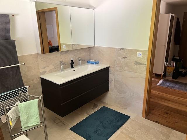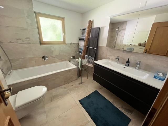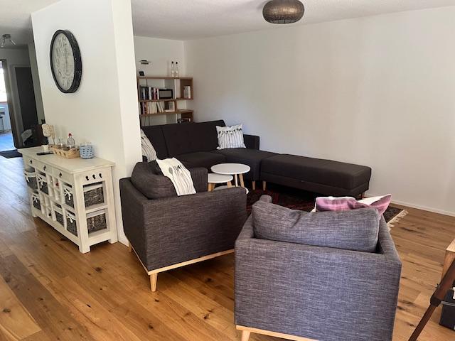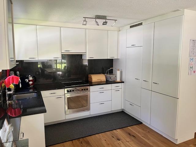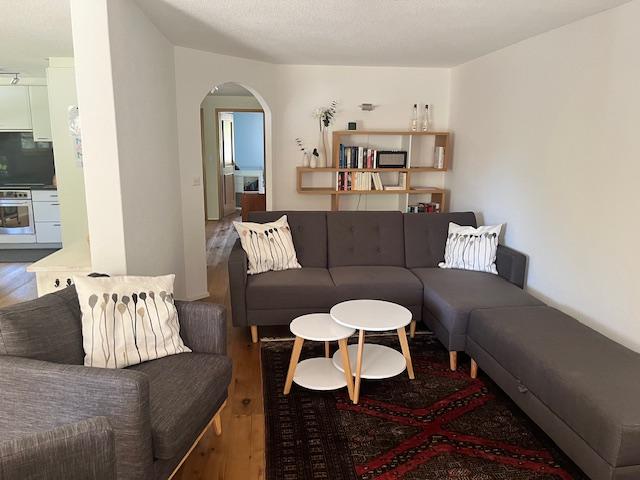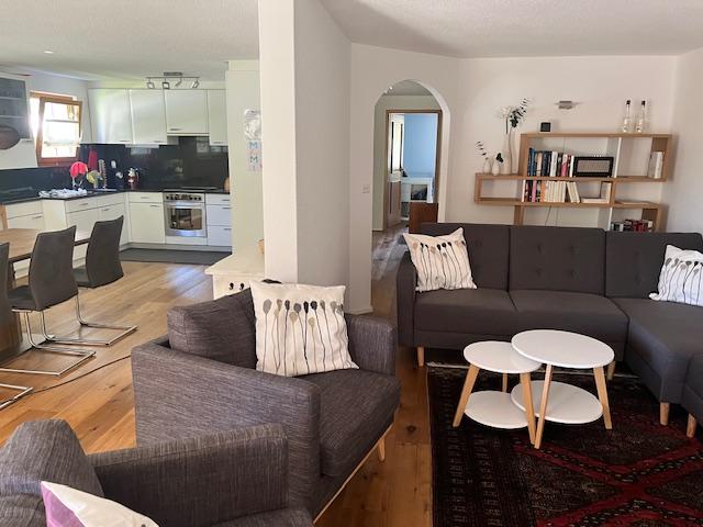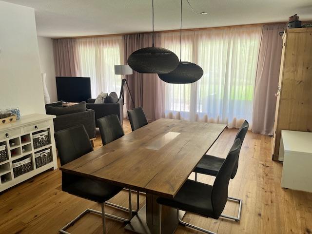 3-Zimmerwohnung (86m2) im EG für 6 Personen: grosser Wohn-/Essbereich, gratis WLAN, TV, DVD-Player, offene Küche mit Geschirrspüler, Kaffeemaschine, Toaster, Raclette/Tischgrill, Fondue-Set, uvm., 1 Schlafzimmer mit Doppelbett, 1 Schlafzimmer mit zwei ausziehbaren Einzelbetten, 1x Bad/WC, 1x Dusche/WC, Haarföhn, reservierter Parkplatz in Einstellhalle, grosszügige Terrasse mit Lounge-Sitzplatz und gemeinschaftlicher Liegewiese.