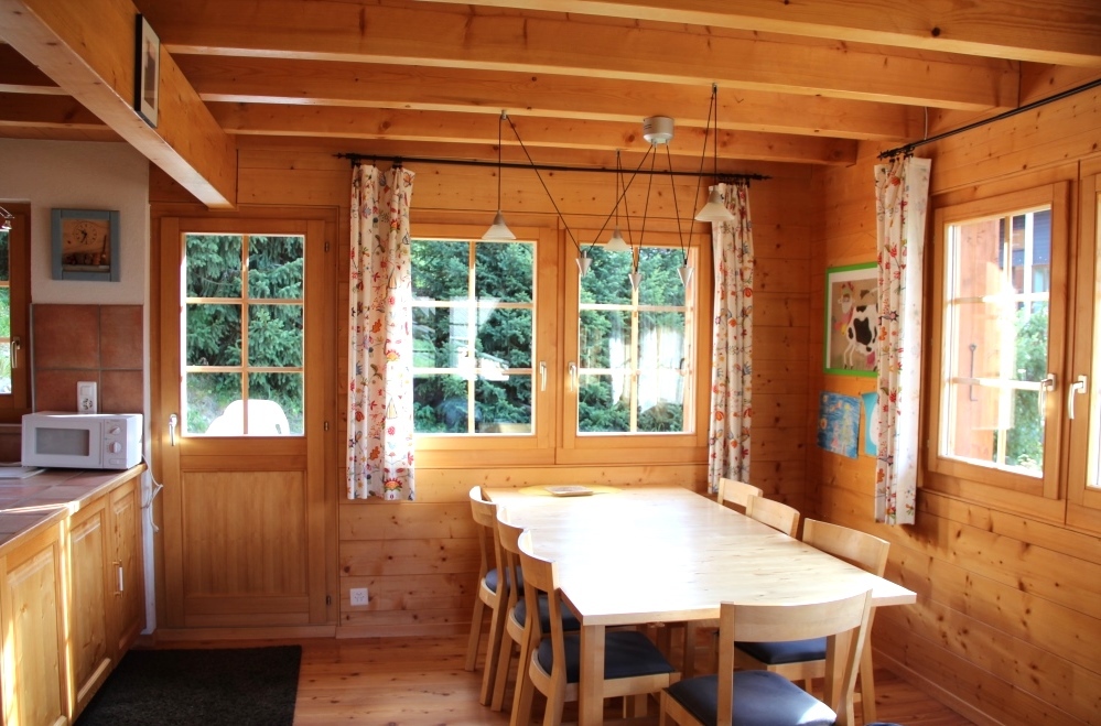 Charmantes Chalet für 8 Personen mit großer Terrasse und Balkon mit Gartenmöbeln.Innenraum : ca. 100 m2, Vorraum, Wohnzimmer mit Kaminofen, Essbereich -Schlafzimmer : 1 Schlafzimmer mit 1 Doppelbett, 1 Schlafzimmer mit 2 Einzelbetten, 1 Schlafzimmer mit 2 Etagenbetten -Sanitär : 1 Badezimmer mit Badewanne und Dusche und WC, separates WC im Erdgeschoss -Küche : offen, Cerankochfeld mit Backofen, Mikrowelle, Geschirrspüler, Kühlschrank, Kaffeemaschine -Sonstiges : Elektroheizung, Kabel-TV, Haustiere nicht erlaubt, Nichtraucher, 1 Garage mit Parkplatz davor, privater und direkter Zugang zur Standseilbahn über eine Treppe vom Chalet aus -