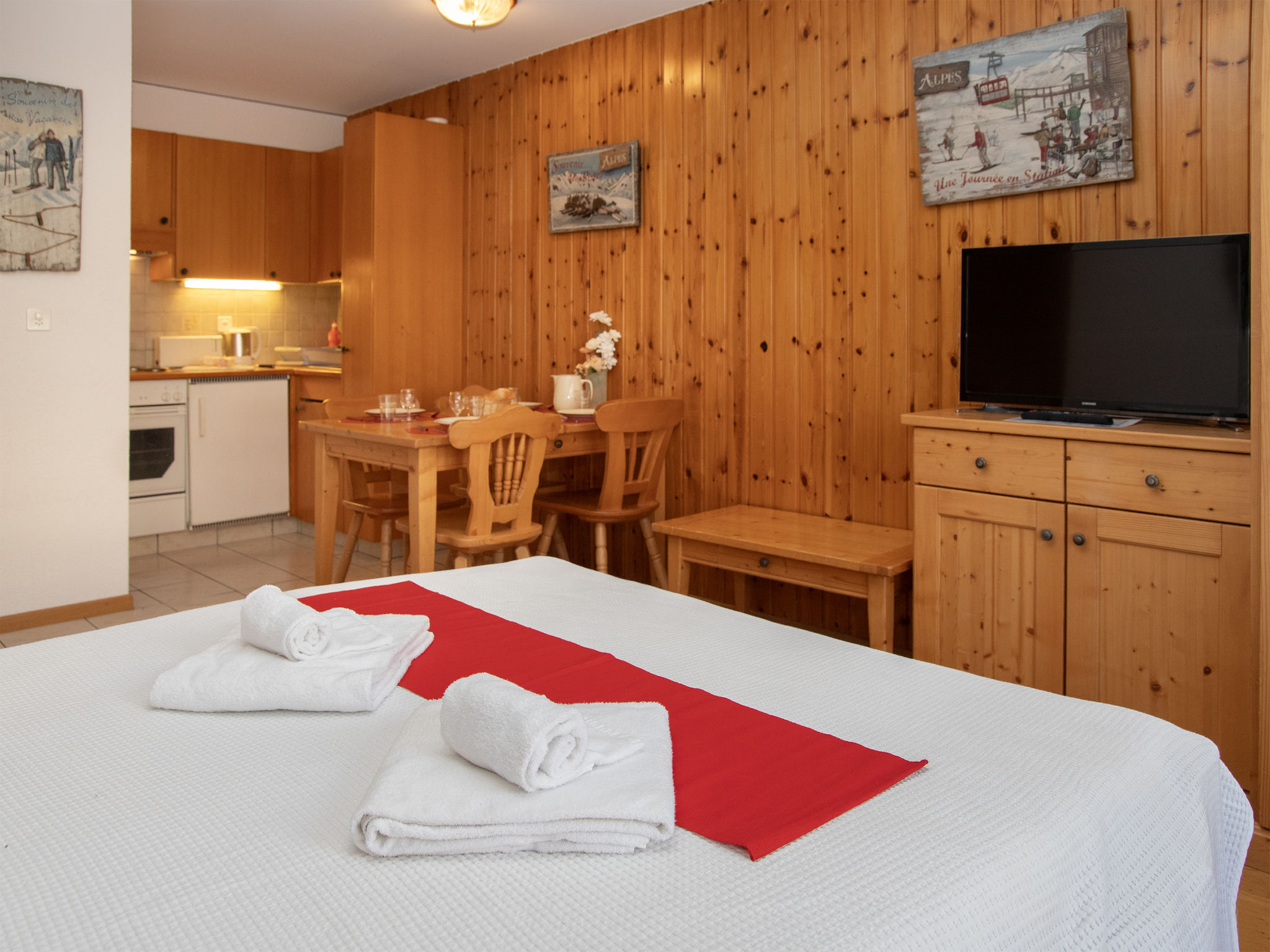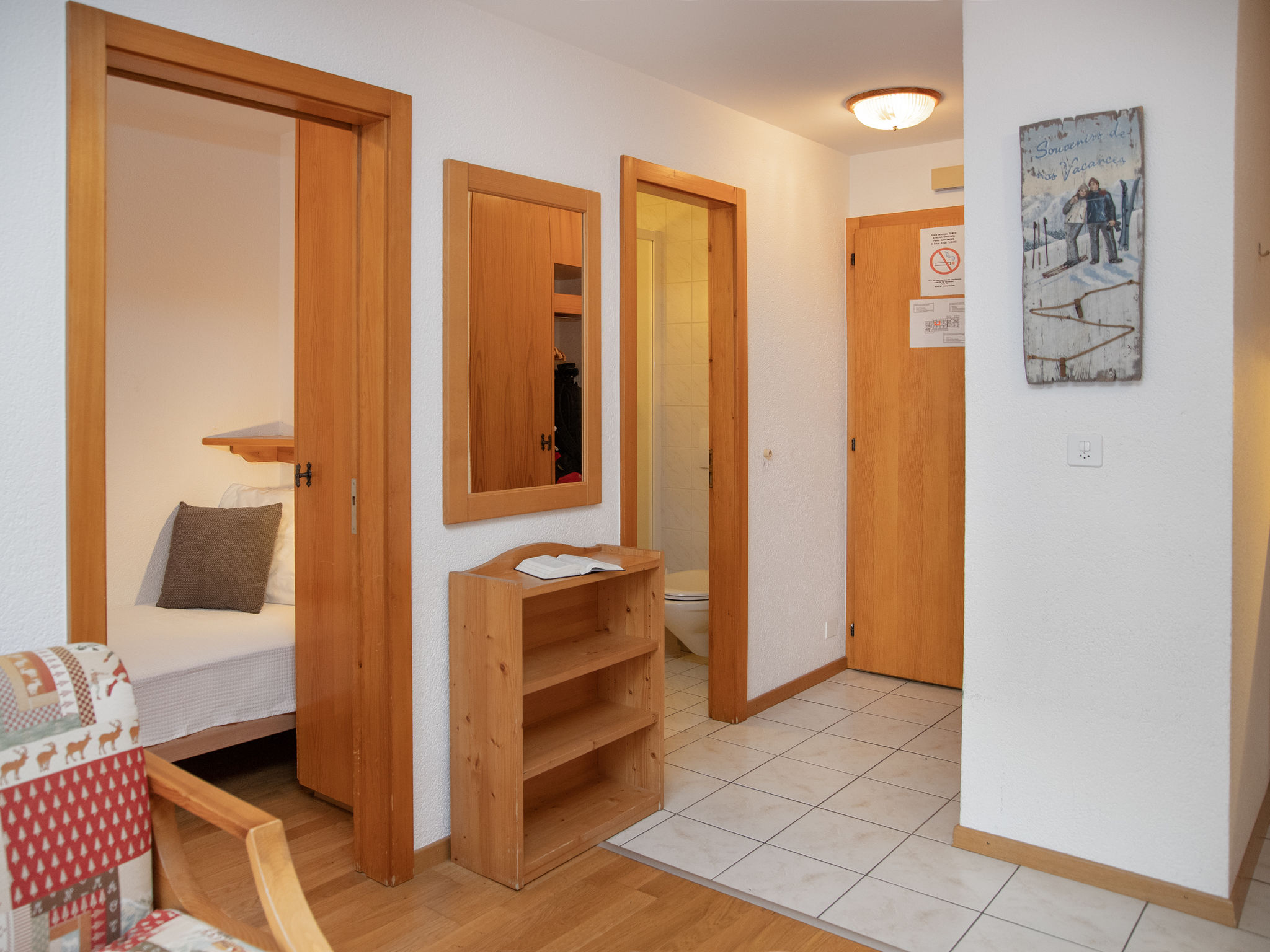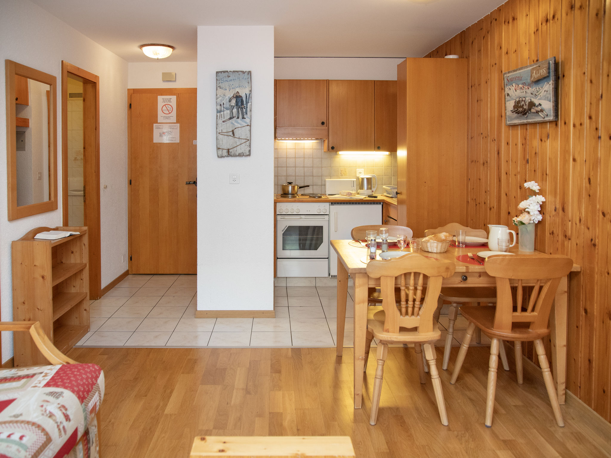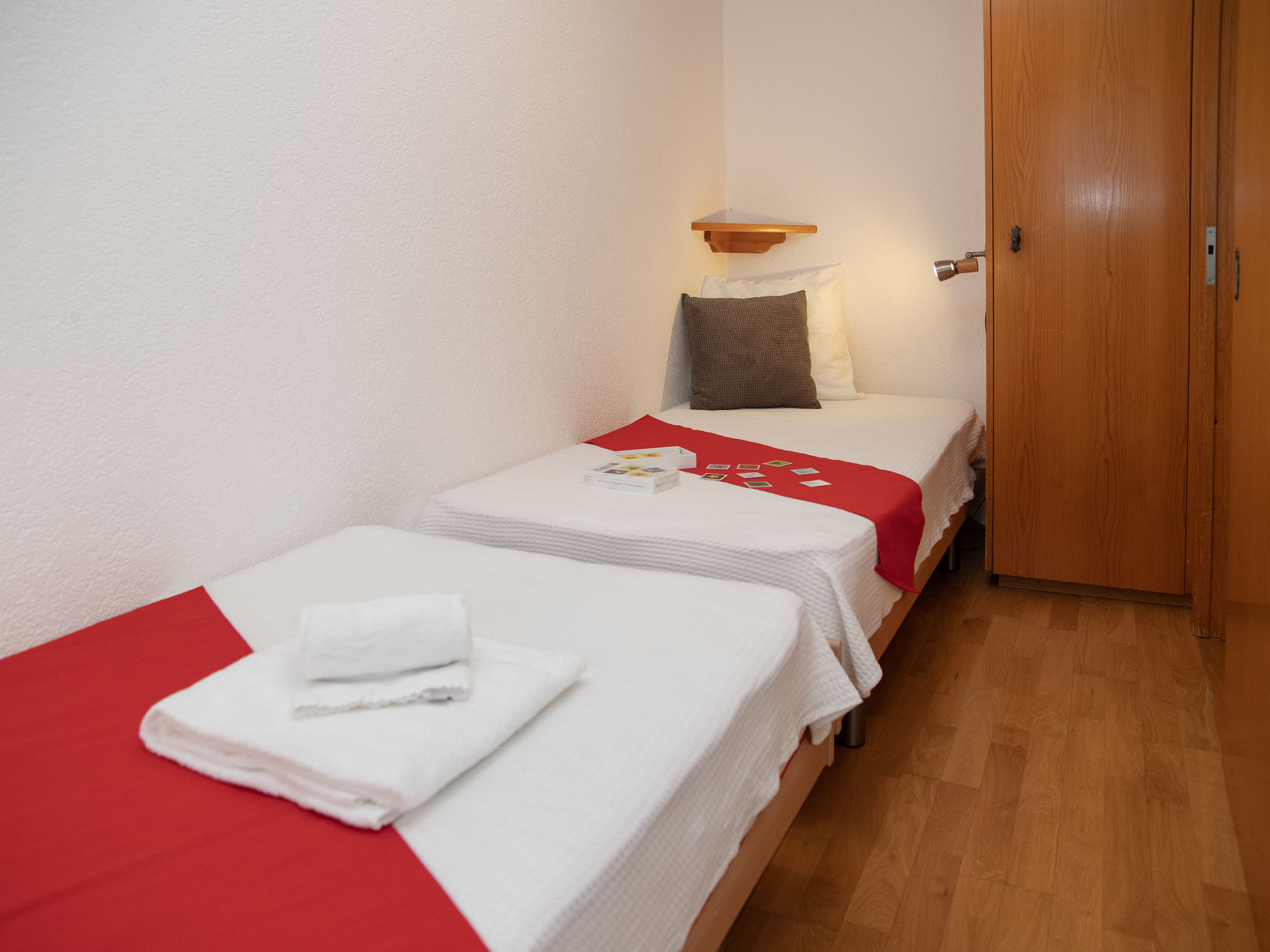 "Eaux-Vives 205", 2-Zimmer-Wohnung 42 m2 im 2. Stock, Nordlage. Objekt geeignet für 2 Erwachsene + 2 Kinder. Zweckmässig und komfortabel eingerichtet: Wohn-/Esszimmer mit 1 Diwanbett (160 cm, Länge 190 cm). 1 kleines Zimmer mit 2 Betten (90 cm, Länge 180 cm). Kleine Kochnische (4 Kochplatten, Toaster, Wasserkocher) mit Esstisch und Kabel-TV. Dusche/WC. Kleiner Balkon, Nordlage. Terrassenmöbel. Sicht auf die Ortschaft. Zur Verfügung: Haartrockner. Internet (WLAN). Garage Nr. 205 (1 Auto). Bitte beachten: geeignet für Familien. Nichtraucher-Unterkunft.