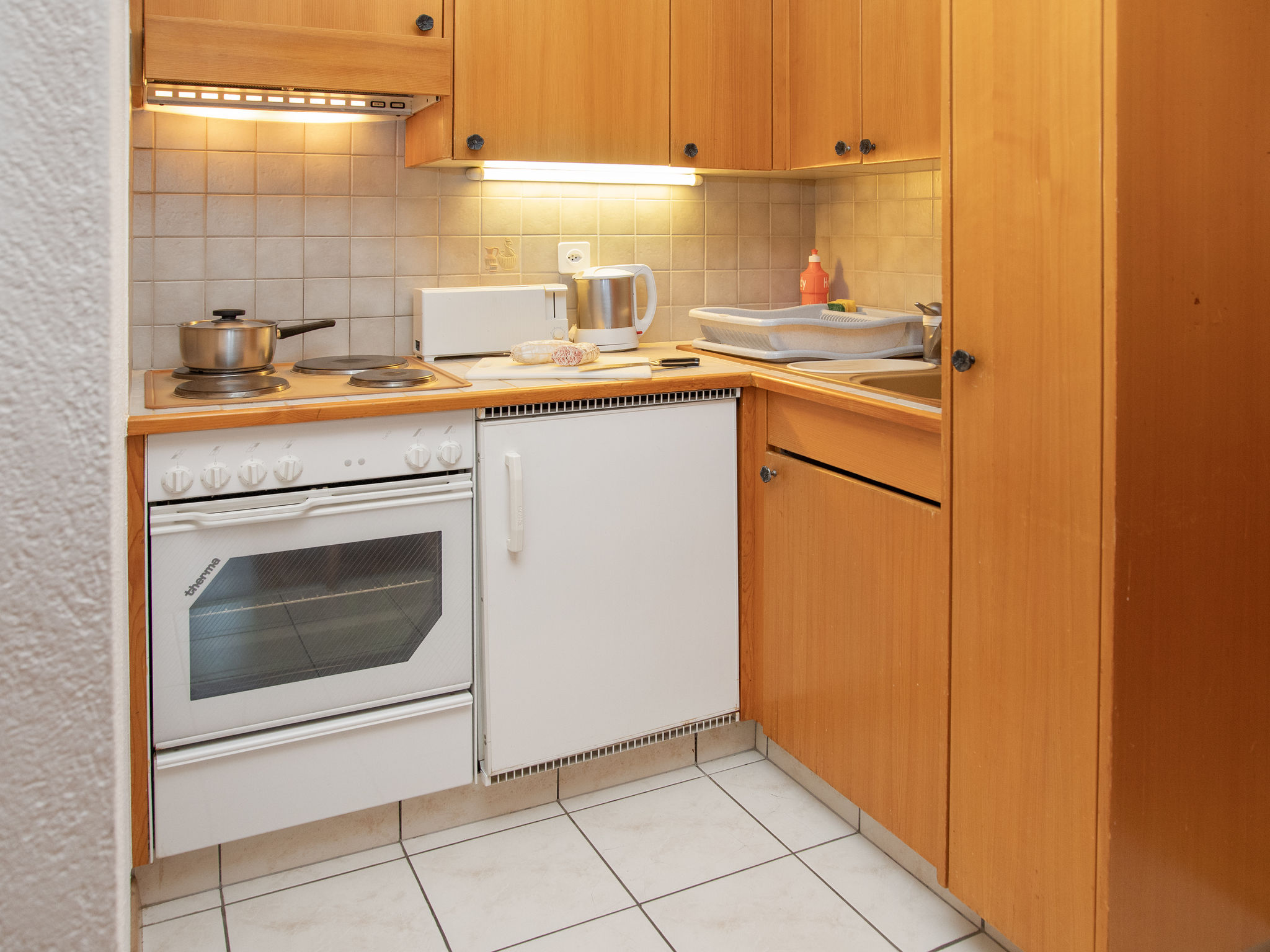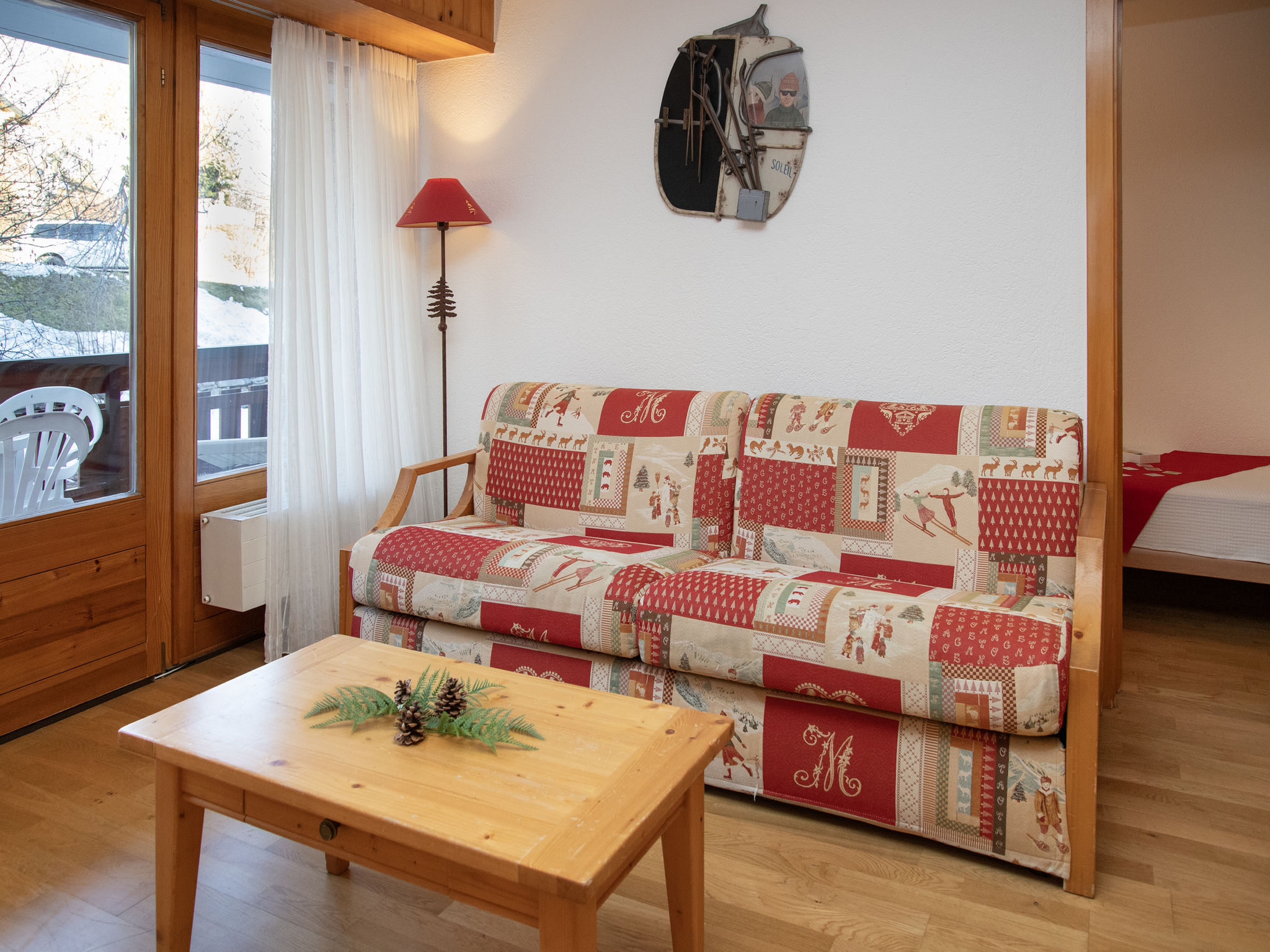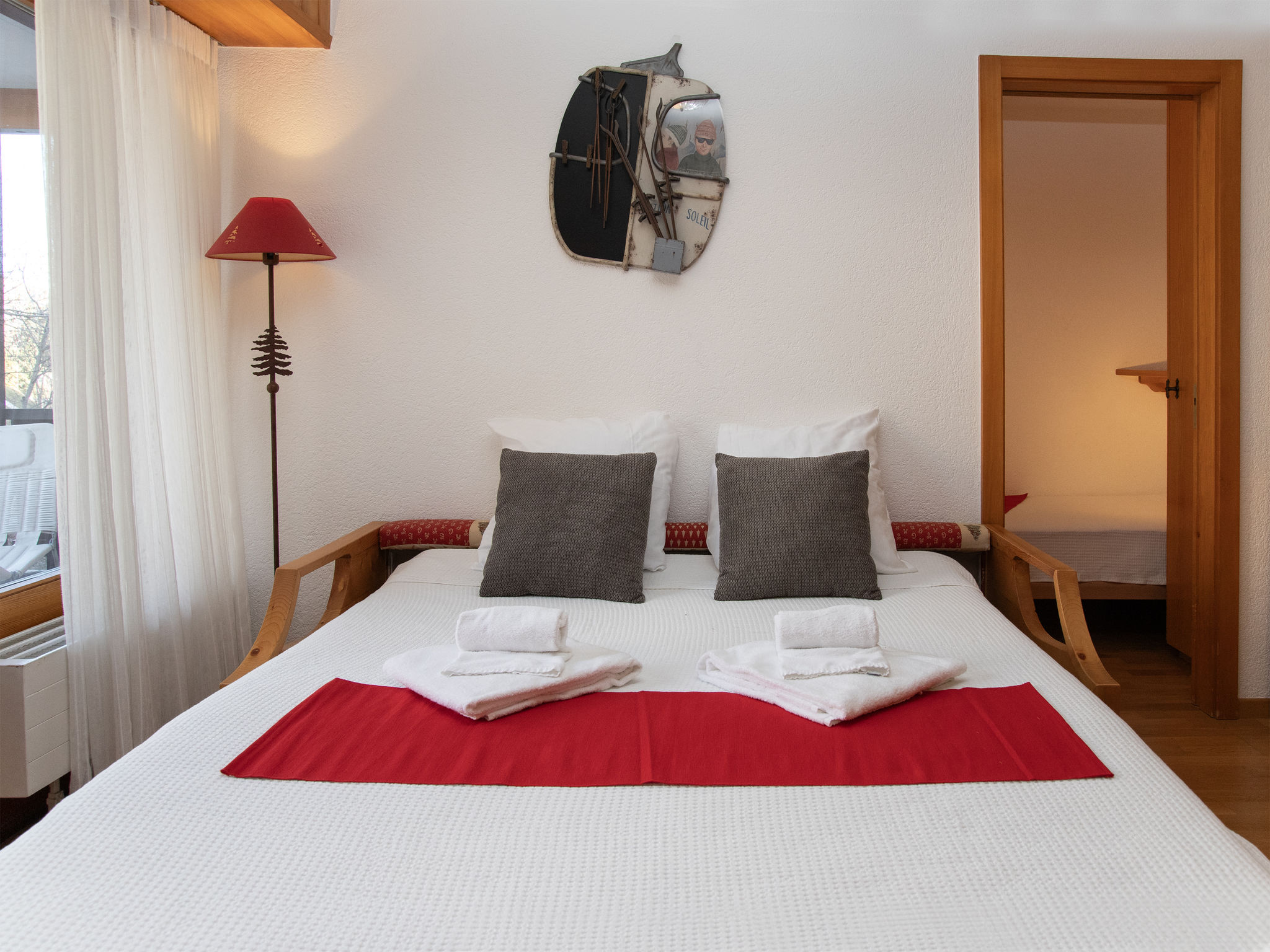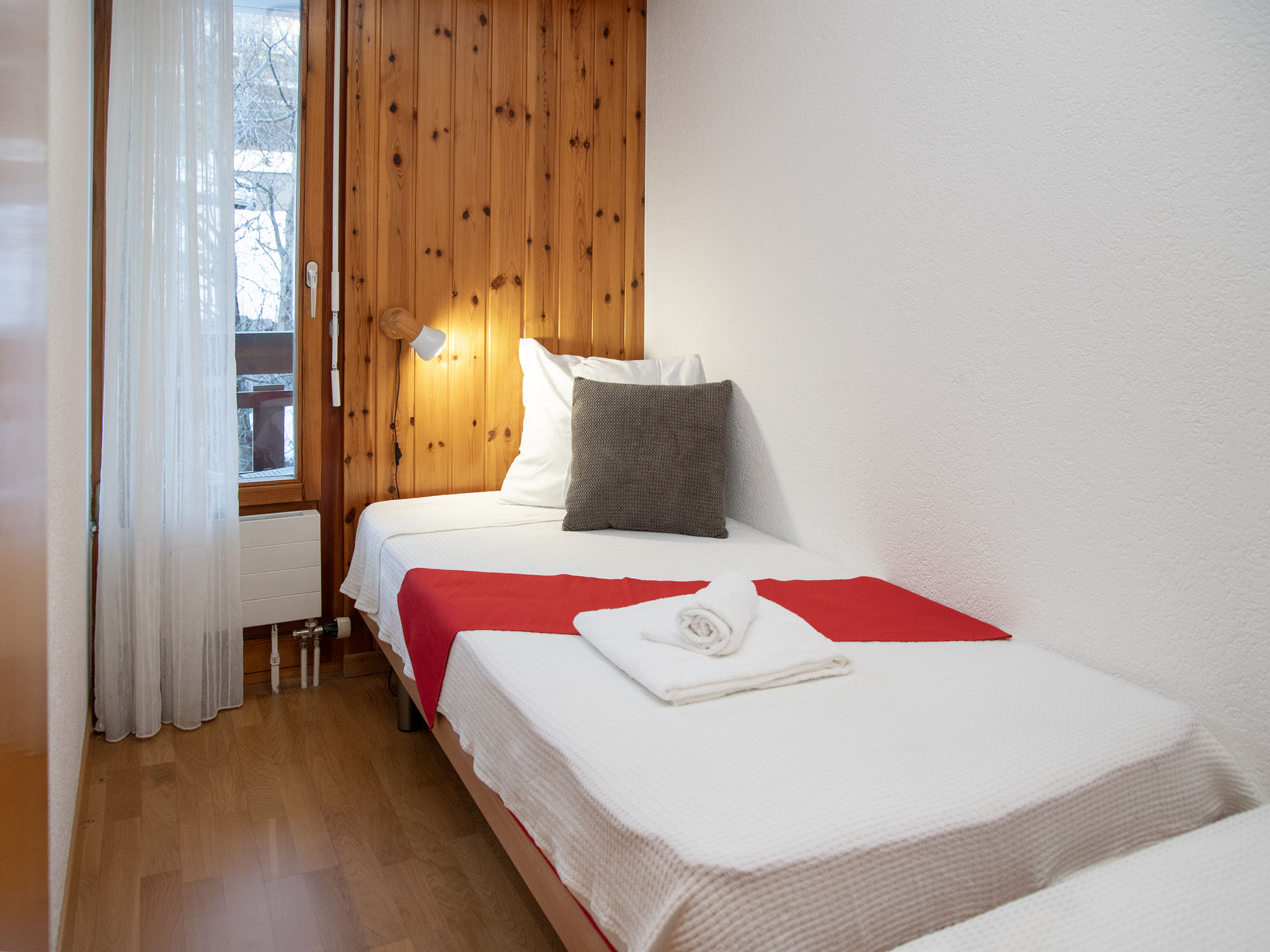 "Eaux-Vives 205", 2-Zimmer-Wohnung 42 m2 im 2. Stock, Nordlage. Objekt geeignet für 2 Erwachsene + 2 Kinder. Zweckmässig und komfortabel eingerichtet: Wohn-/Esszimmer mit 1 Diwanbett (160 cm, Länge 190 cm). 1 kleines Zimmer mit 2 Betten (90 cm, Länge 180 cm). Kleine Kochnische (4 Kochplatten, Toaster, Wasserkocher) mit Esstisch und Kabel-TV. Dusche/WC. Kleiner Balkon, Nordlage. Terrassenmöbel. Sicht auf die Ortschaft. Zur Verfügung: Haartrockner. Internet (WLAN). Garage Nr. 205 (1 Auto). Bitte beachten: geeignet für Familien. Nichtraucher-Unterkunft.