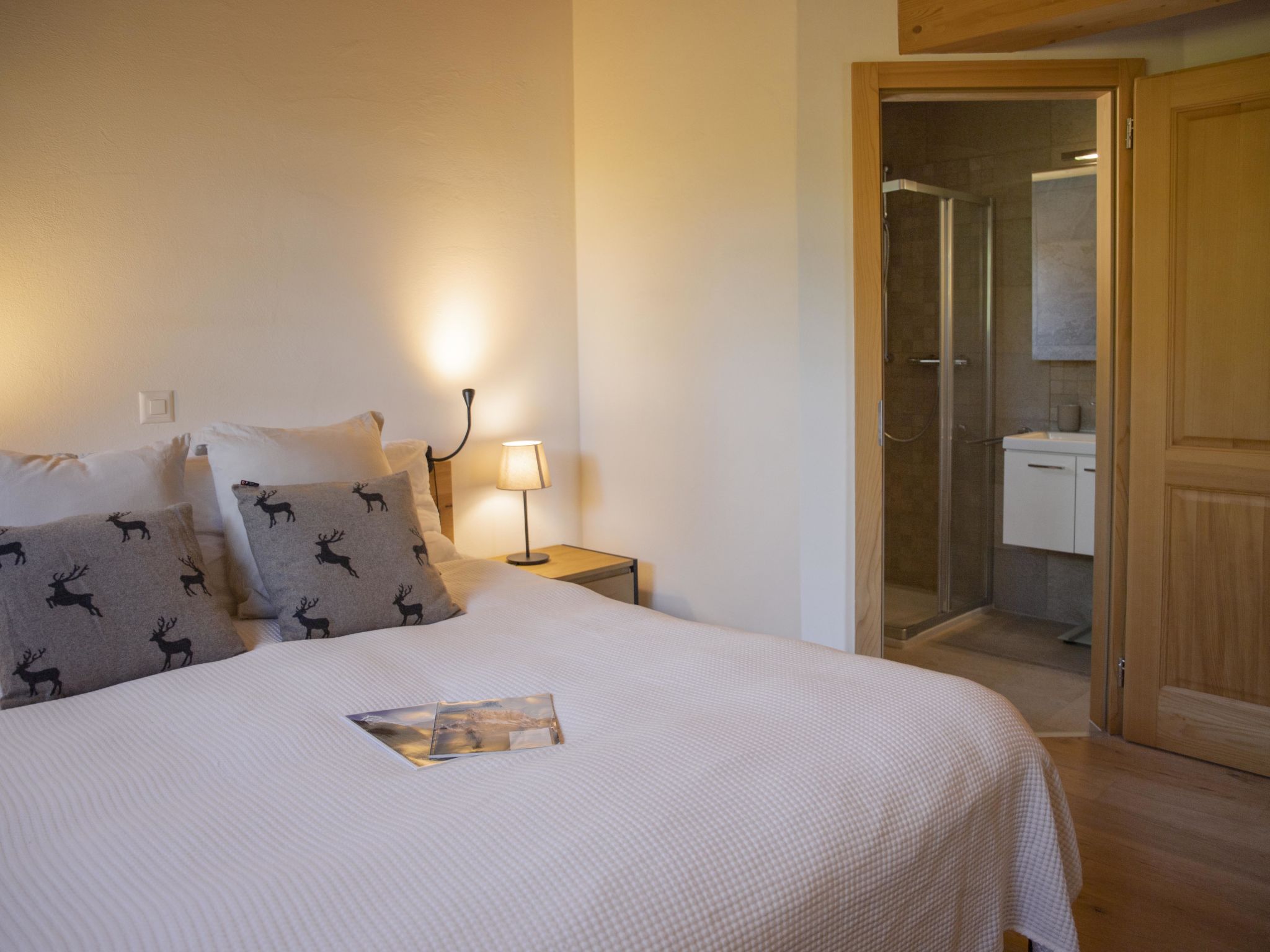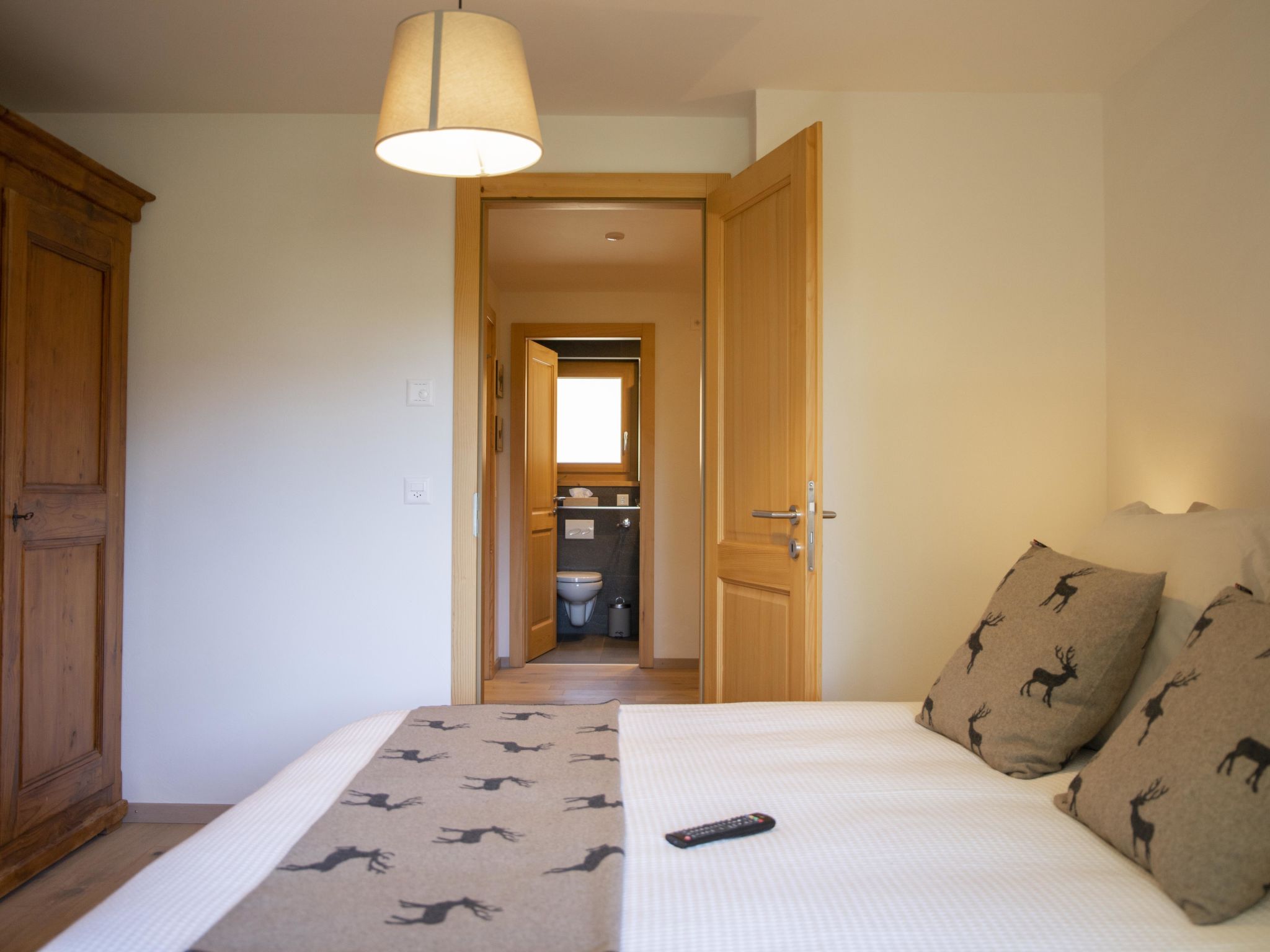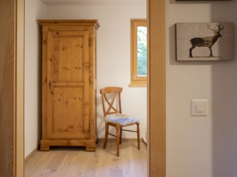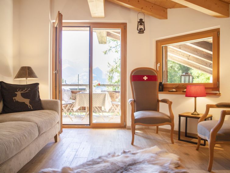 "Chalet Sans Soucis", 4-Zimmer-Wohnung 74 m2 auf 2 Stockwerken im 1. Stock, Südlage. Renoviert im Jahre 2020, komfortabel und geschmackvoll eingerichtet: 1 Zimmer mit 1 franz. Bett (1 x 160 cm). Ausgang zum Balkon, Richtung Süden. 1 Zimmer mit 2 Betten (90 cm). Bad/WC, Whirlbadewanne. Obergeschoss: kleines Wohn-/Esszimmer mit Esstisch. Ausgang zum Balkon, Richtung Süden. 1 Zimmer, ohne Schrank mit 1 Doppelbett (2 x 90 cm), Dusche/WC. Offene Küche (Backofen, Geschirrspüler, 4 Glaskeramikplatten, Tiefkühler, elektrische Kaffeemaschine, Kapseln für die Kaffeemaschine (Nespresso) extra). 2 kleine Balkone 10 m2, Südlage. Balkonmöbel, Gartengrill. Eingeschränkte Sicht auf die Berge. Zur Verfügung: Waschmaschine, Wäschetrockner. Internet (Wireless LAN, gratis). Parkplatz Nr. 10 et 11 (eingezäunt, 2 Autos). Bitte beachten: Nichtraucher-Unterkunft. Kein Fahrstuhl.