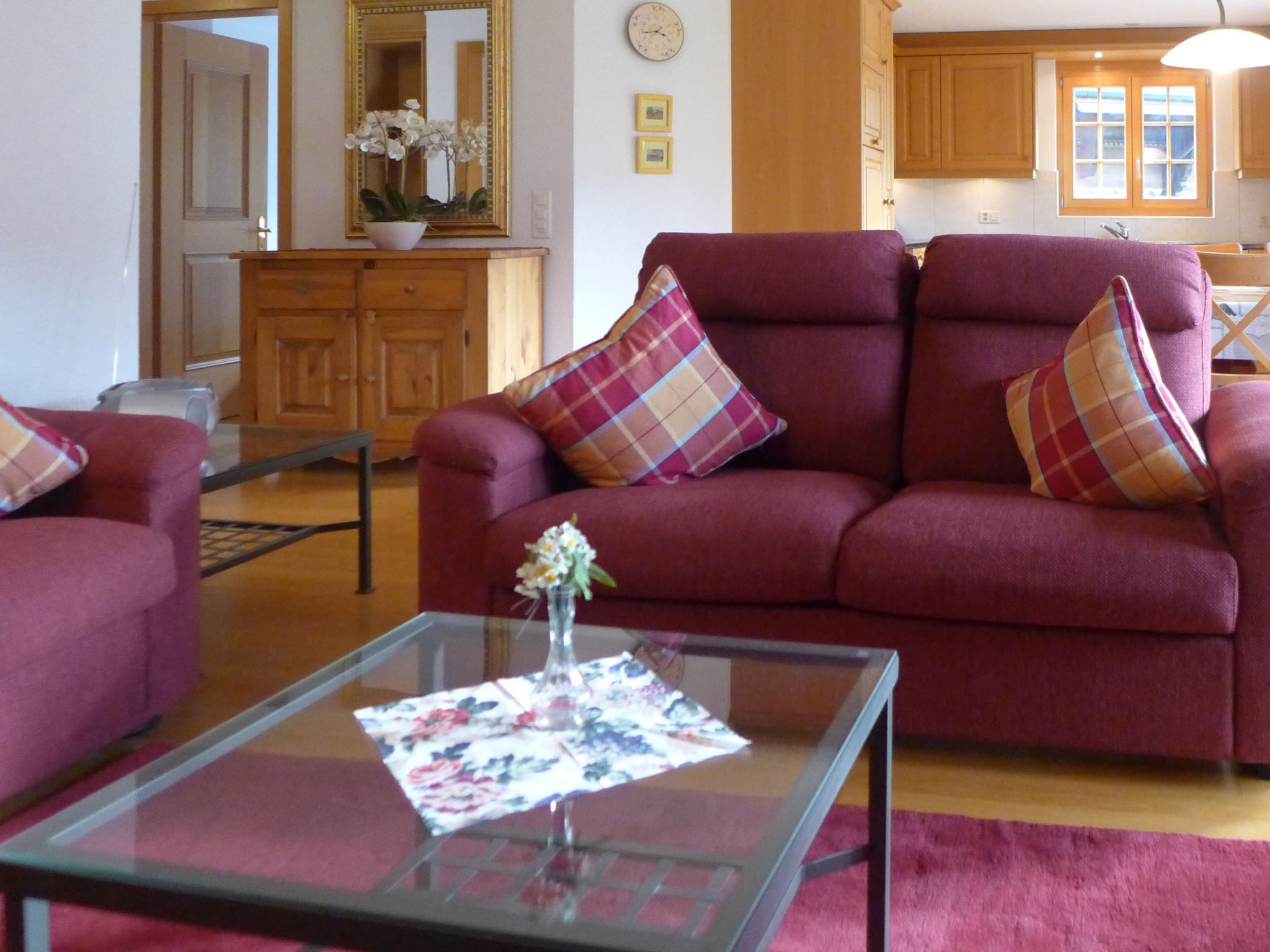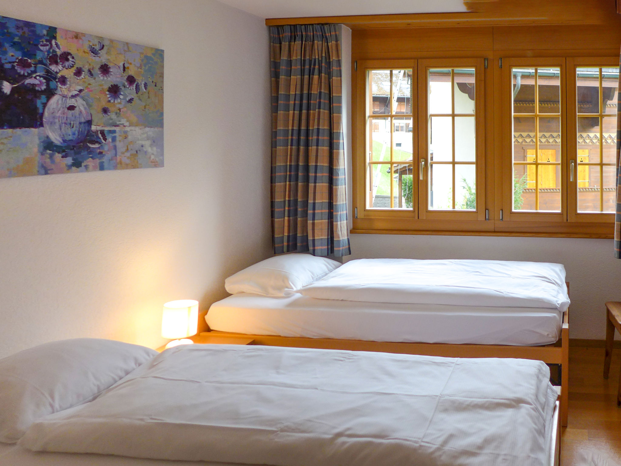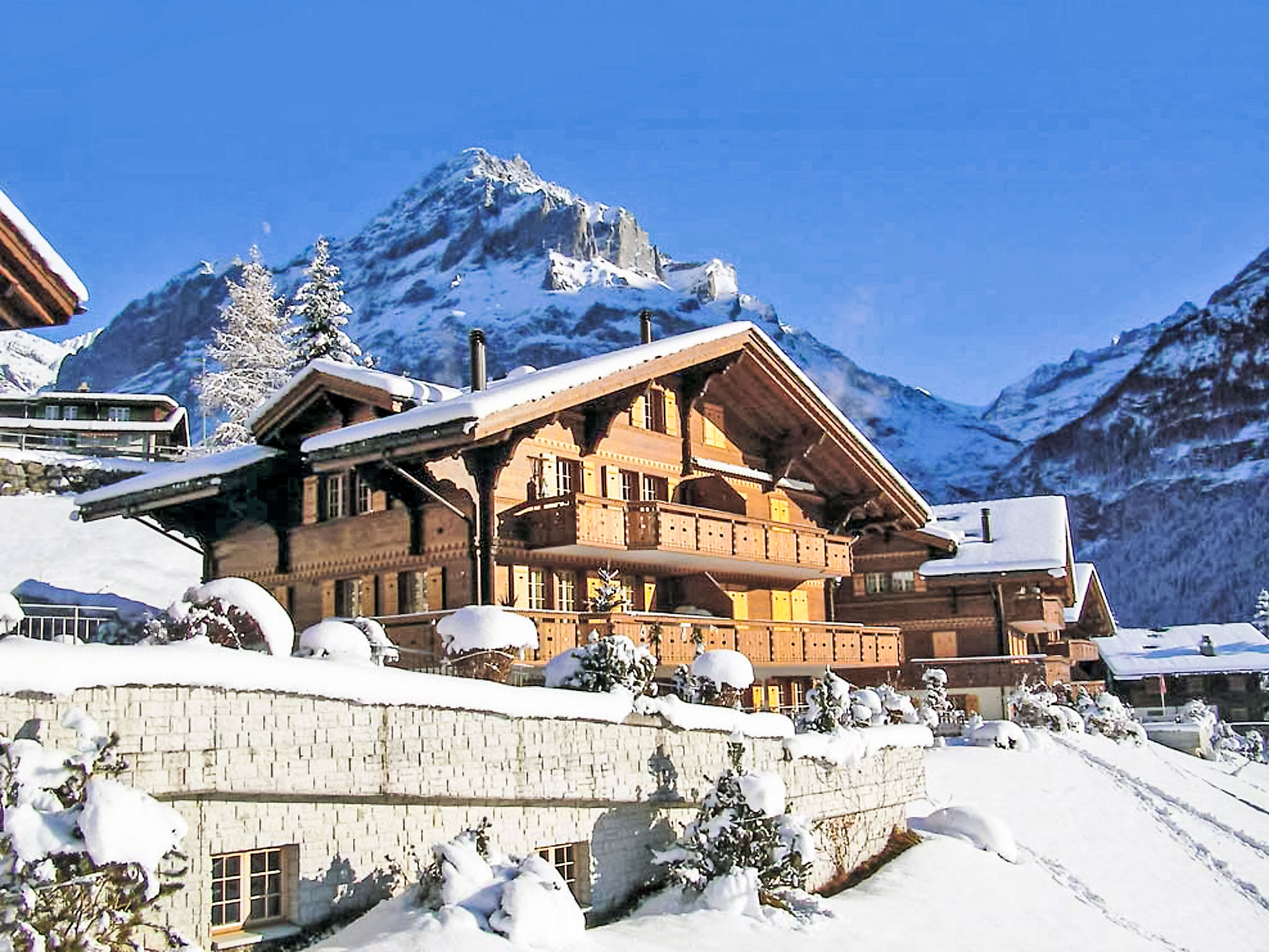 3-Zimmer-Wohnung 80 m2 im 1. Stock, Südwestlage. Hell, schön und gemütlich eingerichtet: Wohn-/Esszimmer mit offenem Kamin, Internationale TV-Sender, Flachbildschirm, Radio und CD. Ausgang zum Balkon, Richtung Süden und Richtung Westen. 1 Zimmer mit 2 Betten (90 cm, Länge 200 cm), Dusche/WC. 1 Zimmer mit 1 Bett (160 cm, Länge 200 cm). Offene Küche (Backofen, Geschirrspüler, 4 Glaskeramikplatten, Toaster, Wasserkocher, Mikrowelle, elektrische Kaffeemaschine, Kapseln für die Kaffeemaschine (Nespresso) extra, Racletteofen, Fondue Set (Käse)). Bad/WC. Fussbodenheizung. Parkettboden, Natursteinboden. Grosser Balkon 24 m2, Südlage und Westlage. Balkonmöbel. Herrliche Sicht auf die Berge und Eigernordwand. Zur Verfügung: Haartrockner, Holz (extra). Internet (Wireless LAN, gratis). Parkplatz Nr. 6 & 7. Bitte beachten: Nichtraucher-Unterkunft. Feuerlöscher.