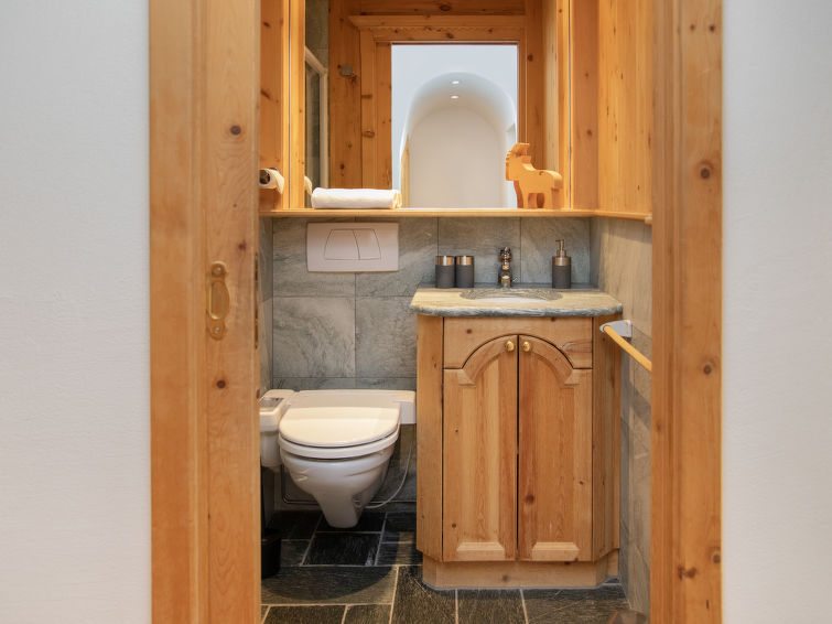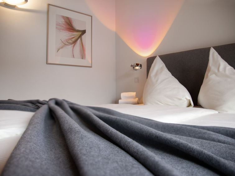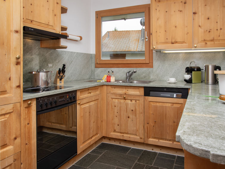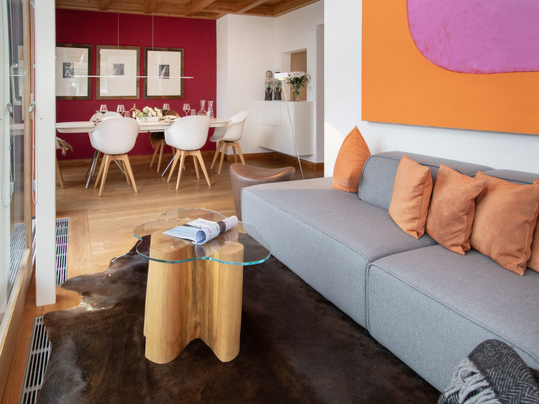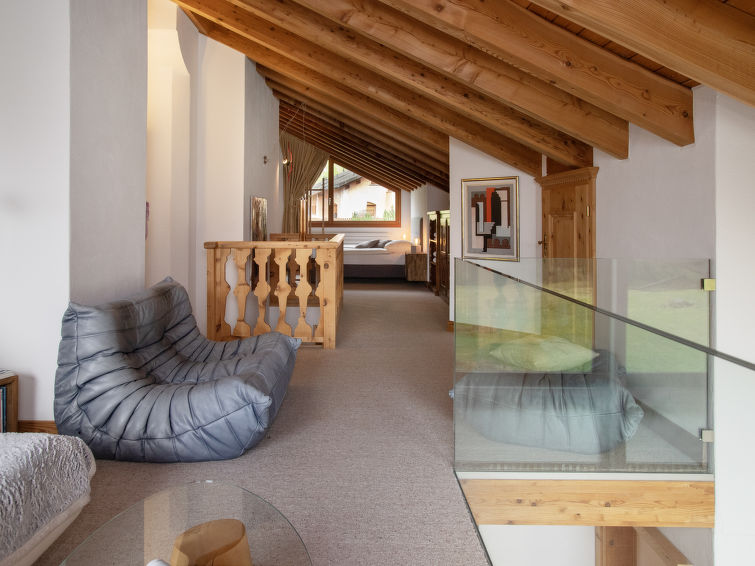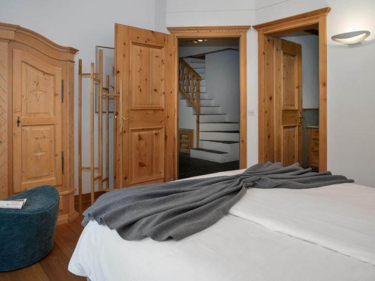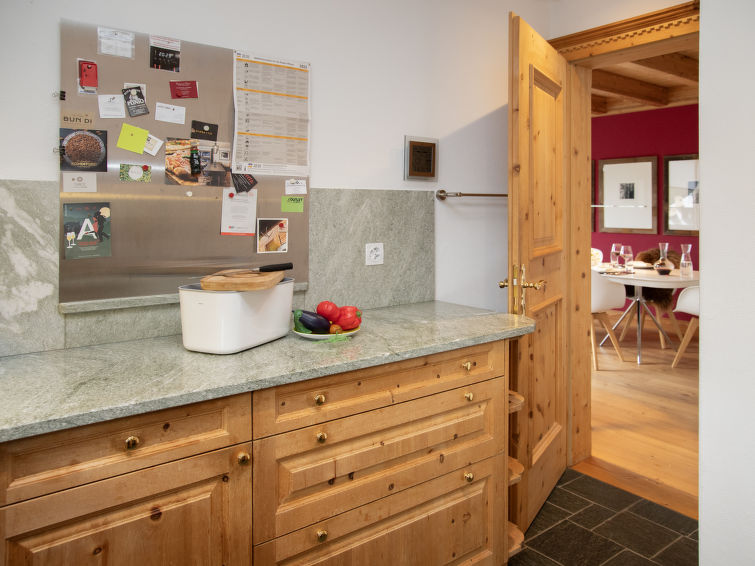 "Chesa Vadret 12", 3-Zimmer-Wohnung 110 m2 auf 2 Stockwerken, im Dachgeschoss. Geräumig und hell, teilweise abgeschrägt, komfortabel und modern eingerichtet: offenes Wohn-/Esszimmer. Ausgang Richtung Westen. 1 Zimmer mit 1 franz. Bett (1 x 160 cm, Länge 200 cm), Bad/Bidet/WC. Küche (Backofen, Geschirrspüler, 4 Glaskeramikplatten, Toaster, Wasserkocher, elektrische Kaffeemaschine, Kapseln für die Kaffeemaschine (Nespresso) extra, Fondue Set (Käse)). Dusche/WC. Heizung. Obergeschoss: offene grosse Galerie mit 1 franz. Bett (2 x 80 cm, Länge 200 cm). Offenes Durchgangszimmer mit TV. Grosser Balkon 10 m2. Balkonmöbel. Herrliche Panoramasicht auf die Berge und das Tal. Zur Verfügung: Bügeleisen, Haartrockner. Internet (WLAN, gratis). Garage Nr. Vadret 12, Höhe 225 cm, Breite 250 cm. Bitte beachten: nicht geeignet für Kinder unter 6 Jahren. Nichtraucher-Unterkunft. Anstelle eines abgeschlossenen Schlafzimmers befinden sich manche Schlafplätze in einem offenen Bereich (Galerie, Nische etc.).