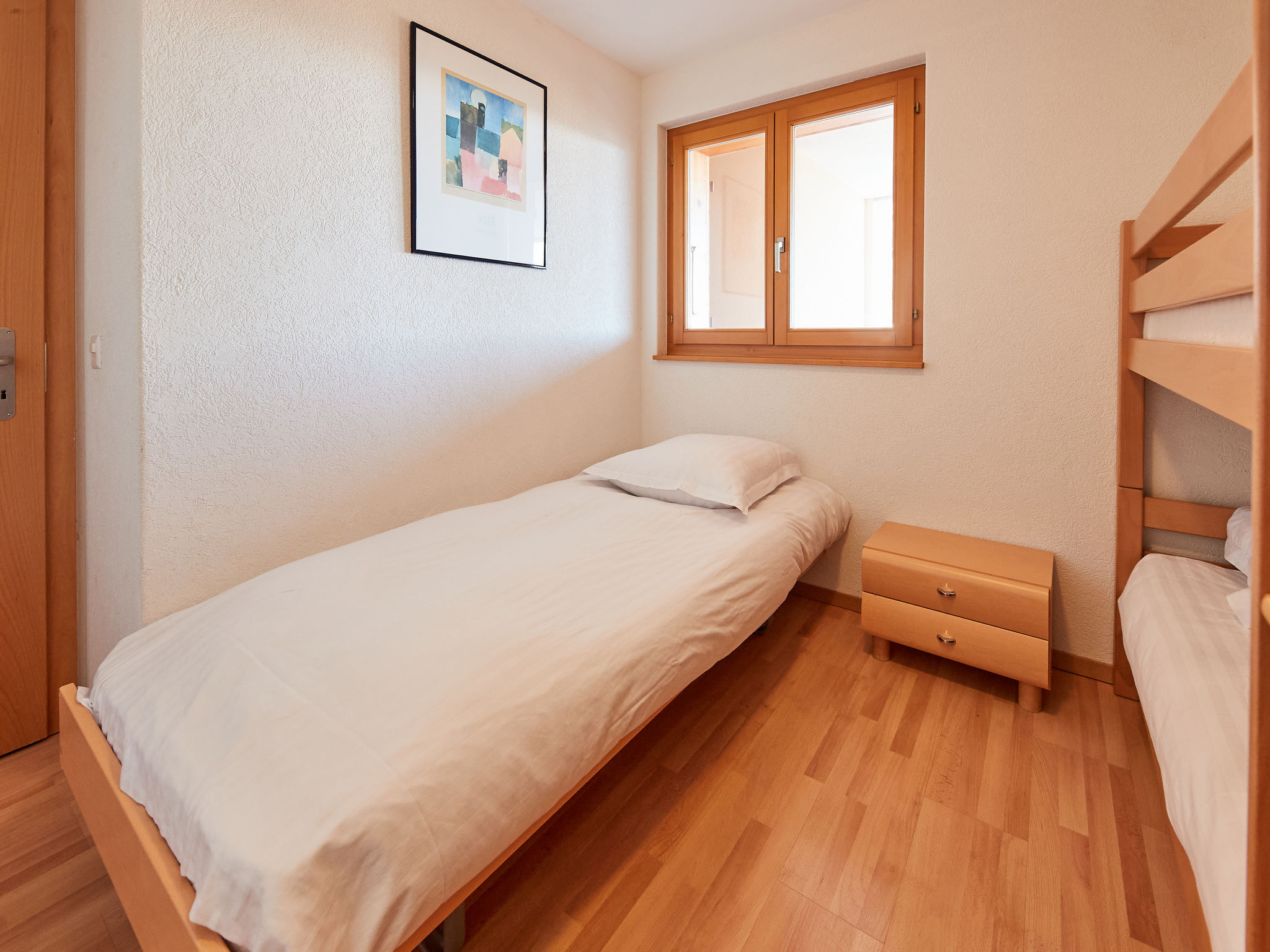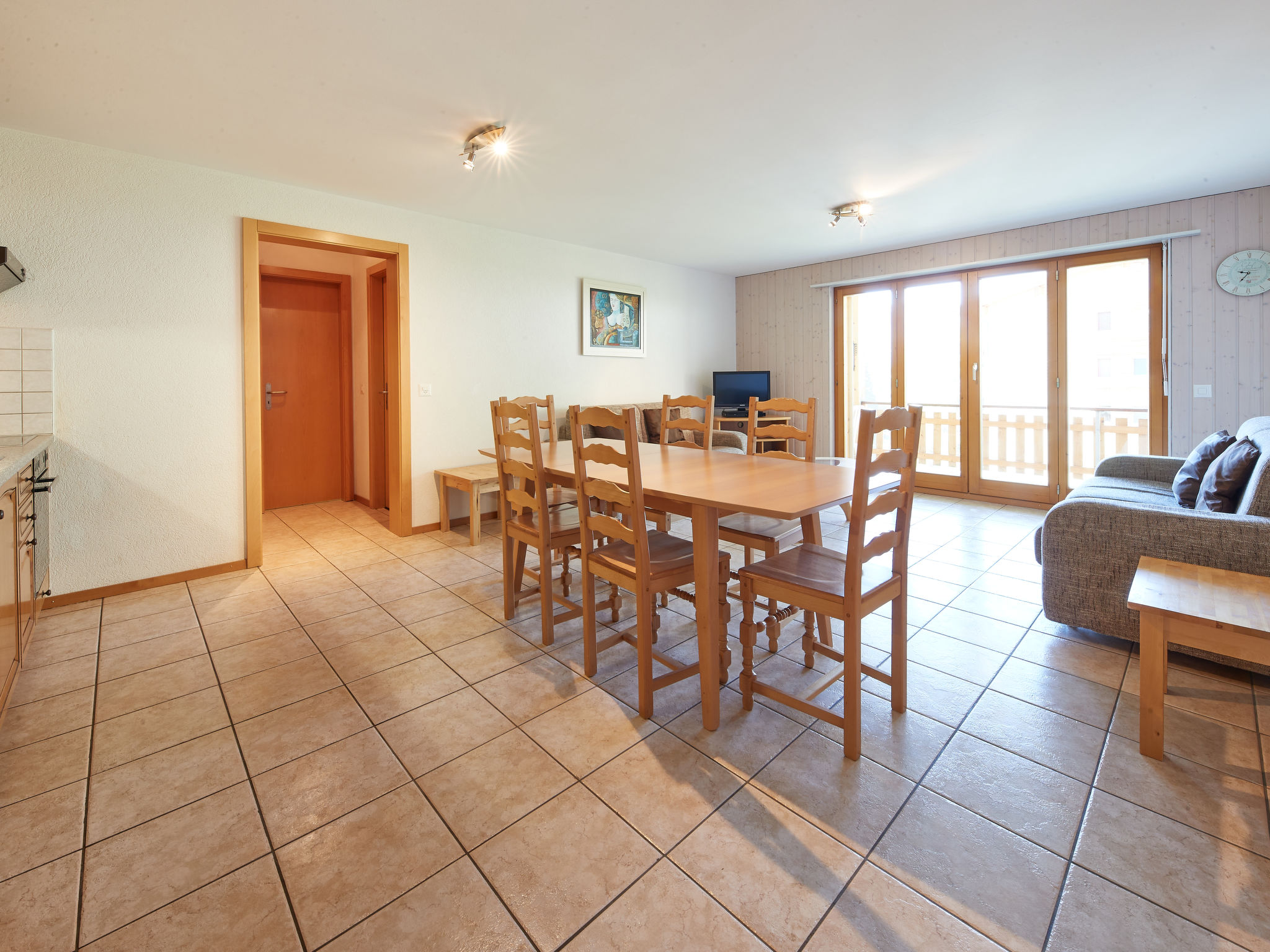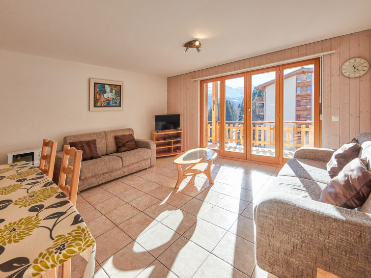 "Sérandes 18", 3-Zimmer-Wohnung 70 m2, unteres Geschoss. Komfortabel und gemütlich eingerichtet: Wohn-/Esszimmer mit 1 Diwanbett (140 cm, Länge 190 cm), TV. Ausgang zum Balkon, Richtung Süden. 1 Zimmer mit 1 Doppelbett (160 cm, Länge 200 cm). 1 Zimmer mit 1 Bett (90 cm, Länge 190 cm), 1 x 2 Etagenbetten (90 cm, Länge 190 cm). Offene Küche (Backofen, 4 Glaskeramikplatten, Toaster, Wasserkocher, Mikrowelle, elektrische Kaffeemaschine, Kapseln für die Kaffeemaschine (Filtre), Fondue Set (Käse)). 2 Duschen/WC. Balkon, Südlage. Balkonmöbel. Zur Verfügung: Internet (Wireless LAN). Bitte beachten: Nichtraucher-Unterkunft.