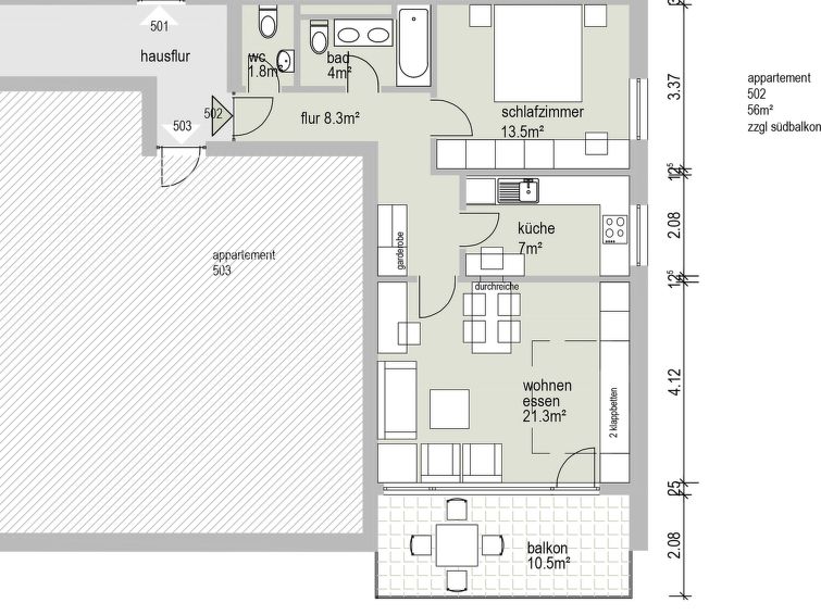 2-Zimmer-Wohnung 65 m2 im 5. Stock, Südostlage. Komfortabel und rustikal eingerichtet: Wohn-/Esszimmer mit 2 Wandschrankbetten und Kabel-TV (Flachbildschirm), Radio. Ausgang zum Balkon. 1 Zimmer mit 2 Betten. Küche (Backofen, Geschirrspüler, 4 Glaskeramikplatten). Bad/WC, sep. WC. Balkon 7 m2. Schöne Sicht auf die Berge, die Landschaft und die Ortschaft. Zur Verfügung: Internet (WLAN, gratis). Parkplatz. Bitte beachten: Nichtraucher-Unterkunft. 11414