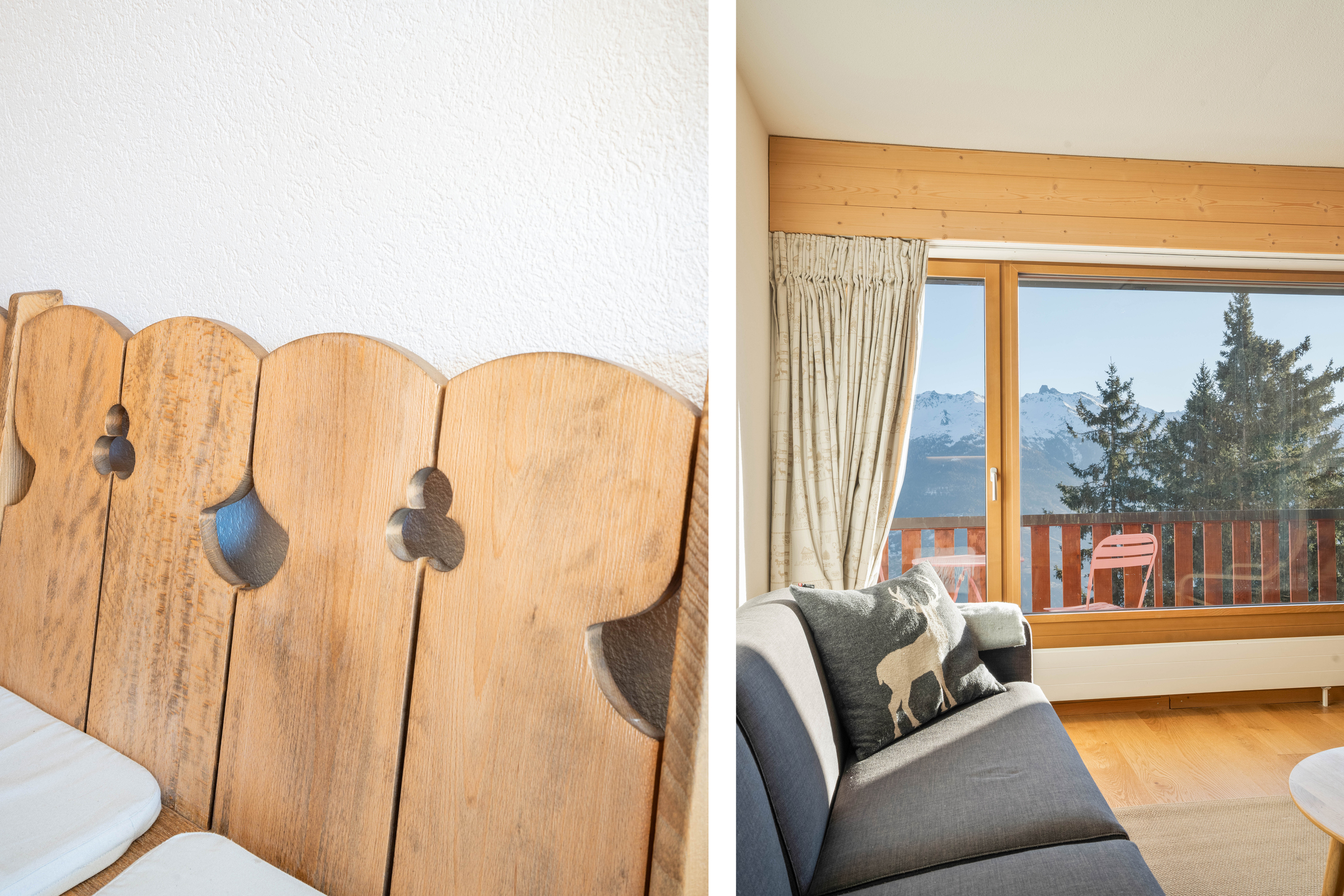 Das Wohngebäude "le Hameau" befindet sich auf der zweiten Ebene der Station Les Collons, in der Nähe des Skilifts La Joc, einer Rodel- und Anfängerpiste, der Skischule, von Geschäften und Restaurants. Das Gebäude genießt eine ruhige Lage. Es ist nach Osten ausgerichtet. Das Schwimmbad, die Sauna, das Spielzimmer, die Skischränke und die Waschküche des Wohnheims stehen allen Mietern zur Verfügung. Renovierte 2 Zimmerwohnung für 4 Personen befindet sich im Erdgeschoss des Gebäudes le Hameau A in Les Collons. Es verfügt über eine offene Küche: 4 Glaskeramikkochfelder, einen Ofen, einen grossen Kühlschrank (mit Gefrierteil) und einen Geschirrspüler. Das Wohnzimmer besteht mit TV, einem grössen Sofa und einer Essecke. Schlafzimmer mit ein Doppelbett (2x 0.90 X 1.90) und einem Etagenbett (2x 0.90 X 1.90).Badezimmer: WC, Waschbecken und Badewanne. Balkon auf der Ostseite mit Gartenmöbeln und Blick auf den Wald und das Val d'Hérens. Wohnung OHNE Teppichboden. Haustiere NICHT erlaubt.